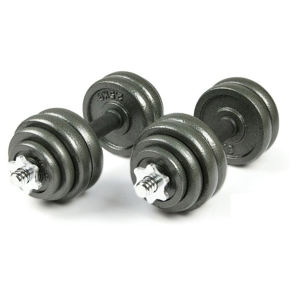 Комплектация - 2 грифа диаметром 26 мм, длиной 35 см (длина резьбы 11 см с каждой стороны) и весом 1,35 кг- 4 зажима, которые обеспечивают точные нагрузки давления- 4 диска х 0,5 кг (диаметр 9,0см, ширина 1,4 см)- 4 диска х 1,25 кг (диаметр 12 см, ширина 1,8 см)- 8 дисков х 2,5 кг (диаметр 14,5 см, ширина 2,2 см)