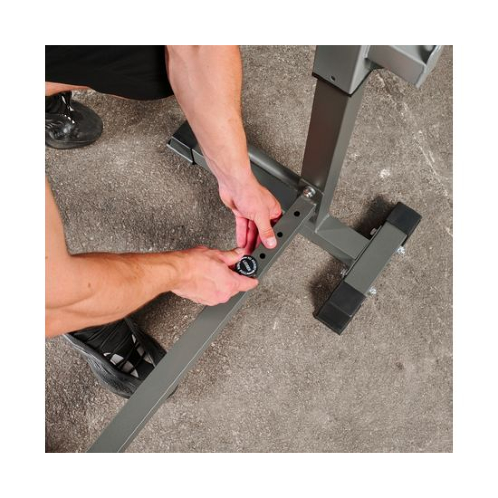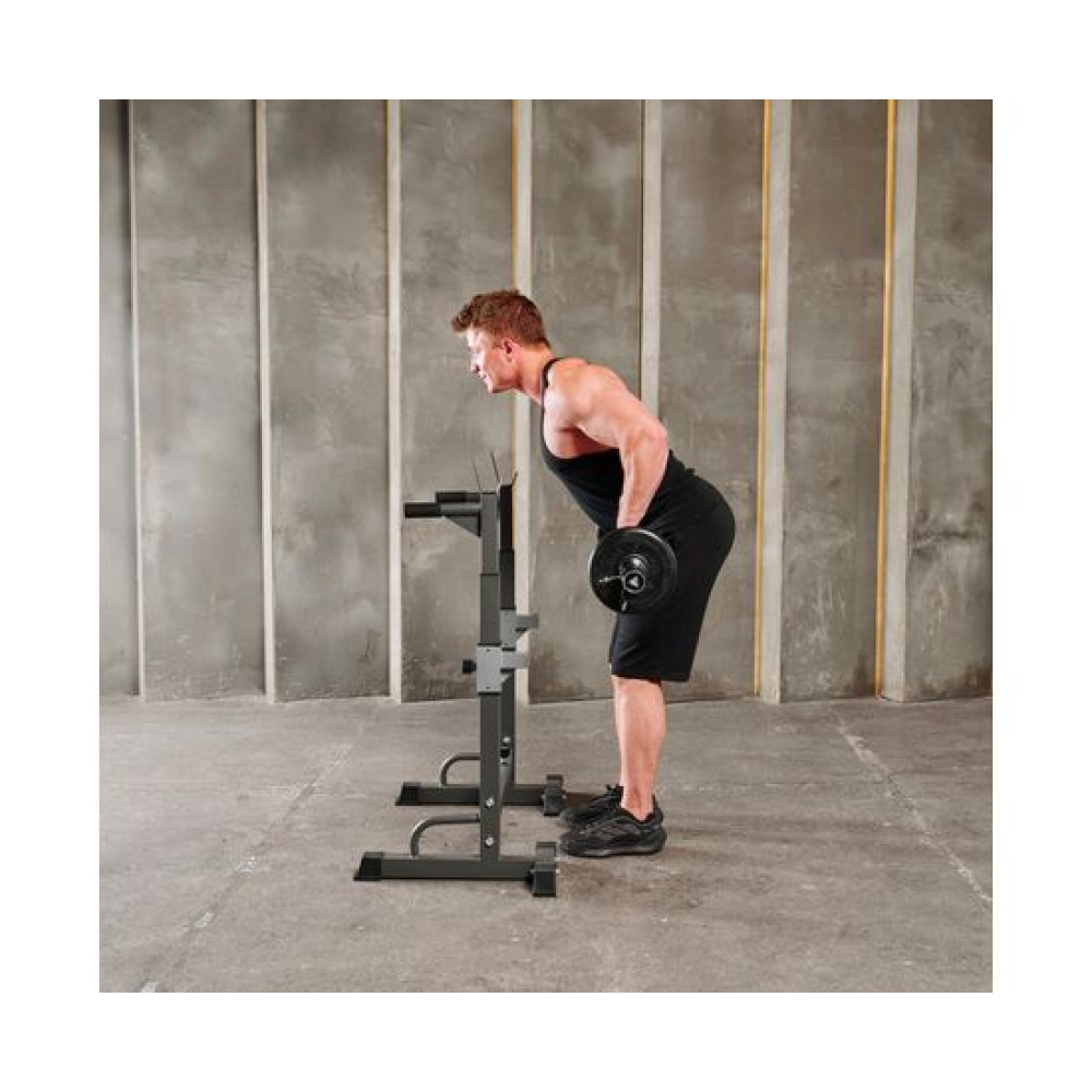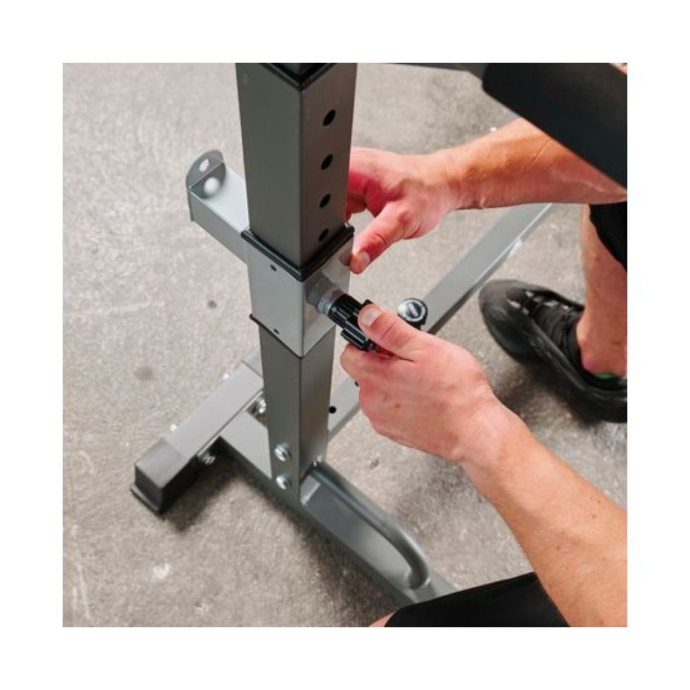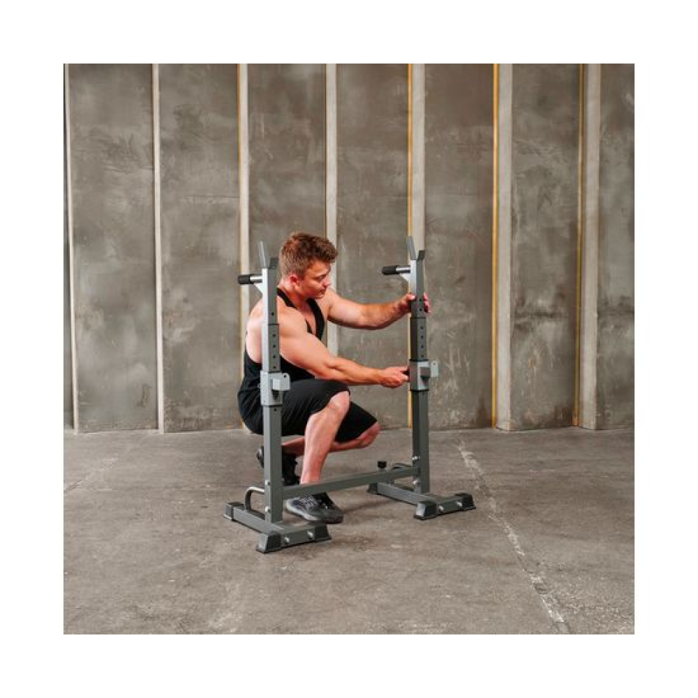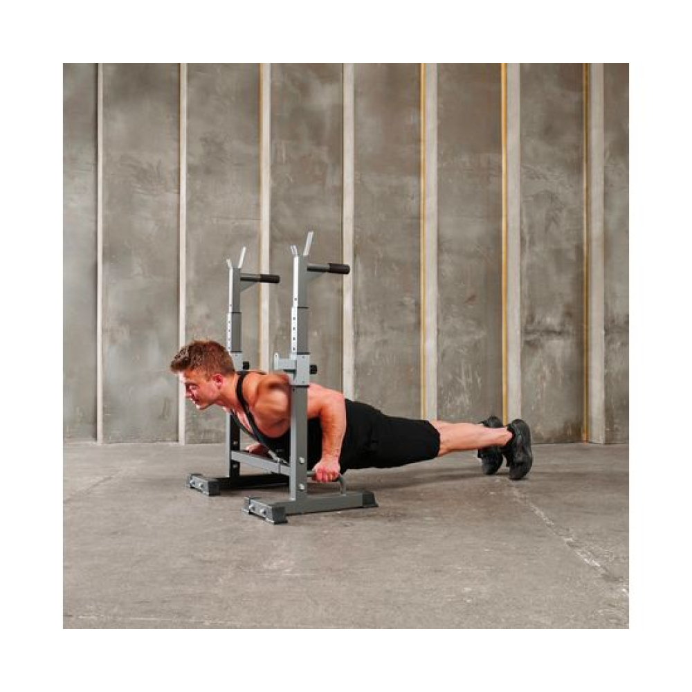 Многофункциональная стойка для домашнего спортзала. Подходит для выполнения полного спектра упражнений со штангой: от приседания и становой тяги до жима лежа. Приятное дополнение – стойки для отжиманий от пола.Устойчивое основание из высокопрочной профильной трубы выдерживает нагрузку до 100 кг. Подвижный держатель подойдет для весов до 50 кг.Высота брусьев и ширина стойки легко регулируется без дополнительных инструментов. 12 уровней на верхних ручках и 8 уровней - на нижних. Внутренняя ширина регулируется в диапазоне от 54 до 99 см.