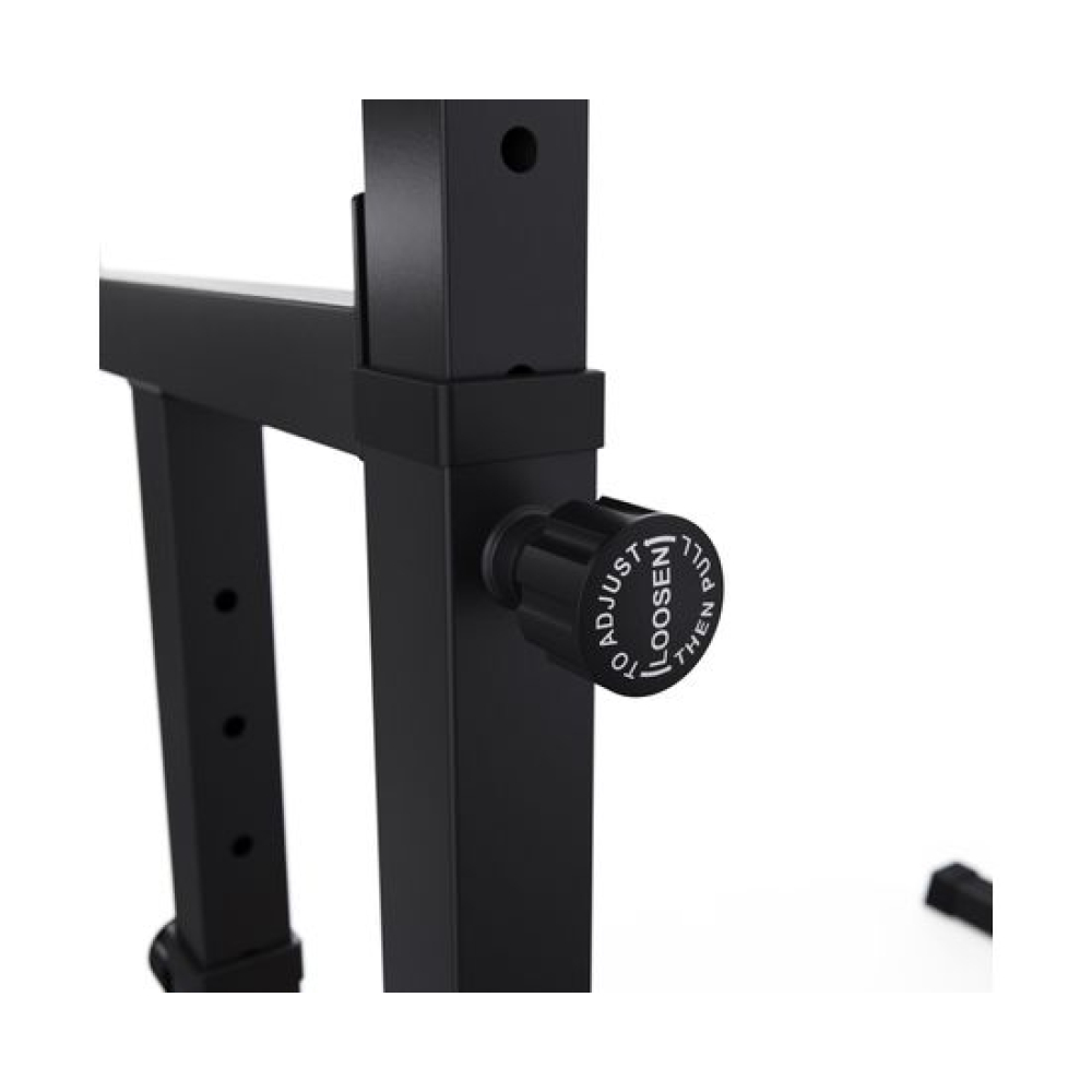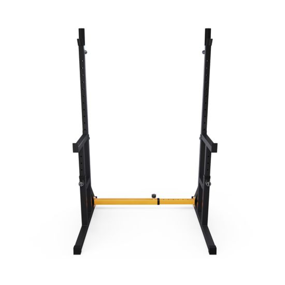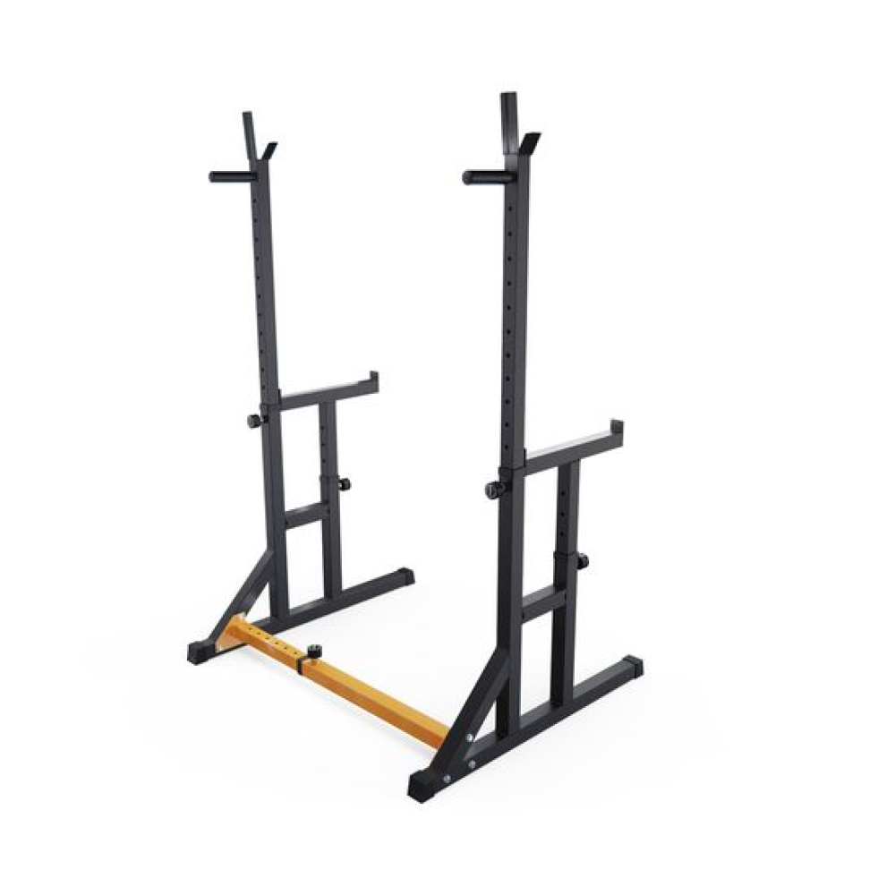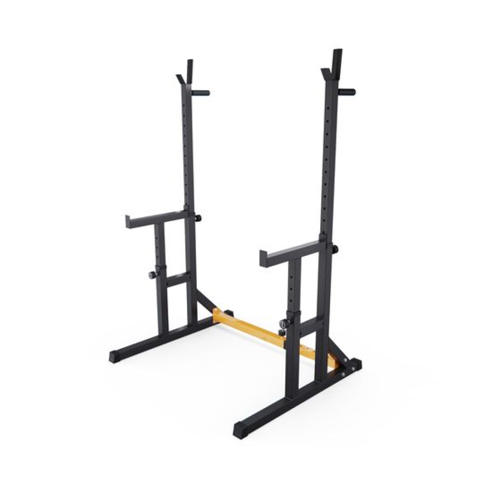 Стойка для штанги с подстраховкой DFC Y-GYM TF-63, с упорами для отжиманий - многофункциональная стойка для домашних тренировок. Серия Y-GYM – это тренажеры в современном дизайне, где динамичный желтый цвет гармонично сочетается с элегантным черным. Продуманная геометрия и контрастное цветовое решение позволят тренажеру гармонично вписаться в любую комнату и стать ярким акцентом вашего интерьера. Это идеальное решение для тех, кто ценит функциональность и эстетику в каждой детали своего дома.Устойчивое основание стойки для приседаний из высокопрочной профильной трубы 50 х 45 х 1,5 мм выдерживает динамическую нагрузку до 200 кг (динамическая нагрузка – нагрузка на элементы конструкции в движении). Подходит для выполнения полного спектра упражнений со штангой: от приседаний и становой тяги до жима лежа. Нескользящие упоры для отжиманий помогут разнообразить ваши тренировки.Высота держателей под штангу легко регулируется без дополнительных инструментов при помощи ручки. Держатели под штангу регулируются по высоте на 11 уровней большая в диапазоне от 102 до 162 см и на 5 уровней меньшая в диапазоне от 64 до 88 см.Ширину стойки для жима можно индивидуально настроить от 80 до 113,5 см. Нескользящие ножки надежно устанавливаются на полу и не царапают поверхность.