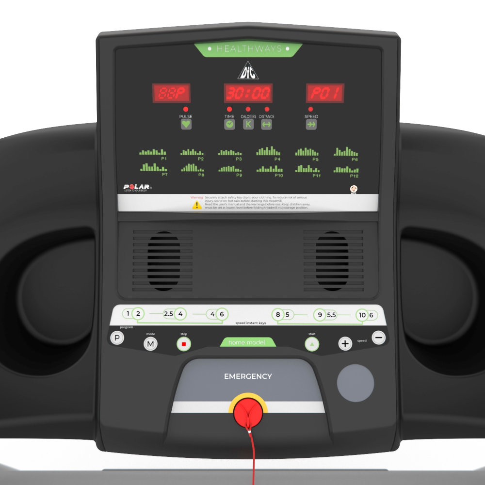 PRIDE PRO – лучшая среди реабилитационных дорожек DFC. Благодаря своей конструкции с поручнями и точечному изменению скорости в 0,1 км/ч, пользователь может заниматься с минимальной нагрузкой на организм. По сравнению с моделью PRIDE, модель PRIDE PRO имеет разъем для подключения телефона, встроенные колонки и приемник POLAR для подключения кардиодатчика. Бег без препятствий Одна из отличительных особенностей дорожки PRIDE — это её беговое полотно, длина которого - 135 см, а ширина - целых 45 см, что делает её самой удобной для занятий из всей линейки реабилитационных дорожек DFC. На длинном и широком полотне даже пользователи с ростом выше 190 см будут чувствовать себя комфортно и устойчиво. Неординарная мощь Мощность двигателя дорожки - 2,5 лошадиные силы, а скорость регулируется от 0,5 до 10 км/ч. Эти характеристики позволят вам не только проводить восстановительные тренировки, но и активные беговые. Всё под рукой Сенсорные датчики пульса и кнопки СТАРТ/СТОП и регулировки скорости находятся прямо на поручнях. Также скорость, программу или значение на дисплее вы можете поменять с консоли. На ней располагаются карманы для бутылок, а также подставка под планшет. Функциональный компьютер Светодиодный дисплей размером 3” отображает пульс, время, калории, расстояние и скорость. Для тренировок предусмотрено 12 встроенных программ, 2 ручных режима, 3 пользовательских и тест на полноту. Мультимедиа Используйте разъём MP3 и 2 динамика для проигрывания музыки или просмотра фильмов прямо во время тренировки. Наушники больше не понадобятся! Встроенный приёмник Polar позволит подключиться к кардиодатчику для считывания показателей пульса и частоты сердцебиения.