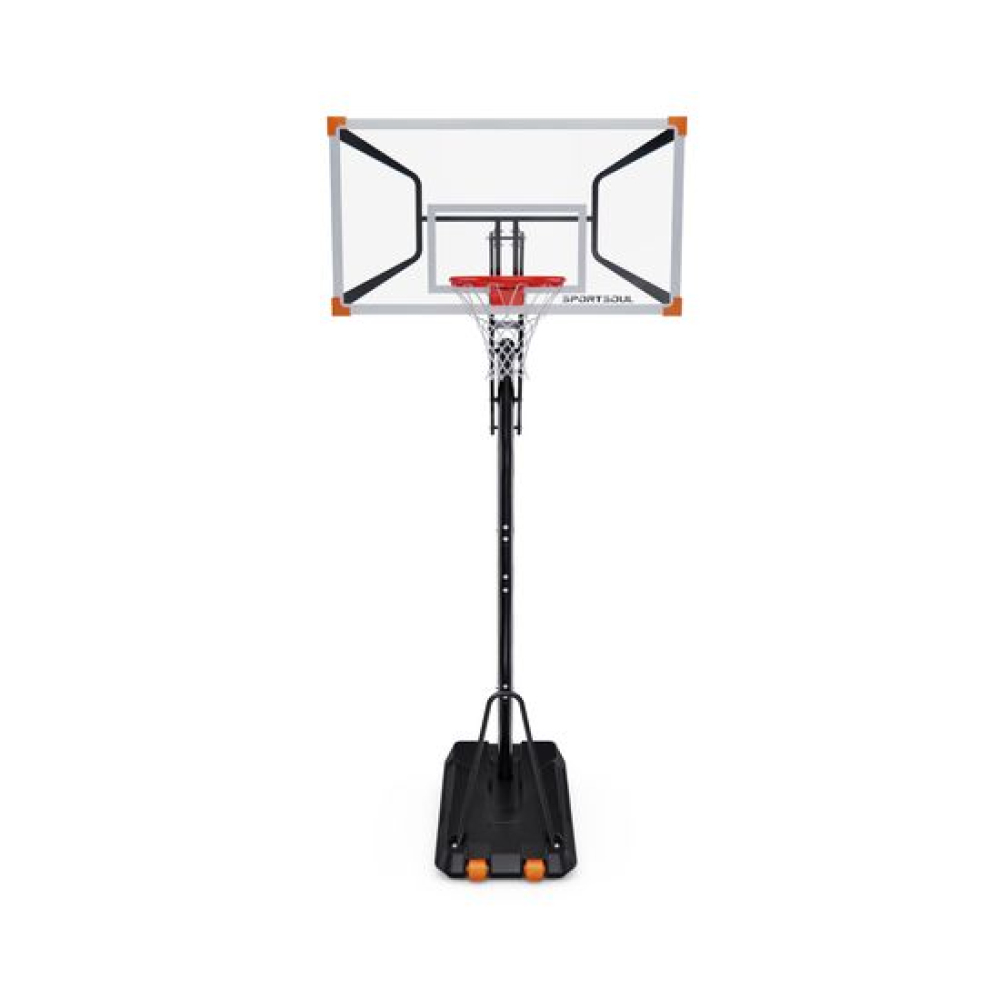Мобильная баскетбольная стойка DFC SPORTSOUL 54’’– это оборудование среднего уровня, которое отлично подойдет новичкам и любителям. Щит стойки изготовлен из поликарбоната, благодаря чему достигается оптимальный отскок мяча. Стойка комплектуется кольцом с амортизацией.Баскетбольный щит легко и быстро регулируется по высоте в диапазоне от 230 до 305 см по кольцу с помощью ручки. Баскетбольная мобильная стойка DFC SPORTSOUL имеет размерность щита 54 дюйма (54’’).Портативная конструкция с транспортировочными роликами позволяет создать собственную баскетбольную площадку так, как надо именно вам. Основание стойки имеет увеличенный объем. В основание стойки необходимо залить воду (ёмкость бака 128 л.) или засыпать песок (182 кг) в качестве утяжелителя.