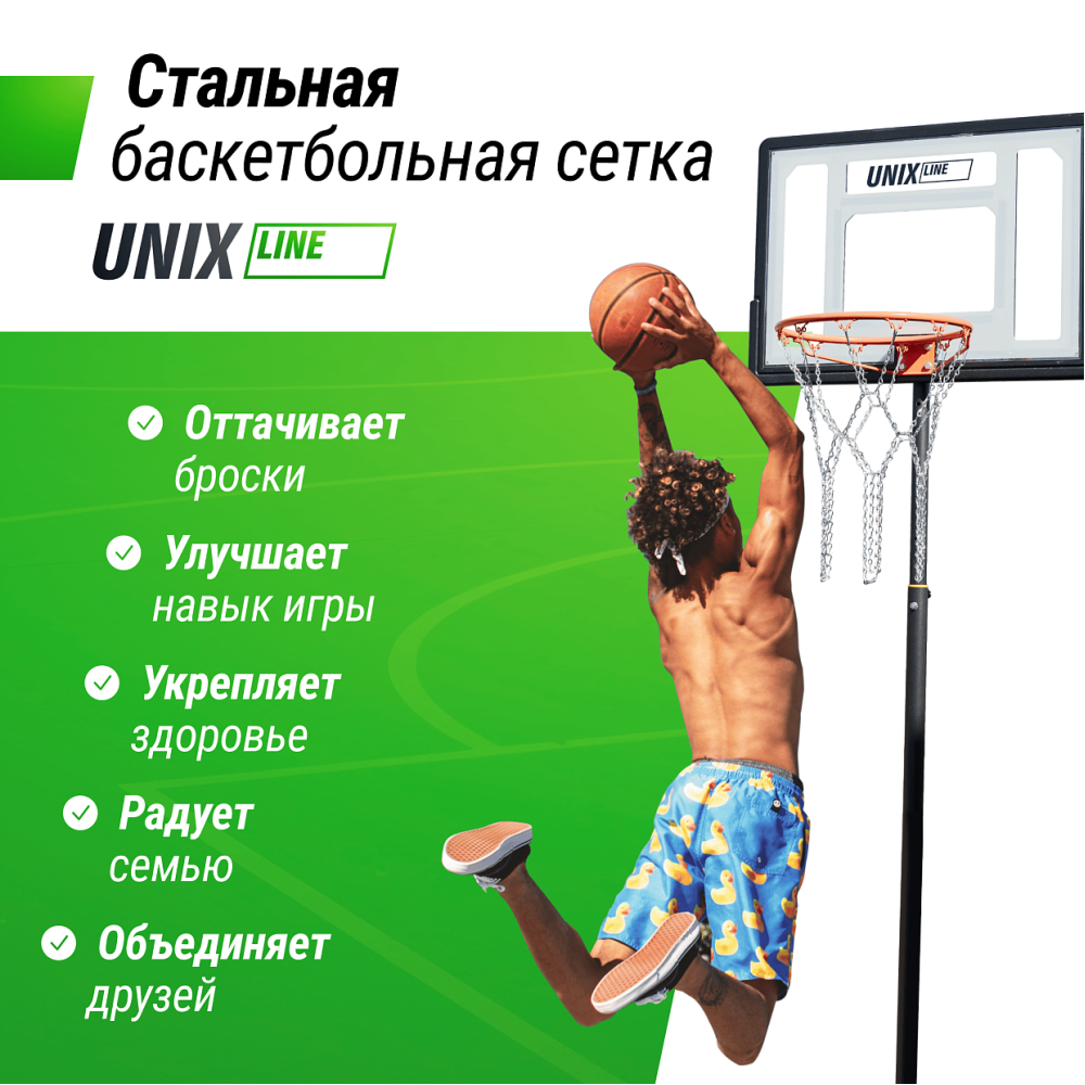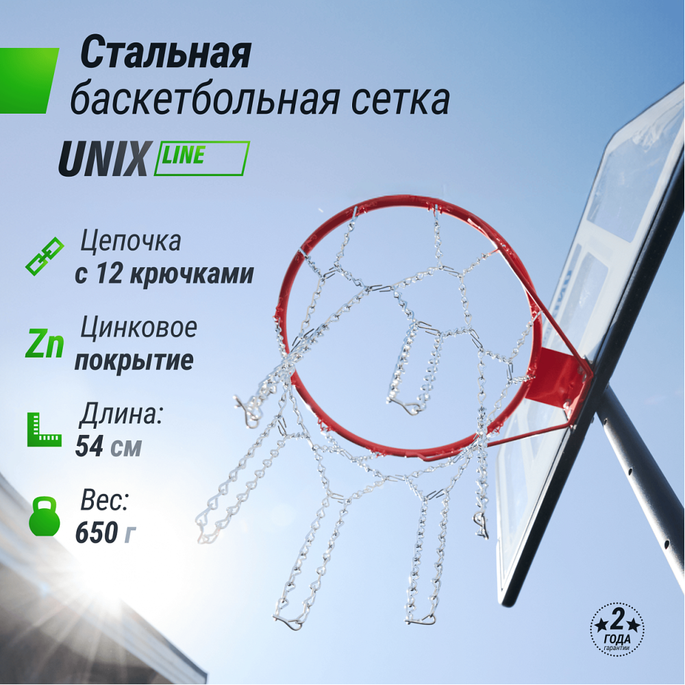 Металлическая баскетбольная сетка UNIX Line это самый надежный вариант сетки для баскетбольного кольца. Железная сетка не только помогает зафиксировать момент попадания мяча в корзину, но и придает вашему игровому пространству стильный, брутальный и профессиональный вид.. Антивандальная баскетбольная сетка UNIX Line B-Net L54 выполнена из оцинкованной стали с 12 крючками. Ее легко можно установить в баскетбольное кольцо. Сетка длиной 54 см на 12 посадочных мест рассчитана на длительную и интенсивную эксплуатацию в любых погодных условиях . Баскетбольная сетка обладает прочной конструкцией, способной выдерживать интенсивное использование и различные погодные условия. Вы можете наслаждаться игрой в баскетбол в любое время года, не беспокоясь о сохранности сетки в осенне-зимний период. Антивандальная сетка также станет отличным выбором для установки в парках или в спортивных залах. Прочные стальные цепи не порвутся и не будут требовать частой замены в отличие от тканевых сеток. . Металлическая сетка легко устанавливается и подходит для большинства стандартных баскетбольных креплений. Сетки на баскетбольные кольца от UNIX Line предназначены для тех, кто ценит качество, надежность и стиль. Уличная металлическая сетка минимизирует время и затраты на обслуживание баскетбольного оборудования и обеспечит вам удовольствие от игры на долгие годы вперед!. . Такая сетка станет отличным выбором для школ, спортивных площадок, дворов и других общественных мест, где требуется надежное и безопасное оборудование для игры в баскетбол. .