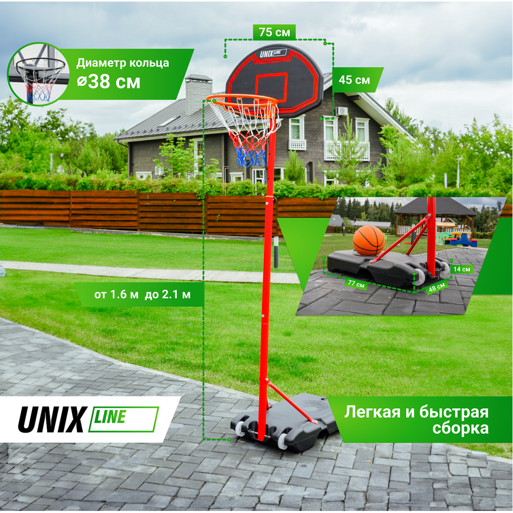 Баскетбольная стойка UNIX Line B-Stand представляет собой сборную конструкцию для любительской игры. Стойка имеет устойчивое основание, которое фиксирует конструкцию в одном положении. Для достижения надежной опоры в основание наливается вода. Отверстие закрывается заглушкой. В качестве заполнителя можно использовать сухой речной песок. Рекомендуется следить за количеством заполнителя в основании, чтобы сохранять устойчивость в безопасном режиме во время занятий баскетболом. . . Баскетбольная стойка UNIX UNIX Line B-Stand производится из стали с защитным полимерным покрытием. Собирается как конструктор по частям, которые фиксируются замковым соединением. Сооружение используется как в закрытых помещениях, так и для уличных соревнований. Команда может перевозить свое оборудование на другие площадки, так как стойки разбираются, складываются и легко переносятся. Благодаря сборной конструкции, стойка регулируется под рост игроков. Особенно это актуально, когда играют детские команды разного возраста. . . В комплектацию спортивной стойки входят щит и баскетбольное кольцо с сеткой. Благодаря своей мобильности, подобные конструкции устанавливают даже на даче для отработки ударов в одиночку и командной игры.. . В подарок идет мяч - 5 либо 7 размера в зависимости от модели стойки с насосом – чтобы вы смогли играть уже сразу после сборки.. . Крайне не рекомендуется выполнять заброс мяча, ухватившись за стойку или за кольцо корзины. Такая манера игры для матчей профессиональной баскетбольной лиги, где устанавливается соответствующее спортивное оборудование. Стойки UNIX не предназначены для таких целей. Стойка Line B-Stand оснащена двумя маленькими колесами, которые блокируются, когда конструкция находится в рабочем состоянии на площадке. Если ее необходимо переместить в другое место, стойку слегка вытягивают вперед, чтобы она встала на колеса. Передвижением занимаются минимум два взрослых человека. .