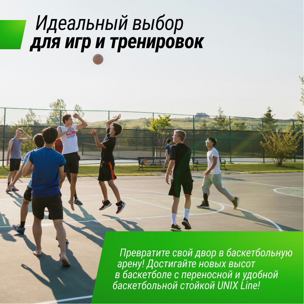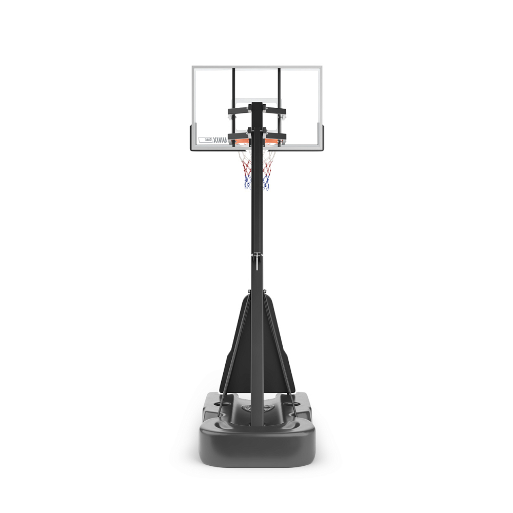 Баскетбольная стойка UNIX Line B-Stand-PC - идеальное решение для всех поклонников баскетбола, от начинающих игроков до опытных профессионалов. Сочетание прочности, надежности и функциональности делает эту стойку незаменимым спортивным аксессуаром для вашего двора или площадки. Специально разработанная устойчивая конструкция обеспечивает стабильность и безопасность во время игры, позволяя вам наслаждаться каждым забитым мячом. Олимпийский стандарт кольца 45 см позволит почувствовать себя настоящим профи в игре. Регулируемая высота щита от 2.30 до 3.05 м позволяет настраивать кольцо со стойкой под свой рост и профессионализм. В основании баскетбольного кольца установлен пружинный механизм амортизирующий ударную нагрузку на кольцо, которое изготовлено из стали диаметром 16 мм. Такие высококачественные материалы уличной баскетбольной стойки 305 см как всепогодная нейлоновая сетка, щит из поликарбоната с защитной пленкой толщиной 3 мм, стальные трубы стойки и водоналивное основание платформы до 180 л гарантируют долгий срок службы, устойчивость к погодным условиям и главное - безопасность. Водоналивную платформу можно заполнить песком для большей устойчивости. Простая сборка и возможность перемещения стойки на двух колесах, обеспечат комфорт даже при подготовке к игре. Баскетбольная стойка UNIX Line производится из стали с защитным полимерным покрытием. Собирается как конструктор по частям, которые фиксируются замковым соединением. Сооружение используется как в закрытых помещениях, так и для уличных соревнований. Команда может перевозить свое оборудование на другие площадки - стойки разбираются, складываются и легко переносятся. Мобильную баскетбольную стойку можно использовать в помещении и на улице. Данная система не предназначена для детей младше 3 лет.. .Крайне не рекомендуется выполнять заброс мяча, ухватившись за стойку или за кольцо корзины, так как она не предназначена для подобного использования. Стойка UNIX Line B-Stand-PC оснащена двумя маленькими колесами, которые блокируются, когда конструкция находится в рабочем состоянии на площадке. Если ее необходимо переместить в другое место, стойку слегка вытягивают вперед, чтобы она встала на колеса. Передвижением занимаются минимум два взрослых человека.. .Баскетбольная стойка с кольцом станет отличным развлечением для дружеских матчей на природе, а также полезным инвентарем для тренировок! .