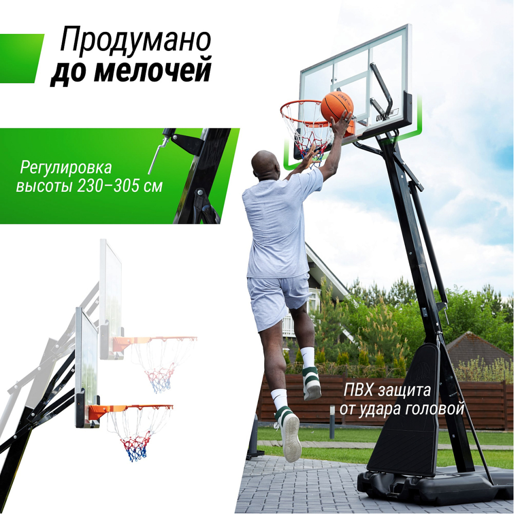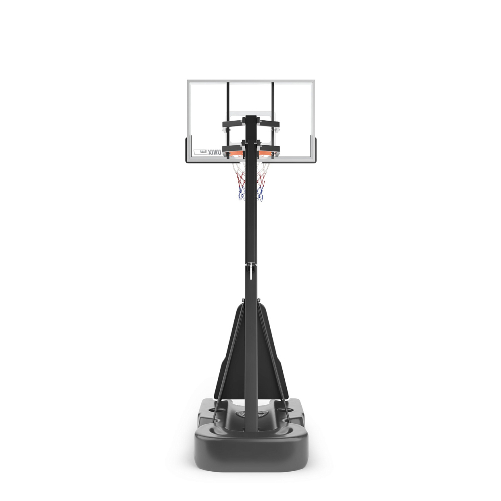 Баскетбольная стойка UNIX Line B-Stand-TG - идеальное решение для всех поклонников баскетбола, от начинающих игроков до опытных профессионалов. Сочетание прочности, надежности и функциональности делает эту стойку незаменимым спортивным аксессуаром для вашего двора или площадки. Специально разработанная устойчивая конструкция обеспечивает стабильность и безопасность во время игры, позволяя вам наслаждаться каждым забитым мячом. Олимпийский стандарт кольца 45 см позволит почувствовать себя настоящим профи в игре. Регулируемая высота щита от 2.30 до 3.05 м позволяет настраивать кольцо со стойкой под свой рост и профессионализм. Такие высококачественные материалы уличной баскетбольной стойки 305 см как всепогодная нейлоновая сетка, щит из закаленного стекла толщиной 8 мм с защитной пленкой , стальные трубы стойки и водоналивное основание платформы до 180 л гарантируют долгий срок службы, устойчивость к погодным условиям и главное - безопасность. Водоналивную платформу можно заполнить песком для большей устойчивости. Простая сборка и легкое перемещение стойки на двух колесах, обеспечат комфорт даже при подготовке к игре. Баскетбольная стойка UNIX Line производится из стали с защитным полимерным покрытием. Собирается как конструктор по частям, которые фиксируются замковым соединением. Сооружение используется как в закрытых помещениях, так и для уличных соревнований. Команда может перевозить свое оборудование на другие площадки - стойки разбираются, складываются и легко переносятся. Мобильную баскетбольную стойку можно использовать в помещении и на улице. Данная система не предназначена для детей младше 3 лет.. .Крайне не рекомендуется выполнять заброс мяча, ухватившись за стойку или за кольцо корзины, так как она не предназначена для подобного использования. Стойка UNIX Line B-Stand-TG оснащена двумя маленькими колесами, которые блокируются, когда конструкция находится в рабочем состоянии на площадке. Если ее необходимо переместить в другое место, стойку слегка вытягивают вперед, чтобы она встала на колеса. Передвижением занимаются минимум два взрослых человека.. .Баскетбольная стойка с кольцом станет отличным развлечением для дружеских матчей на природе, а также полезным инвентарем для тренировок! .