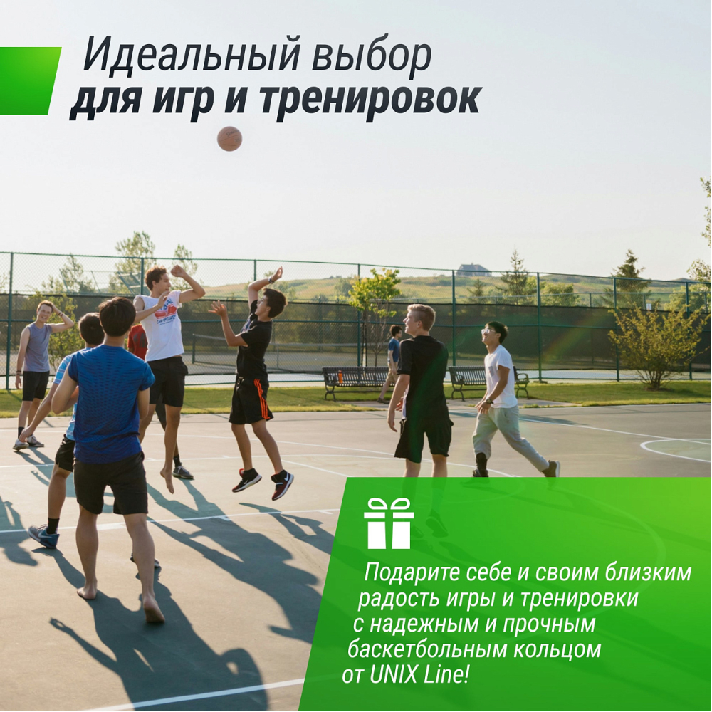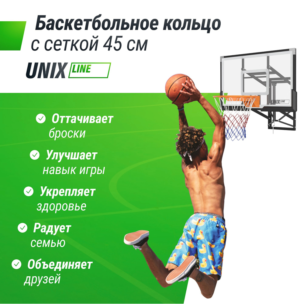 Баскетбольное кольцо уличное UNIX Line B-Rim-Spring с олимпийским стандартом кольца 45 см (18") представляет собой идеальное сочетание прочности, надежности и стиля. Изготовленное из высококачественных материалов, оно способно выдерживать интенсивные игры и тренировки, обеспечивая безопасность и уверенность в каждом броске. В комплект входит усиленное кольцо и нейлоновая сетка.. . Прочный стальной обод с антикоррозийным покрытием обеспечивает превосходное качество и долговечность, баскетбольная сетка выполнена из устойчивого к атмосферным воздействиям нейлона, что делает кольцо идеальным выбором для любой баскетбольной площадки. Благодаря быстрой и простой установке, вы сможете наслаждаться игрой без каких-либо проблем. . . Кольцо баскетбольное идеально подходит для использования как внутри помещения, так и на улице, что делает его универсальным решением для всех любителей баскетбола. Неважно, начинаете ли вы только знакомиться с баскетболом или являетесь опытным игроком, кольцо с сеткой поможет вам провести время с удовольствием! . . Баскетбольное кольцо можно использовать как отдельно, так и для замены стандартного кольца на баскетбольной стойке или щита UNIX Line на усиленное UNIX Line B-Rim-Spring.. Обращаем ваше внимание, в комплект поставляется только кольцо с сеткой. .