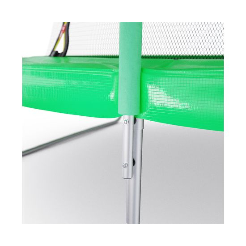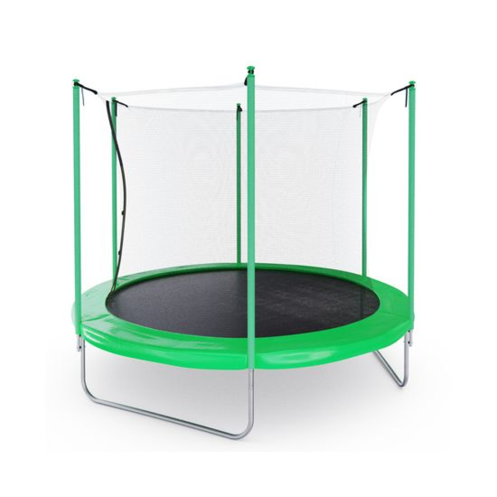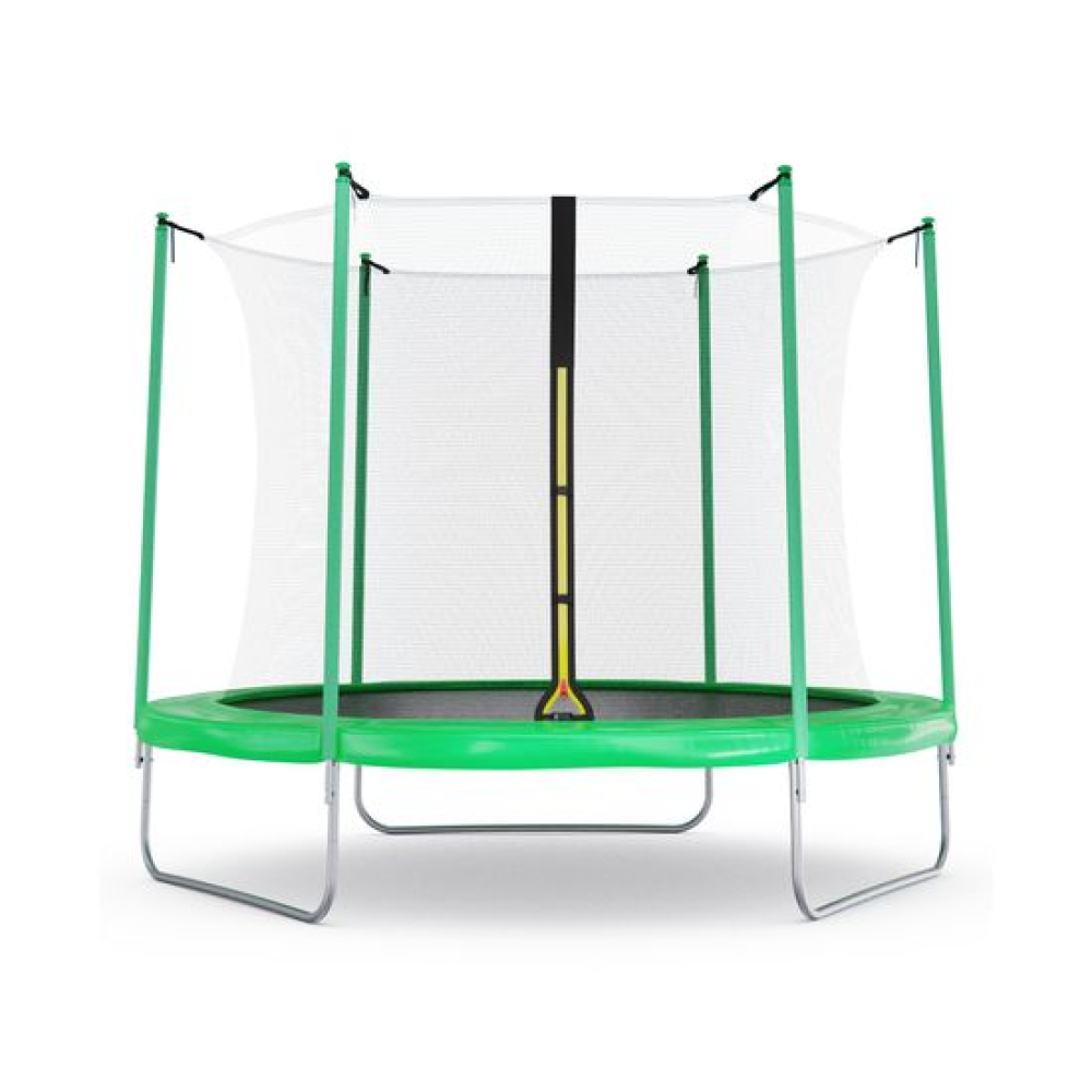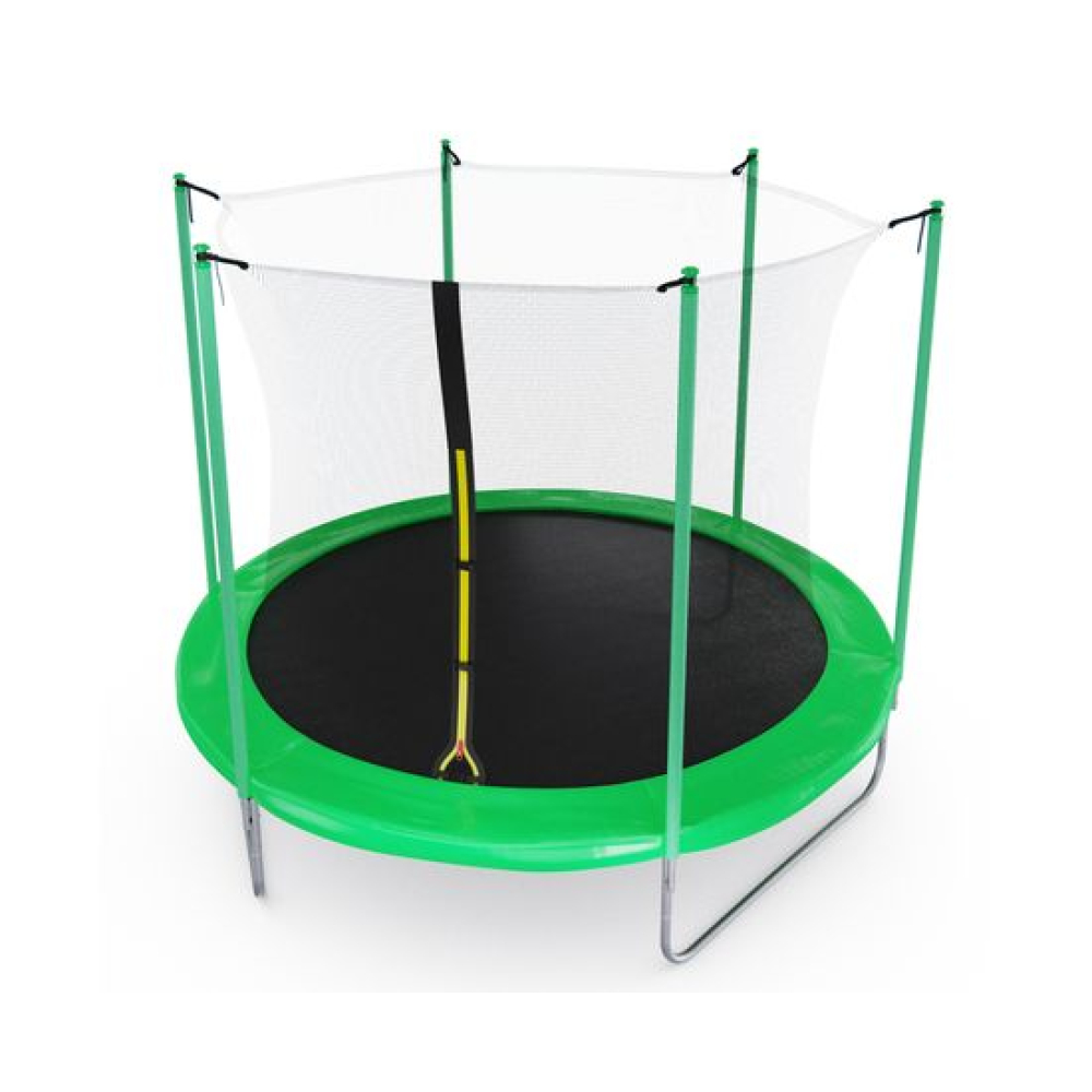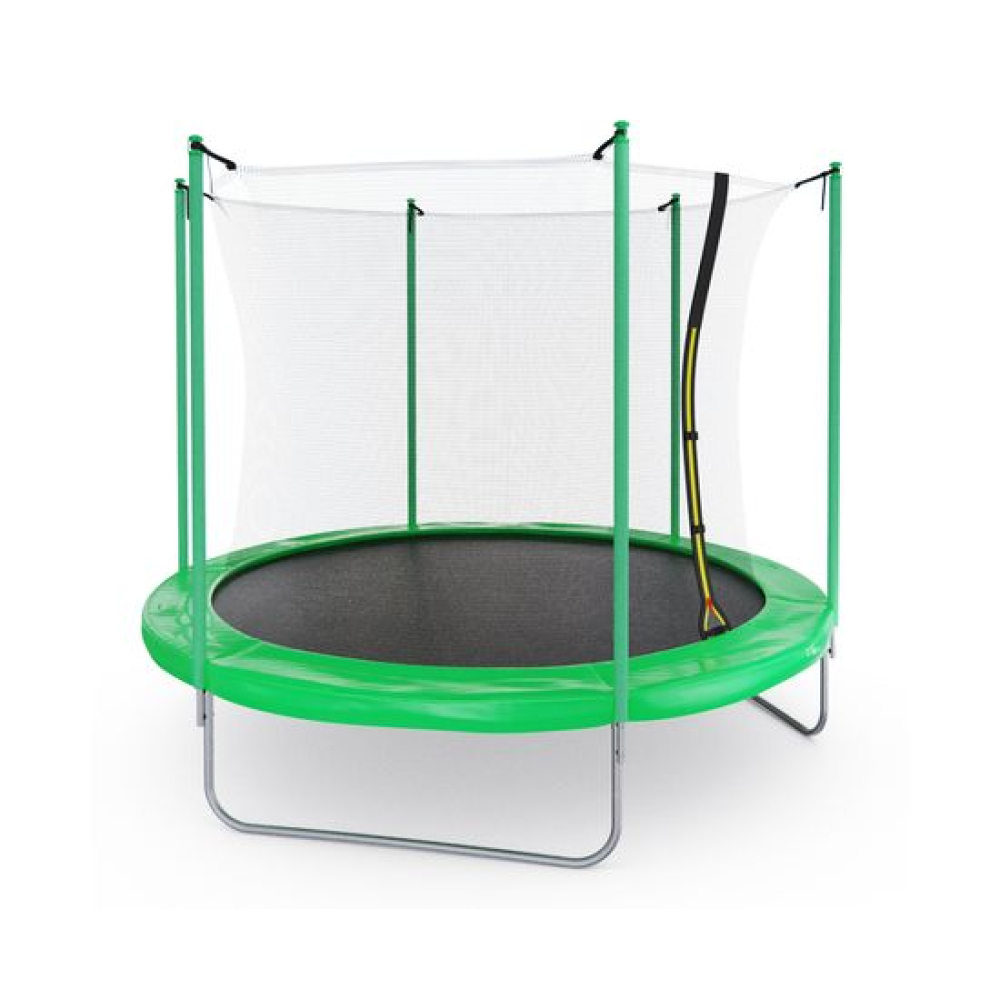 Батут с внутренней сеткой DFC Femmto 10FT зелёного цвета - отличный выбор для активного отдыха на свежем воздухе! Максимальный вес пользователя - 100 килограмм, что позволяет использовать батут как взрослым, так и детям. Цвет батута - зелёный, что делает его не только функциональным, но и стильным элементом ландшафтного дизайна.Диаметр батута составляет 10 футов (305 сантиметров), что позволяет комфортно разместиться на нем всей семье или компании друзей. Батут оснащен 54 пружинами, которые обеспечивают высокую прыгучесть и комфортное приземление. Пружины изготовлены из прочного и долговечного материала - нержавеющей стали.Прыжковое полотно выполнено из высококачественного полипропилена, который обладает высокой прочностью, устойчивостью к УФ-излучению и влаге. Защитный мат состоит из трех слоев: PE (полиэтилен), EPE (этиленвинилацетат) и PE (полипропилен). Толщина мата составляет 10 миллиметров, что обеспечивает дополнительную защиту от травм и ушибов при прыжках.Основная рама изготовлена из шести U-образных стальных труб диаметром 38 миллиметров и толщиной 1,2 миллиметра, что обеспечивает ее прочность и долговечность. Ножки U-образной формы, выполнены из стальных труб диаметром 38 миллиметров и толщиной 1 миллиметр, что придает батуту устойчивость и надежность. Стойки под защитную сетку изготовлены из стальных труб диаметром 25 миллиметров и толщиной 1 миллиметр. Высота защитной сетки составляет 170 сантиметров, что обеспечивает полную безопасность при прыжках на батуте.