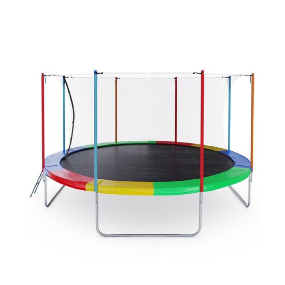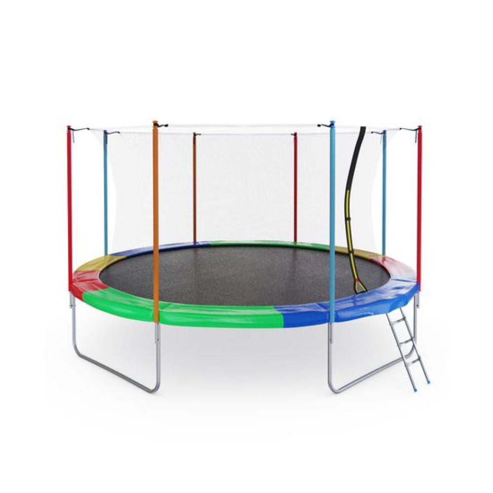 Батут с внутренней сеткой DFC Femmto 14FT разноцветный - отличный выбор для активного отдыха на свежем воздухе! Максимальный вес пользователя - 150 килограмм, что позволяет использовать батут как взрослым, так и детям. Батут разноцветный и яркий: как в парках аттракционов, он создаст особую праздничную атмосферу прямо у вас во дворе.Диаметр батута составляет 14 футов (427 сантиметров), что позволяет комфортно разместиться на нем всей семье или компании друзей. Батут оснащен 80 пружинами, которые обеспечивают высокую прыгучесть и комфортное приземление. Пружины изготовлены из прочного и долговечного материала - нержавеющей стали.Прыжковое полотно выполнено из высококачественного полипропилена, который обладает высокой прочностью, устойчивостью к УФ-излучению и влаге. Защитный мат состоит из трех слоев: PE (полиэтилен), EPE (этиленвинилацетат) и PE (полипропилен). Толщина мата составляет 10 миллиметров, что обеспечивает дополнительную защиту от травм и ушибов при прыжках.Основная рама изготовлена из восьми U-образных стальных труб диаметром 38 миллиметров и толщиной 1,3 миллиметра, что обеспечивает ее прочность и долговечность. Ножки U-образной формы, выполнены из стальных труб диаметром 38 миллиметров и толщиной 1,3 миллиметра, что придает батуту устойчивость и надежность. Стойки под защитную сетку изготовлены из стальных труб диаметром 25 миллиметров и толщиной 1 миллиметр. Высота защитной сетки составляет 170 сантиметров, что обеспечивает полную безопасность при прыжках на батуте.