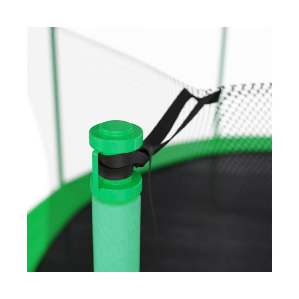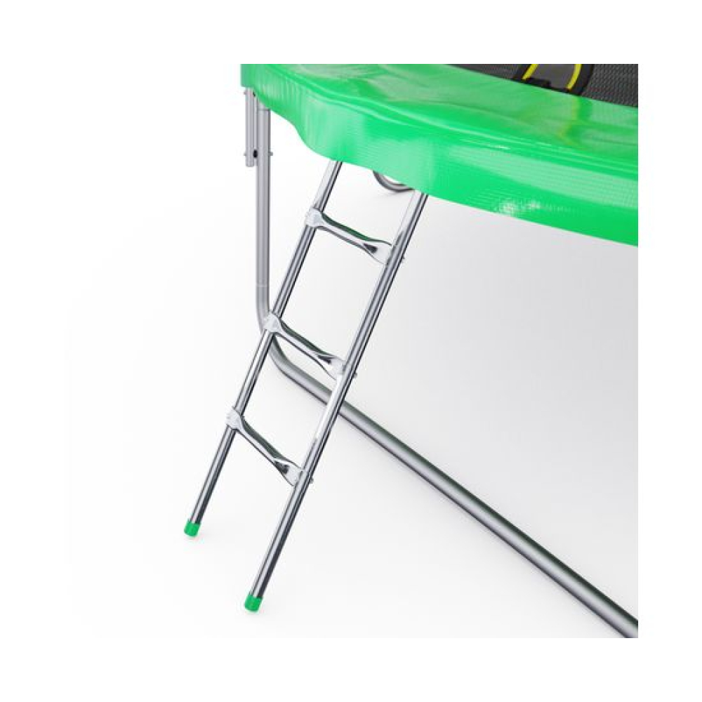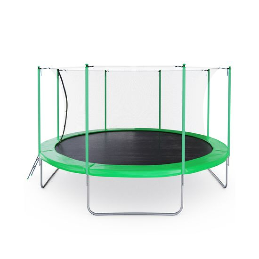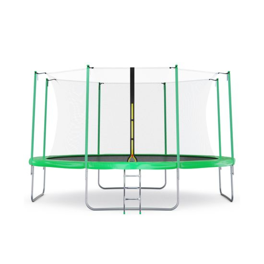 Батут с внутренней сеткой DFC Femmto 14FT зеленного цвета - отличный выбор для активного отдыха на свежем воздухе! Максимальный вес пользователя - 150 килограмм, что позволяет использовать батут как взрослым, так и детям. Цвет батута - зеленный, что делает его не только функциональным, но и стильным элементом ландшафтного дизайна.Диаметр батута составляет 14 футов (427 сантиметров), что позволяет комфортно разместиться на нем всей семье или компании друзей. Батут оснащен 80 пружинами, которые обеспечивают высокую прыгучесть и комфортное приземление. Пружины изготовлены из прочного и долговечного материала - нержавеющей стали.Прыжковое полотно выполнено из высококачественного полипропилена, который обладает высокой прочностью, устойчивостью к УФ-излучению и влаге. Защитный мат состоит из трех слоев: PE (полиэтилен), EPE (этиленвинилацетат) и PE (полипропилен). Толщина мата составляет 10 миллиметров, что обеспечивает дополнительную защиту от травм и ушибов при прыжках.Основная рама изготовлена из восьми U-образных стальных труб диаметром 38 миллиметров и толщиной 1,3 миллиметра, что обеспечивает ее прочность и долговечность. Ножки U-образной формы, выполнены из стальных труб диаметром 38 миллиметров и толщиной 1,3 миллиметра, что придает батуту устойчивость и надежность. Стойки под защитную сетку изготовлены из стальных труб диаметром 25 миллиметров и толщиной 1 миллиметр. Высота защитной сетки составляет 170 сантиметров, что обеспечивает полную безопасность при прыжках на батуте.