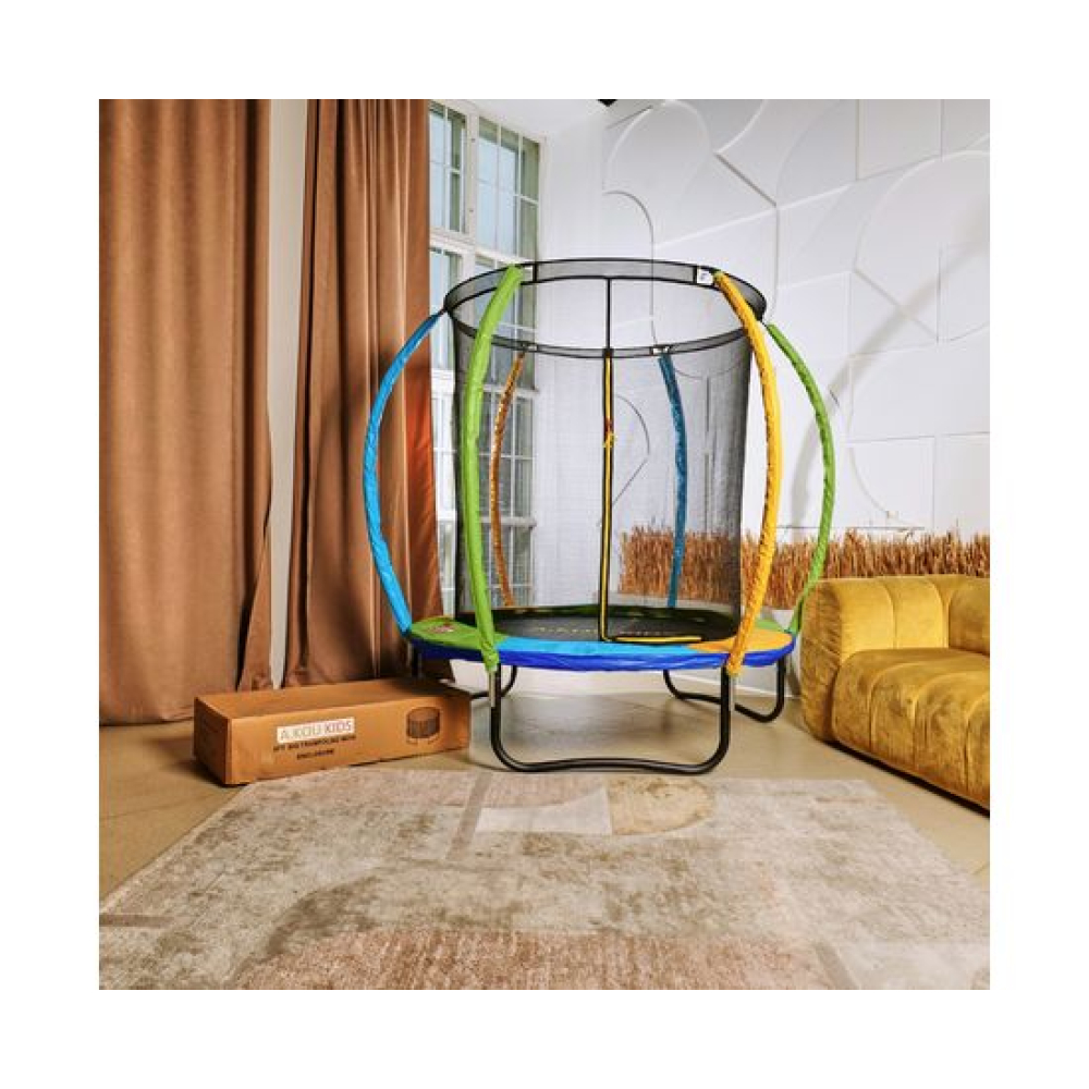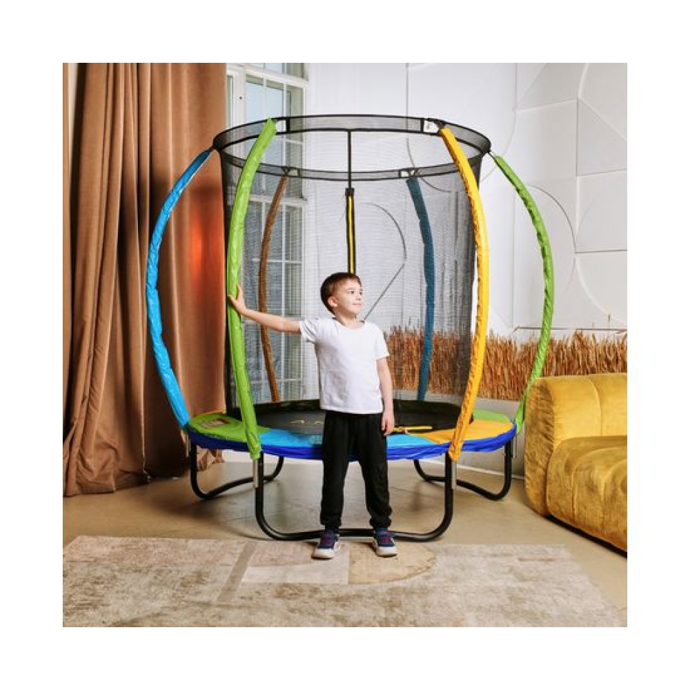 Цветной батут DFC A.KOU KIDS 6FT станет настоящим центром развлечения для ваших детей, принося массу радости и удовольствия! Идеально подойдет для детей, позволяя им наслаждаться прыжками и забавными играми на свежем воздухе или в помещении! Максимальный вес пользователя батута — это максимальный вес, при котором пользователь может прыгать свободно и в любом темпе. Максимальная нагрузка — это вес, который выдерживает батут в статичном положении пользователя. Для батута DFC A.KOU KIDS 6ft максимальный вес пользователя – 80 кг. Нагрузка – 120 кг.Поверхность батута изготовлена из высококачественного полипропилена, способного выдерживать ультрафиолетовые лучи, что гарантирует долговечность и надежность изделия.Внутренняя защитная сетка высотой 154 см обеспечивает безопасность пользователей, предотвращая возможные выпады за пределы батута. Она легко открывается и закрывается с помощью специального замка и надежно фиксируется на стойках, выполненных из высокопрочной стали.Батут оснащен 36-ю пружинами диаметром 3 мм и длиной 116 мм, которые обеспечивают мягкость и плавность прыжков. Кроме того, батут имеет прочный защитный кожух из ПВХ, который защищает прыгунов от травм и смягчает приземление.Основная рама батута состоит из 6-ти прочных стальных труб диаметром 38 мм и толщиной 1,2 мм, что обеспечивает устойчивость и безопасность при использовании. U-образные ножки и стойки для защитной сетки также выполнены из высокопрочной стальной трубы.