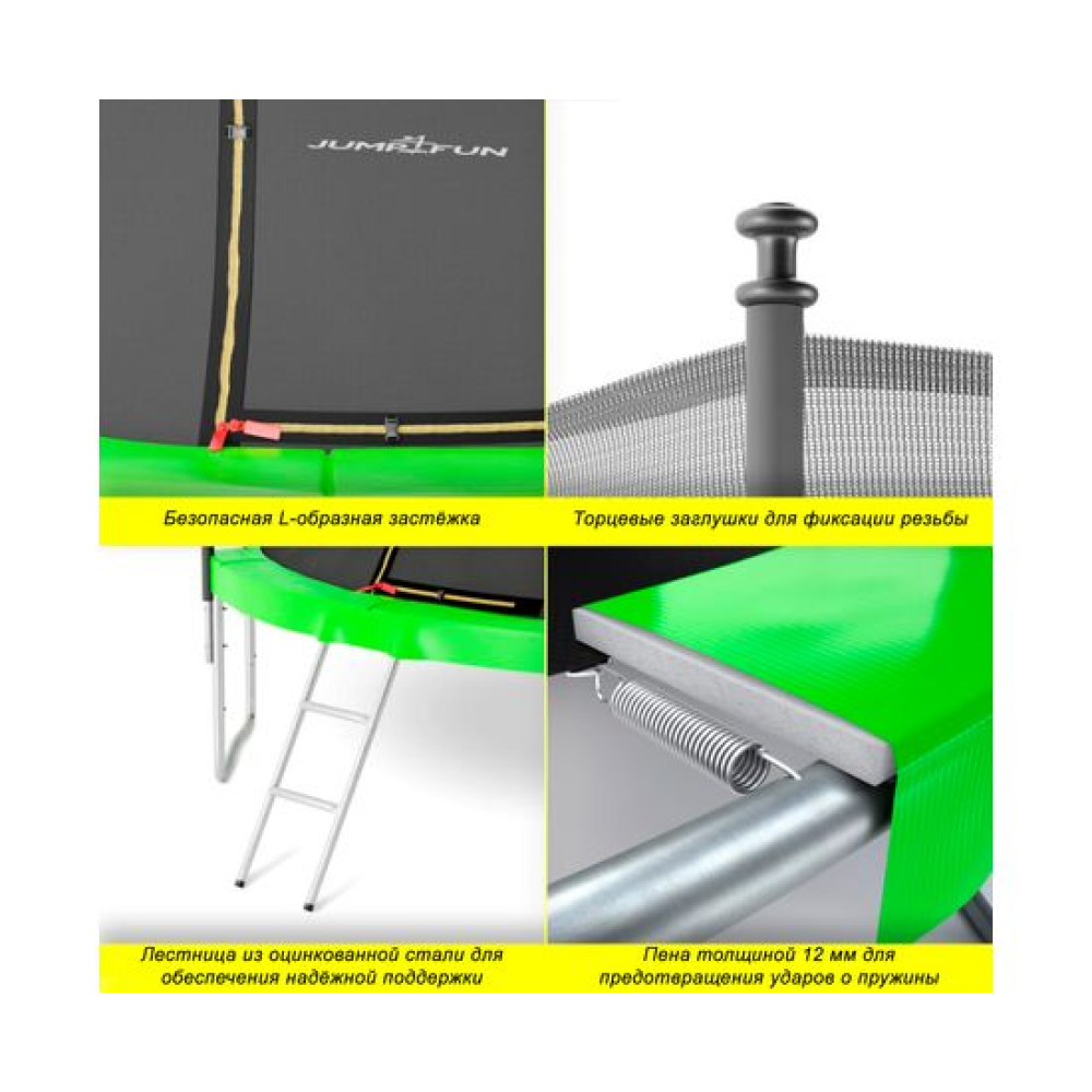 Батут DFC JUMP4FUN 6 ft салатового цвета - это отличный выбор для любителей активного отдыха и фитнеса на свежем воздухе. С внутренней защитной сеткой, этот батут обеспечивает безопасное и веселое времяпрепровождение для детей и взрослых.Диаметр батута составляет 6 футов (183 см). 36 пружин выдерживают максимальный вес пользователя до 80 кг. Это позволяет использовать его как для детей, так и для подростков, обеспечивая веселье и активность для всей семьи.Прыжковое полотно из полипропилена с UV-защитой обеспечивает отличные прыжки и мягкое приземление. Защитный мат толщиной 12 мм обеспечивает дополнительную безопасность при использовании батута.Основная рама и 3 U-образные ножки гарантируют стабильность и устойчивость батута даже на неровной поверхности.Батут имеет высоту 50 см, что позволяет легко входить и выходить из него. Высота защитной сетки составляет нестандартные 200 см, обеспечивая безопасное использование даже для высоких детей. Внутренняя сетка обеспечивает изоляцию ребёнка от пружин, делая батут ещё более безопасным. Лестница в наличии.