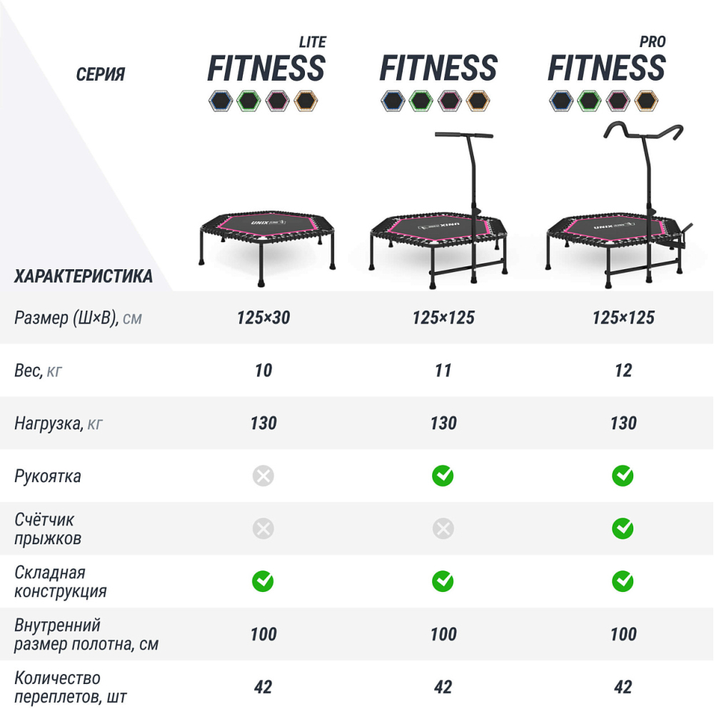 Спортивный батут для фитнеса и джампинга UNIX Line Fitness – это простота и легкость сборки, высокая безопасность и качественные материалы.. . Спортивный батут подойдет для занятий Джампингом (Jumping). Джампинг - это фитнес-программа и упражнения, которые выполняются на круглых батутах со специальными опорами. Это сочетание аэробной и силовой нагрузки, а также упражнения на баланс и растяжку. Упражнения на батуте помогают улучшить работу сердечно-сосудистой и лимфатической систем. Одно из основных преимуществ батута для фитнеса заключается в том, что он позволяет выполнять кардиотренировки без нагрузки на суставы, что делает его идеальным выбором для тех, у кого есть проблемы с суставами или травмы. . . Мощная шестиугольная рама с толщиной стали 1.5 мм и дополнительная горизонтальная поперечина придает жесткость конструкции и позволяет выдерживать самые продолжительные и интенсивные тренировки. Модель UNIX Line FITNESS Lite предназначена как для групповых занятий, так и для домашних тренировок. Максимальный вес пользователя составляет 130 кг.. . Прыжковое полотно из материала Permatron соединяется с рамой с помощью 42-х переплетов бесшумного жгута. Permatron – эластичный материал, легко возвращающийся в исходное состояние при постоянном воздействии с разной нагрузкой. Он устойчив к внешним воздействиям: ультрафиолету, плесени, влаге, резким изменениям температуры. Термическая обработка делает эту ткань устойчивой к постоянным изгибам и стрессовым нагрузкам. Прыжковое полотно для батута, изготовленное из перматрона, подходит для применения дома и на улице. Этот материал не боится осадков и воздействия солнечных лучей, также обладает антистатическими свойствами.. . Батут для фитнеса складной поможет весело провести время, снять стресс, улучшить координацию, укрепить мышцы тела и избавиться от лишнего веса. Батут можно использовать не только взрослым, но и детям в качестве развлечения, он не занимает много места и станет приятным необычным времяпрепровождением..