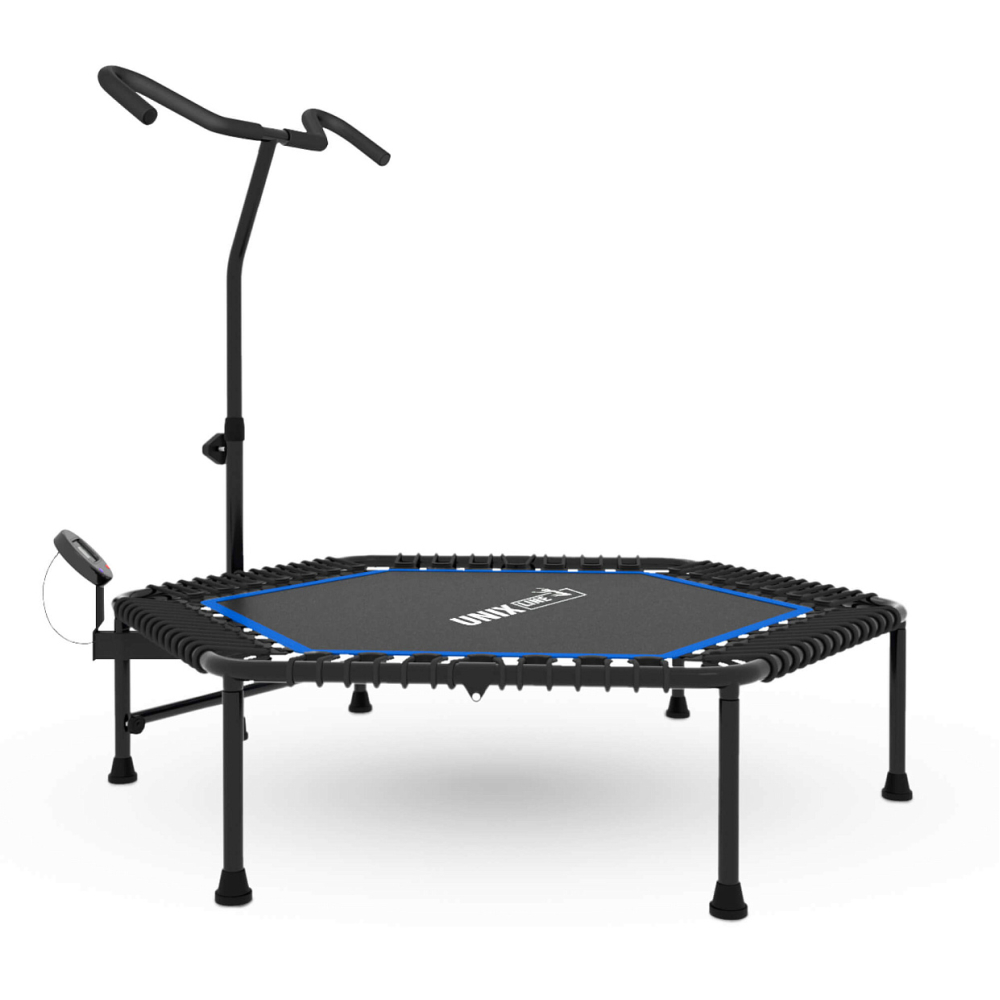 Спортивный батут для фитнеса и джампинга UNIX Line Fitness PRO – это простота и легкость сборки, высокая безопасность и качественные материалы.. . В модели PRO мы добавили удобную эргономичную изогнутую ручку и счетчик для количества прыжков!. . Данная модель батута разработана специально для занятий Джампингом (Jumping). Джампинг - это фитнес-программа и упражнения, которые выполняются на круглых батутах со специальными опорами. Это сочетание аэробной и силовой нагрузки, а также упражнения на баланс и растяжку. Упражнения на батуте помогают улучшить работу сердечно-сосудистой и лимфатической систем. Одно из основных преимуществ батута для фитнеса заключается в том, что он позволяет выполнять кардиотренировки без нагрузки на суставы, что делает его идеальным выбором для тех, у кого есть проблемы с суставами или травмы. . . Мощная шестиугольная рама с толщиной стали 1.5 мм и дополнительная горизонтальная поперечина придает жесткость конструкции и позволяет выдерживать самые продолжительные и интенсивные тренировки. Регулируемая эргономичная ручка на кронштейне имеет 5 уровней регулировки высоты (от 72 см до 92 см) и легко подстраивается под рост пользователя. Модель UNIX Line Fitness PRO предназначена как для групповых занятий, так и для домашних тренировок. Максимальный вес пользователя составляет 130 кг. Основание батута состоит из 6 винтовых съемных ножек высотой 30 см.. . Прыжковое полотно из материала Permatron соединяется с рамой с помощью 42-х переплетов бесшумного жгута. Permatron – эластичный материал, легко возвращающийся в исходное состояние при постоянном воздействии с разной нагрузкой. Он устойчив к внешним воздействиям: ультрафиолету, плесени, влаге, резким изменениям температуры. Термическая обработка делает эту ткань устойчивой к постоянным изгибам и стрессовым нагрузкам. Прыжковое полотно для батута, изготовленное из перматрона, подходит для применения дома и на улице. Этот материал не боится осадков и воздействия солнечных лучей, также обладает антистатическими свойствами.. . Батут для фитнеса с ручкой поможет весело провести время, снять стресс, улучшить координацию, укрепить мышцы тела и избавиться от лишнего веса. Спортивный батут оснащен регулируемой по высоте ручкой. Батут можно использовать не только взрослым, но и детям в качестве развлечения, он не занимает много места и станет приятным необычным времяпрепровождением..
