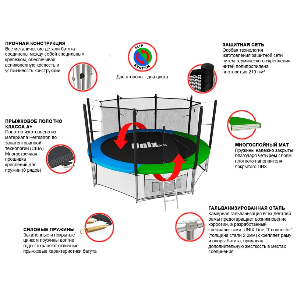 Батуты UNIX Line серии Classic разработаны для ежедневного использования детьми и взрослыми и соответствуют международным стандартам качества ISO 9001. Батут изготовлен из высокопрочной стали толщиной 1,5 мм с двойным слоем оцинкованного антикоррозийного покрытия. Рама соединяется между собой с помощью специального T-connector (2.4 мм), обеспечивая безопасность и надежность во время прыжковых игр. 54 пружины в конструкции каркасного батута обеспечивают отличный отскок, а также прочность и долговечность батута.. . Металлический каркас батутов выполнен из прочной гальванизированной стали, максимально допустимый вес пользователя 150 кг. Прыжковое полотно производится из специального высокопрочного материала Permatron, устойчивого к любым неблагоприятным воздействиям окружающей среды и механическим воздействиям. Permatron – эластичный материал, легко возвращающийся в исходное состояние при постоянном воздействии с разной нагрузкой. Он устойчив к внешним воздействиям: ультрафиолету, плесени, влаге, резким изменениям температуры. Термическая обработка делает эту ткань устойчивой к постоянным изгибам и стрессовым нагрузкам. Прыжковое полотно для батута, изготовленное из перматрона, подходит для применения дома и на улице. Этот материал не боится осадков и воздействия солнечных лучей, также обладает антисептическими свойствами. Защитный мат для пружин, расположенный по периметру батута, состоит из четырех слоев, обшитых ПВХ материалом, плотностью 130 г/см3 и надежно закрывает пружины.. . Батут оснащен высокой защитной сеткой высотой 175 см, которая обеспечивает максимальную безопасность при прыжках. Она предотвращает падения и травмы, а также защищает детей от попадания на батут животных или других предметов. Батут UNIX Line – это отличный выбор для родителей, которые хотят обеспечить своим детям безопасные и интересные занятия на свежем воздухе. Он поможет развить физические способности детей, а также принесет много радости и удовольствия всей семье. Внутренняя защитная сетка предотвращает попадание ног в блок пружин. Защитная сетка расположена по периметру прыжкового полотна. Сетка изготовлена из качественного и эластичного материала Polyethylene, который более устойчив к воздействию влаги и УФ-излучения. . . Каркасный батут с защитной сеткой безопасный подойдет для тренировок и просто для развлечений, он оснащен двусторонней молнией и дополнительными пластиковыми фиксаторами. Прыжки на батуте — это отличная аэробная нагрузка: улучшения общей физической формы, заряд положительными эмоциями, улучшение работы кардио системы, развитие чувства равновесия и координации, подойдет для пользователей любого возраста. Занятия на свежем воздухе укрепляют иммунитет, повышают выносливость. . . Помимо верхней защитной сетки, все батуты модельного ряда UNIX Line Classic оборудованы нижней защитной сеткой, которая препятствует проникновению под прыжковое полотно батута детей, животных, а так же попаданию посторонних предметов, и лестницей для удобства пользования. А в моделях диаметром от 10FT (305см.), в комплект входят специальные крепления батута к земле (колышки). . Главным приоритетом компания ставит безопасность детей, поэтому наши батуты изготовлены в соответствии со всеми требованиями из высококачественных материалов. Батут способствует развитию координации 