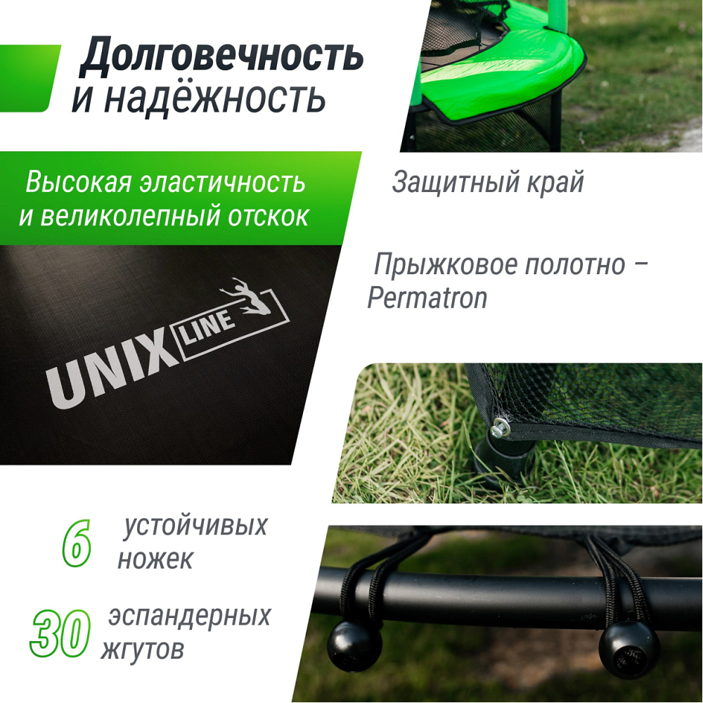 Серия батутов для детей "Kids" торговой марки UNIX Line – это простота и легкость сборки, высокая безопасность и качественные материалы. Детский батут UNIX Line Kids - идеальное развлечение для вашего ребенка, которое сочетает в себе веселье, физическую активность и развитие.. . Батут UNIX Line Kids 4,6 ft станет прекрасным и полезным аттракционом для юных любителей прыжков. Диаметр батута составляет 140 сантиметров, а его полная высота - 163 сантиметра. Каркас батута выполнен из прочной стали с двойной порошковой окраской, что обеспечивает высокий уровень безопасности и долговечности. Роль пружин на данной модели выполняют эспандерные жгуты, что обеспечивает высокую эластичность и великолепный отскок. Вход в батут фиксируется молнией, для обеспечения максимальной безопасности ребенка.. . Упругий материал прыжкового полотна Перматрон и 30 пружин гарантируют высокую эластичность и безопасность. Кроме того, батут имеет специальное покрытие для предотвращения скольжения, что делает его еще более безопасным для использования. Детский каркасный батут оснащен защитной сеткой, которая обеспечивает безопасность и предотвращает падения, а вход в батут фиксируется молнией. Ребенок сможет с удовольствием наслаждаться прыжками на детском батуте в любое время!. . Небольшой размер батута позволяет использовать его как на улице, так и дома. Будь то игра на свежем воздухе или занятия в помещении, детский каркасный батут будет идеальным спутником для вашего ребенка! Детский батут для дома поможет развитию координации, баланса и гибкости маленького спортсмена и радоваться каждому прыжку на нашем прочном и безопасном батуте!. . Предназначен для детей в возрасте от 2 до 7 лет, весом до 50 кг.. .