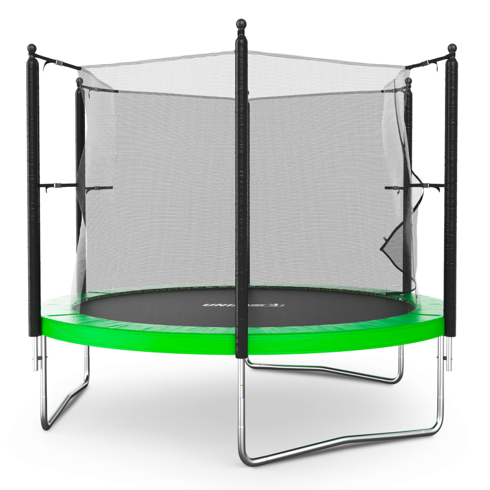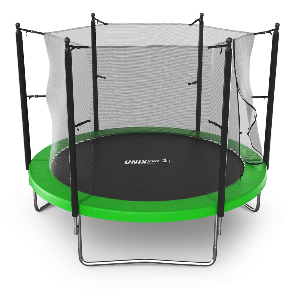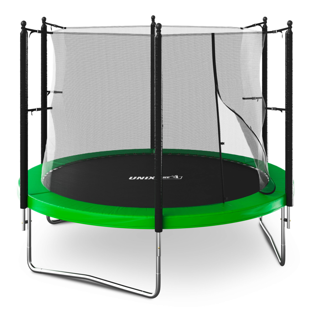 Батуты UNIX Line серии Simple - это простота и легкость сборки, качественные материалы, широкий выбор размеров и цветовых решений. Батут изготовлен из высокопрочной стали толщиной 1,5 мм с двойным слоем оцинкованного антикоррозийного покрытия. Рама соединяется между собой с помощью специального T-connector (2.4 мм), обеспечивая безопасность и надежность во время прыжковых игр. 54 пружины в конструкции каркасного батута обеспечивают отличный отскок, а также прочность и долговечность батута.. . Металлический каркас батутов выполнен из прочной гальванизированной стали, максимально допустимый вес пользователя 140 кг. Прыжковое полотно производится из специального высокопрочного материала Permatron, устойчивого к любым неблагоприятным воздействиям окружающей среды и механическим воздействиям. Permatron – эластичный материал, легко возвращающийся в исходное состояние при постоянном воздействии с разной нагрузкой. Он устойчив к внешним воздействиям: ультрафиолету, плесени, влаге, резким изменениям температуры. Термическая обработка делает эту ткань устойчивой к постоянным изгибам и стрессовым нагрузкам. Прыжковое полотно для батута, изготовленное из перматрона, подходит для применения дома и на улице. Этот материал не боится осадков и воздействия солнечных лучей, также обладает антисептическими свойствами.. . Батут оснащен высокой защитной сеткой высотой 175 см, которая обеспечивает максимальную безопасность при прыжках. Она предотвращает падения и травмы, а также защищает детей от попадания на батут животных или других предметов. Батут UNIX Line серии Simple – это отличный выбор для родителей, которые хотят обеспечить своим детям безопасные и интересные занятия на свежем воздухе. Он поможет развить физические способности детей, а также принесет много радости и удовольствия всей семье. Внутренняя защитная сетка предотвращает попадание ног в блок пружин. Защитная сетка расположена по периметру прыжкового полотна. Сетка изготовлена из качественного и эластичного материала Polyethylene, который более устойчив к воздействию влаги и УФ-излучения. . . Каркасный батут с защитной сеткой безопасный подойдет для тренировок и просто для развлечений, он оснащен двусторонней молнией и дополнительными пластиковыми фиксаторами. Прыжки на батуте — это отличная аэробная нагрузка: улучшения общей физической формы, заряд положительными эмоциями, улучшение работы кардио системы, развитие чувства равновесия и координации, подойдет для пользователей любого возраста. Занятия на свежем воздухе укрепляют иммунитет, повышают выносливость. . . Главным приоритетом компания ставит безопасность детей, поэтому наши батуты изготовлены в соответствии со всеми требованиями из высококачественных материалов. Батут способствует развитию координации движений, баланса и гибкости, что положительно влияет на здоровье и физическую форму детей. Гарантия на батуты составляет 2 года. . Серия Simple батутов торговой марки UNIX Line - это простота и легкость сборки, качественные материалы, широкий выбор размеров и цветовых решений. . . . Доступны другие размеры и варианты батутов серии Simple: Батут UNIX Line Simple 6 ft Green (outside). Батут UNIX Line Simple 6 ft Green (inside). Батут UNIX Line Simple 6 ft Color (outside). Батут UNIX Line Simple 6 ft Color (inside). Батут UNIX Line Simple 8 ft Green (outside). Батут UNIX Line Simple 8 ft Green (inside). Батут UNIX Line Simple 8 ft Color (outside). Батут UNIX Line Simple 8 ft Col