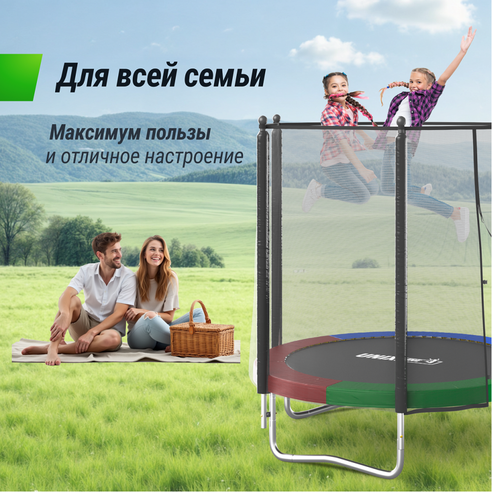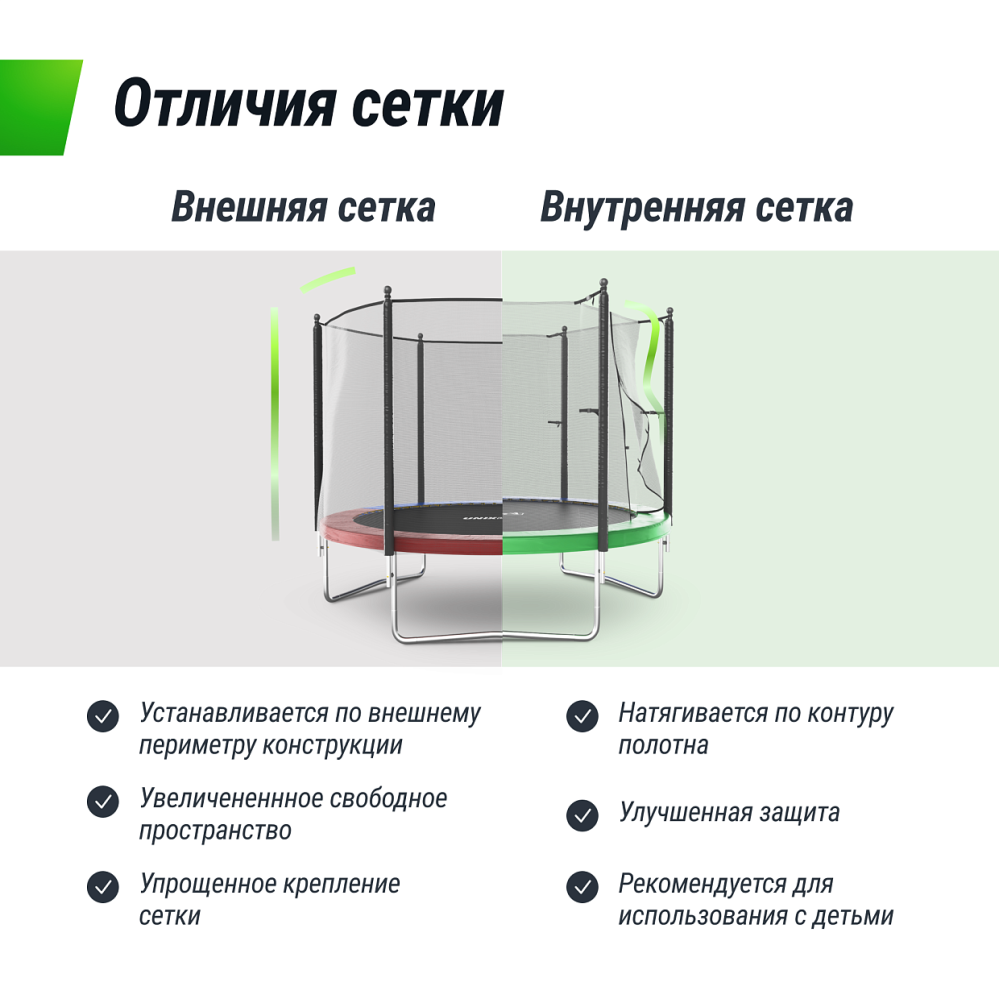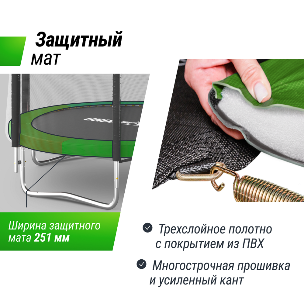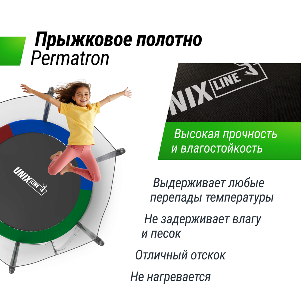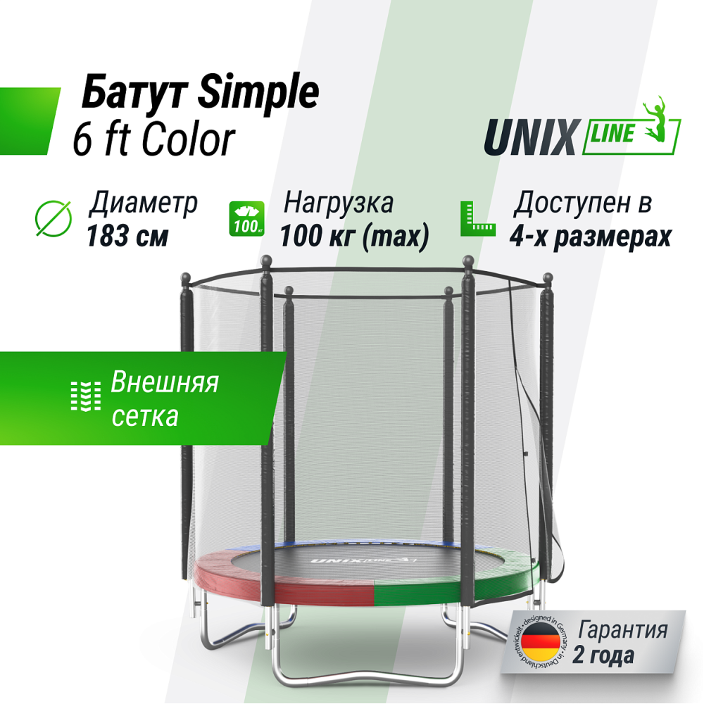 Уважаемые покупатели! Обращаем ваше внимание, что внешний вид товара может немного отличаться по дизайну (расцветке) от товара на фото, на технические свойства это не влияет. . . Батуты UNIX Line серии Simple - это простота и легкость сборки, качественные материалы, широкий выбор размеров и цветовых решений. Батут изготовлен из высокопрочной стали толщиной 1,5 мм с двойным слоем оцинкованного антикоррозийного покрытия. Рама соединяется между собой с помощью специального T-connector (2.4 мм), обеспечивая безопасность и надежность во время прыжковых игр. 36 пружин в конструкции каркасного батута обеспечивают отличный отскок, а также прочность и долговечность батута.. . Металлический каркас батутов выполнен из прочной гальванизированной стали, максимально допустимый вес пользователя 100 кг. Прыжковое полотно производится из специального высокопрочного материала Permatron, устойчивого к любым неблагоприятным воздействиям окружающей среды и механическим воздействиям. Permatron – эластичный материал, легко возвращающийся в исходное состояние при постоянном воздействии с разной нагрузкой. Он устойчив к внешним воздействиям: ультрафиолету, плесени, влаге, резким изменениям температуры. Термическая обработка делает эту ткань устойчивой к постоянным изгибам и стрессовым нагрузкам. Прыжковое полотно для батута, изготовленное из перматрона, подходит для применения дома и на улице. Этот материал не боится осадков и воздействия солнечных лучей, также обладает антисептическими свойствами.. . Батут оснащен высокой защитной сеткой высотой 160 см, которая обеспечивает максимальную безопасность при прыжках. Она предотвращает падения и травмы, а также защищает детей от попадания на батут животных или других предметов. Батут UNIX Line серии Simple – это отличный выбор для родителей, которые хотят обеспечить своим детям безопасные и интересные занятия на свежем воздухе. Он поможет развить физические способности детей, а также принесет много радости и удовольствия всей семье. Внешняя защитная сетка предоставляет больше пространства для прыжков. Защитная сетка расположена по периметру рамы батута. Сетка изготовлена из качественного и эластичного материала Polyethylene, который более устойчив к воздействию влаги и УФ-излучения.. . Каркасный батут с защитной сеткой безопасный подойдет для тренировок и просто для развлечений, он оснащен двусторонней молнией и дополнительными пластиковыми фиксаторами. Прыжки на батуте — это отличная аэробная нагрузка: улучшения общей физической формы, заряд положительными эмоциями, улучшение работы кардио системы, развитие чувства равновесия и координации, подойдет для пользователей любого возраста. Занятия на свежем воздухе укрепляют иммунитет, повышают выносливость. . . Главным приоритетом компания ставит безопасность детей, поэтому наши батуты изготовлены в соответствии со всеми требованиями из высококачественных материалов. Батут способствует развитию координации движений, баланса и гибкости, что положительно влияет на здоровье и физическую форму детей. Гарантия на батуты составляет 2 года.. . Серия Simple батутов торговой марки UNIX Line - это простота и легкость сборки, качественные материалы, широкий выбор размеров и цветовых решений. . . Доступны другие размеры и варианты батутов серии Simple:. Батут UNIX Line Simple 6 ft Green (outside). Батут UNIX Line Sim