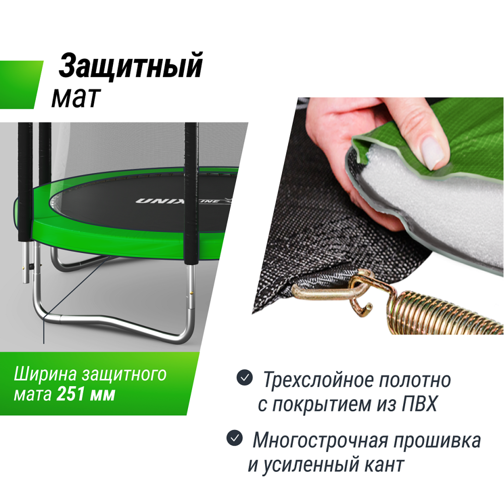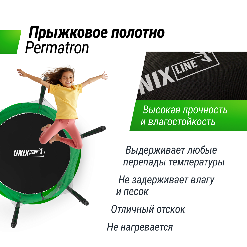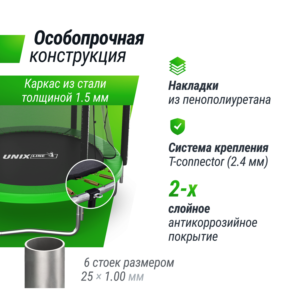 Батуты UNIX Line серии Simple - это простота и легкость сборки, качественные материалы, широкий выбор размеров и цветовых решений. Батут изготовлен из высокопрочной стали толщиной 1,5 мм с двойным слоем оцинкованного антикоррозийного покрытия. Рама соединяется между собой с помощью специального T-connector (2.4 мм), обеспечивая безопасность и надежность во время прыжковых игр. 36 пружин в конструкции каркасного батута обеспечивают отличный отскок, а также прочность и долговечность батута.. . Металлический каркас батутов выполнен из прочной гальванизированной стали, максимально допустимый вес пользователя 1030 кг. Прыжковое полотно производится из специального высокопрочного материала Permatron, устойчивого к любым неблагоприятным воздействиям окружающей среды и механическим воздействиям. Permatron – эластичный материал, легко возвращающийся в исходное состояние при постоянном воздействии с разной нагрузкой. Он устойчив к внешним воздействиям: ультрафиолету, плесени, влаге, резким изменениям температуры. Термическая обработка делает эту ткань устойчивой к постоянным изгибам и стрессовым нагрузкам. Прыжковое полотно для батута, изготовленное из перматрона, подходит для применения дома и на улице. Этот материал не боится осадков и воздействия солнечных лучей, также обладает антисептическими свойствами.. . Батут оснащен высокой защитной сеткой высотой 160 см, которая обеспечивает максимальную безопасность при прыжках. Она предотвращает падения и травмы, а также защищает детей от попадания на батут животных или других предметов. Батут UNIX Line серии Simple – это отличный выбор для родителей, которые хотят обеспечить своим детям безопасные и интересные занятия на свежем воздухе. Он поможет развить физические способности детей, а также принесет много радости и удовольствия всей семье. Внутренняя защитная сетка предотвращает попадание ног в блок пружин. Защитная сетка расположена по периметру прыжкового полотна. Сетка изготовлена из качественного и эластичного материала Polyethylene, который более устойчив к воздействию влаги и УФ-излучения. . . Каркасный батут с защитной сеткой безопасный подойдет для тренировок и просто для развлечений, он оснащен двусторонней молнией и дополнительными пластиковыми фиксаторами. Прыжки на батуте — это отличная аэробная нагрузка: улучшения общей физической формы, заряд положительными эмоциями, улучшение работы кардио системы, развитие чувства равновесия и координации, подойдет для пользователей любого возраста. Занятия на свежем воздухе укрепляют иммунитет, повышают выносливость. . . Главным приоритетом компания ставит безопасность детей, поэтому наши батуты изготовлены в соответствии со всеми требованиями из высококачественных материалов. Батут способствует развитию координации движений, баланса и гибкости, что положительно влияет на здоровье и физическую форму детей. Гарантия на батуты составляет 2 года.. . Серия Simple батутов торговой марки UNIX Line - это простота и легкость сборки, качественные материалы, широкий выбор размеров и цветовых решений. . . . Доступны другие размеры и варианты батутов серии Simple: Батут UNIX Line Simple 6 ft Green (outside). Батут UNIX Line Simple 6 ft Green (inside). Батут UNIX Line Simple 6 ft Color (outside). Батут UNIX Line Simple 6 ft Color (inside). Батут UNIX Line Simple 8 ft Green (outside). Батут UNIX Line Simple 8 ft Green (inside). Батут UNIX Line Simple 8 ft Color (outside). Батут UNIX Line Simple 8 ft Col