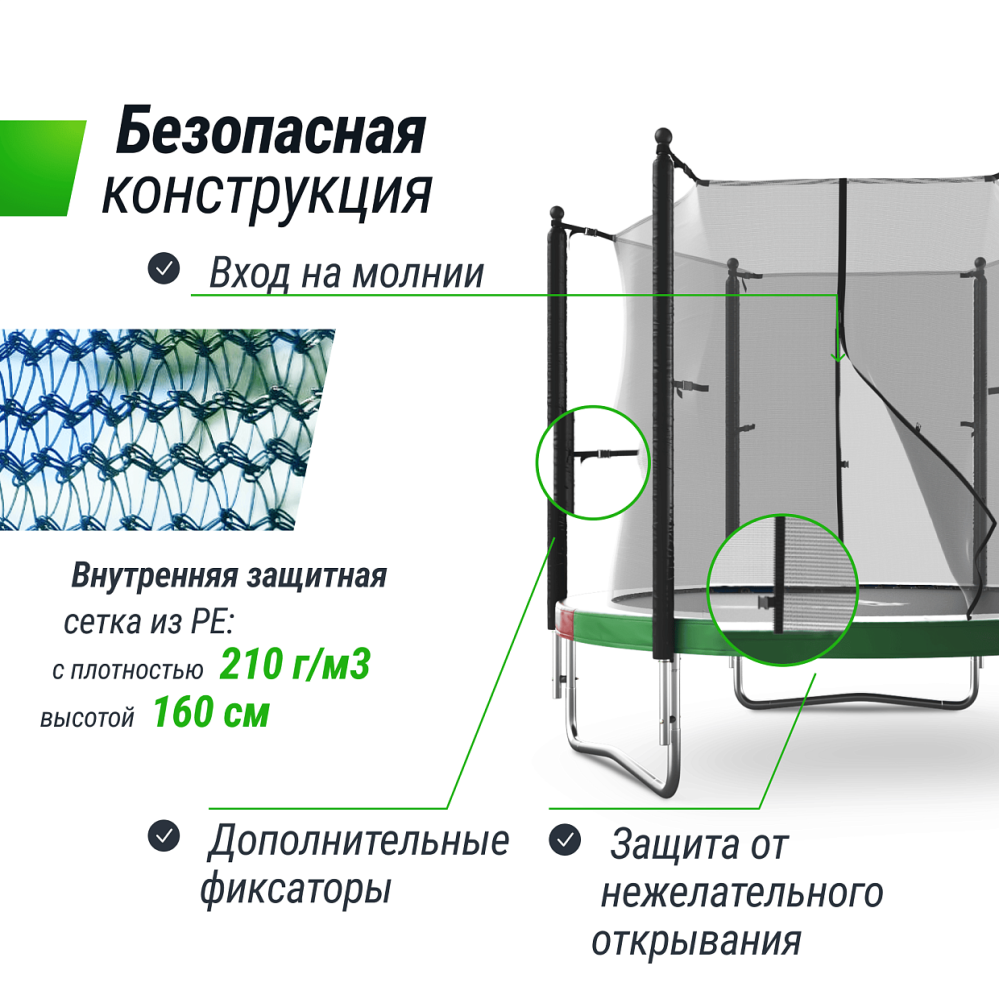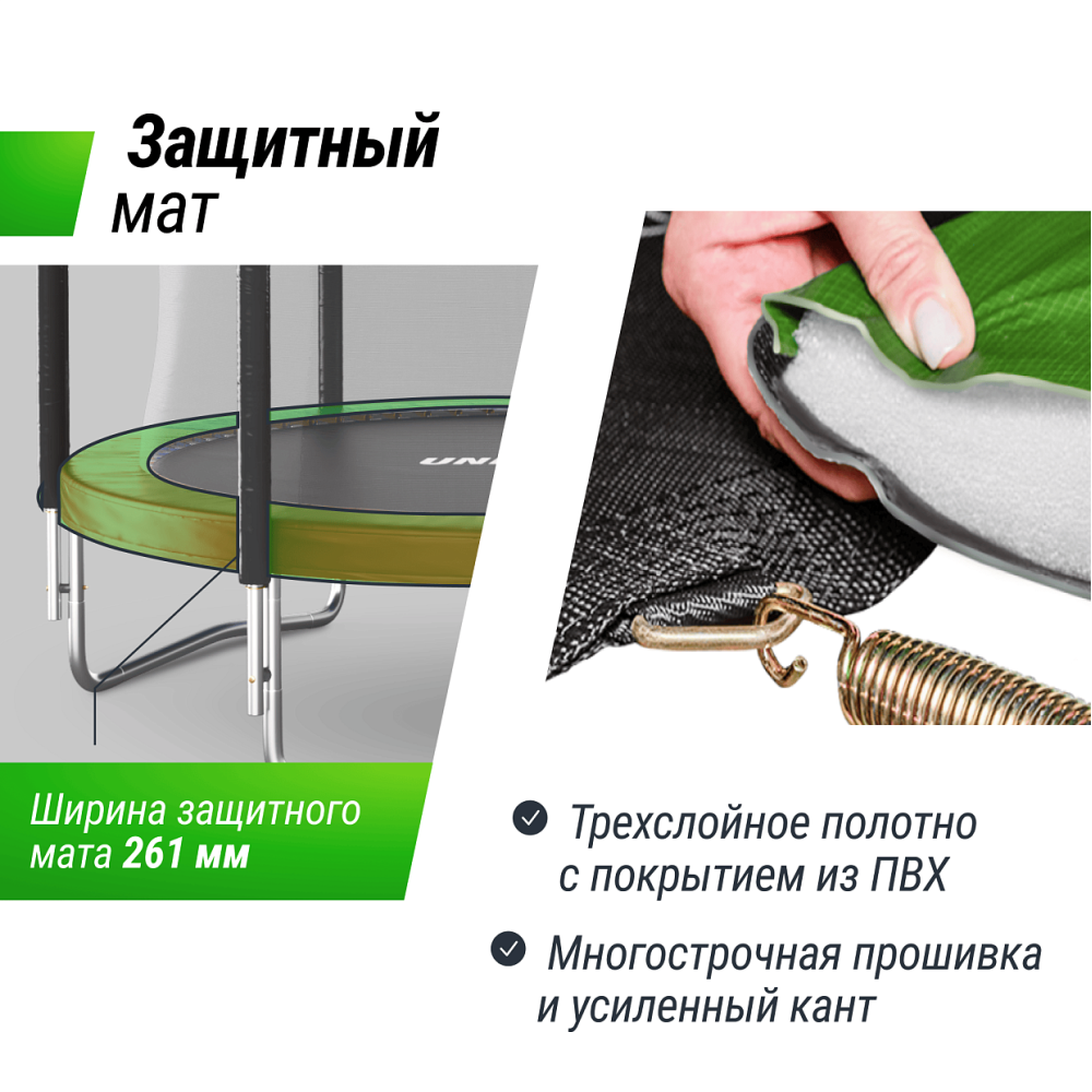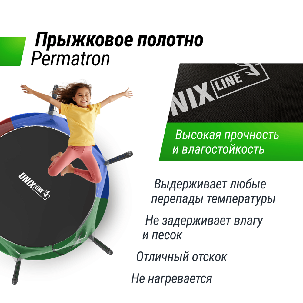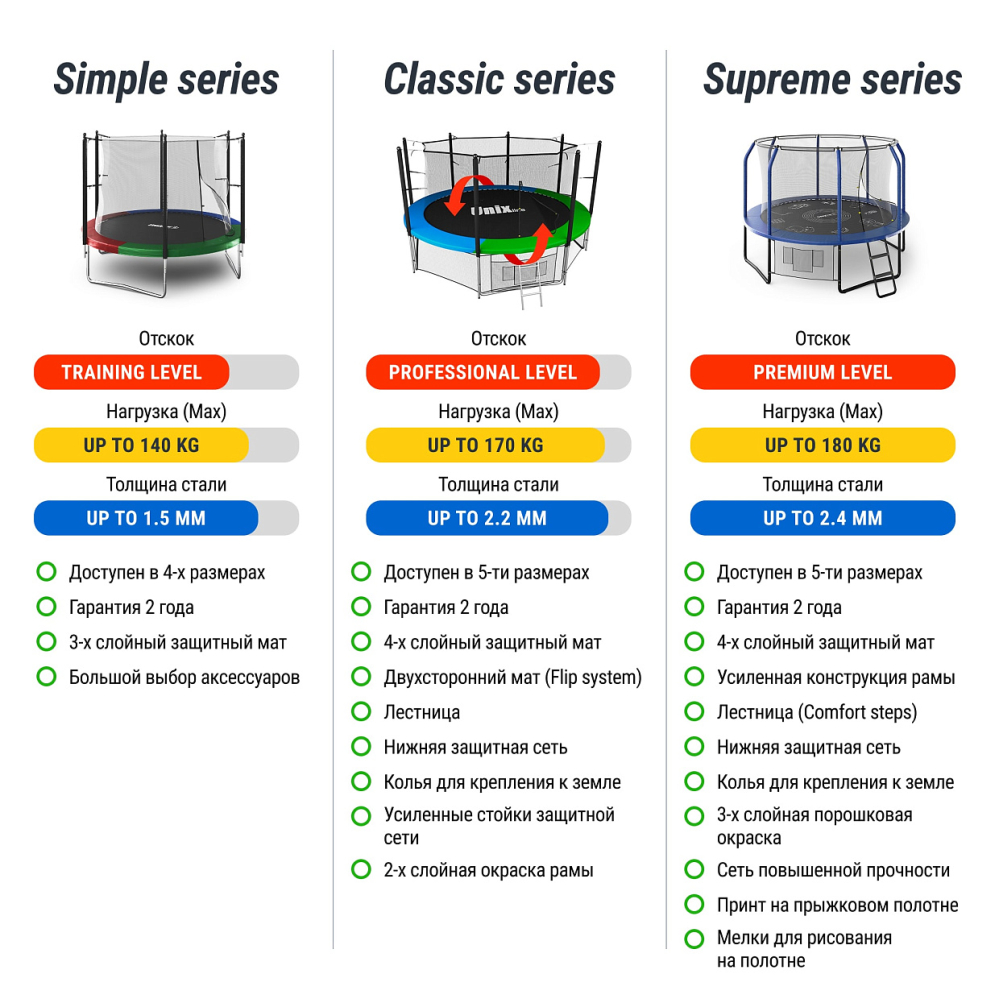 Батуты UNIX Line серии Simple - это простота и легкость сборки, качественные материалы, широкий выбор размеров и цветовых решений. Батут изготовлен из высокопрочной стали толщиной 1,5 мм с двойным слоем оцинкованного антикоррозийного покрытия. Рама соединяется между собой с помощью специального T-connector (2.4 мм), обеспечивая безопасность и надежность во время прыжковых игр. 48 пружин в конструкции каркасного батута обеспечивают отличный отскок, а также прочность и долговечность батута.. . Металлический каркас батутов выполнен из прочной гальванизированной стали, максимально допустимый вес пользователя 140 кг. Прыжковое полотно производится из специального высокопрочного материала Permatron, устойчивого к любым неблагоприятным воздействиям окружающей среды и механическим воздействиям. Permatron – эластичный материал, легко возвращающийся в исходное состояние при постоянном воздействии с разной нагрузкой. Он устойчив к внешним воздействиям: ультрафиолету, плесени, влаге, резким изменениям температуры. Термическая обработка делает эту ткань устойчивой к постоянным изгибам и стрессовым нагрузкам. Прыжковое полотно для батута, изготовленное из перматрона, подходит для применения дома и на улице. Этот материал не боится осадков и воздействия солнечных лучей, также обладает антисептическими свойствами.. . Батут оснащен высокой защитной сеткой высотой 160 см, которая обеспечивает максимальную безопасность при прыжках. Она предотвращает падения и травмы, а также защищает детей от попадания на батут животных или других предметов. Батут UNIX Line серии Simple – это отличный выбор для родителей, которые хотят обеспечить своим детям безопасные и интересные занятия на свежем воздухе. Он поможет развить физические способности детей, а также принесет много радости и удовольствия всей семье. Внутренняя защитная сетка предотвращает попадание ног в блок пружин. Защитная сетка расположена по периметру прыжкового полотна. Сетка изготовлена из качественного и эластичного материала Polyethylene, который более устойчив к воздействию влаги и УФ-излучения. . . Каркасный батут с защитной сеткой безопасный подойдет для тренировок и просто для развлечений, он оснащен двусторонней молнией и дополнительными пластиковыми фиксаторами. Прыжки на батуте — это отличная аэробная нагрузка: улучшения общей физической формы, заряд положительными эмоциями, улучшение работы кардио системы, развитие чувства равновесия и координации, подойдет для пользователей любого возраста. Занятия на свежем воздухе укрепляют иммунитет, повышают выносливость. . . Главным приоритетом компания ставит безопасность детей, поэтому наши батуты изготовлены в соответствии со всеми требованиями из высококачественных материалов. Батут способствует развитию координации движений, баланса и гибкости, что положительно влияет на здоровье и физическую форму детей. Гарантия на батуты составляет 2 года. Серия Simple батутов торговой марки UNIX Line - это простота и легкость сборки, качественные материалы, широкий выбор размеров и цветовых решений. . Доступны другие размеры и варианты батутов серии Simple: Батут UNIX Line Simple 6 ft Green (outside). Батут UNIX Line Simple 6 ft Green (inside). Батут UNIX Line Simple 6 ft Color (outside). Батут UNIX Line Simple 6 ft Color (inside). Батут UNIX Line Simple 8 ft Green (outside). Батут UNIX Line Simple 8 ft Green (inside). Батут UNIX Line Simple 8 ft Color (outside). Батут UNIX Line Simple 8 ft Color (insi