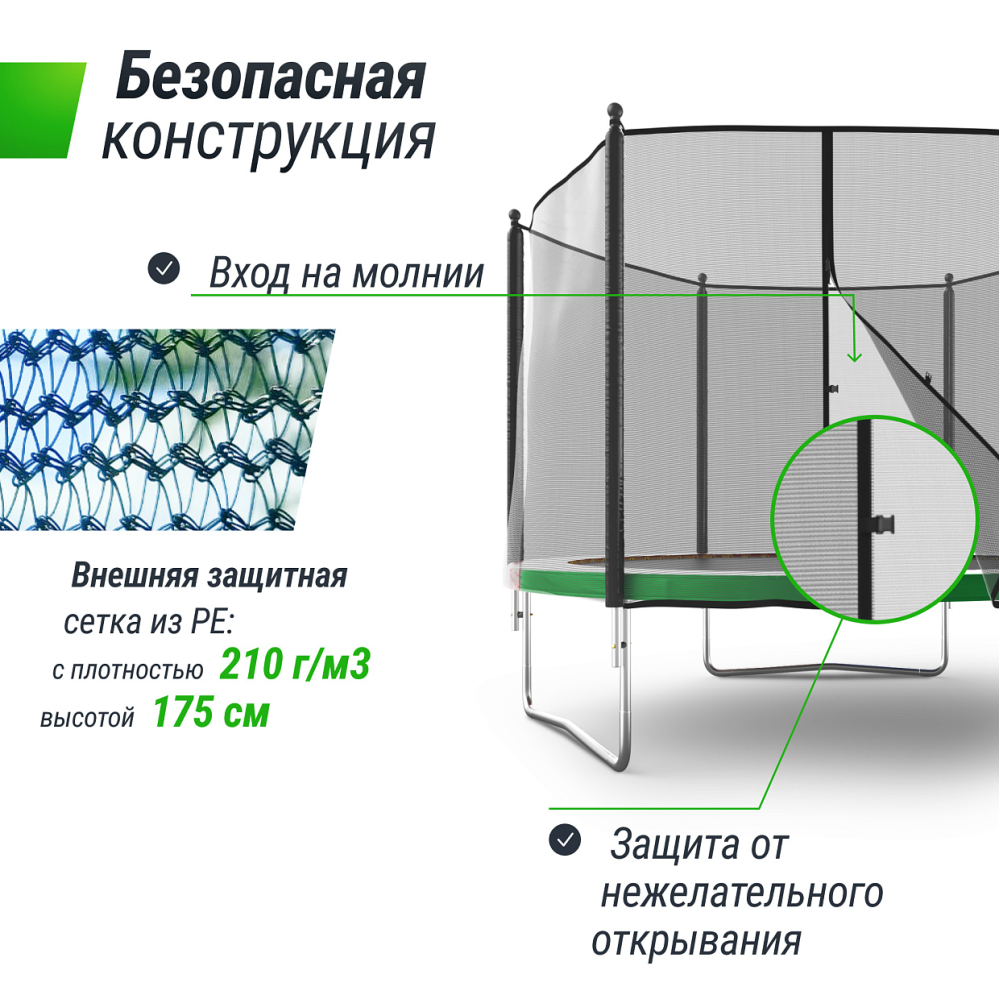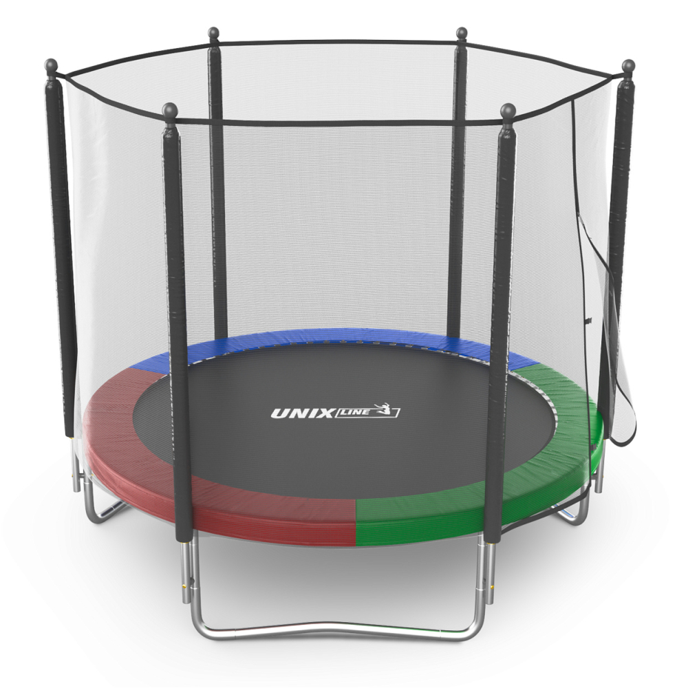 Батуты UNIX Line серии Simple - это простота и легкость сборки, качественные материалы, широкий выбор размеров и цветовых решений. Батут изготовлен из высокопрочной стали толщиной 1,5 мм с двойным слоем оцинкованного антикоррозийного покрытия. Рама соединяется между собой с помощью специального T-connector (2.4 мм), обеспечивая безопасность и надежность во время прыжковых игр. 48 пружин в конструкции каркасного батута обеспечивают отличный отскок, а также прочность и долговечность батута.. . Металлический каркас батутов выполнен из прочной гальванизированной стали, максимально допустимый вес пользователя 140 кг. Прыжковое полотно производится из специального высокопрочного материала Permatron, устойчивого к любым неблагоприятным воздействиям окружающей среды и механическим воздействиям. Permatron – эластичный материал, легко возвращающийся в исходное состояние при постоянном воздействии с разной нагрузкой. Он устойчив к внешним воздействиям: ультрафиолету, плесени, влаге, резким изменениям температуры. Термическая обработка делает эту ткань устойчивой к постоянным изгибам и стрессовым нагрузкам. Прыжковое полотно для батута, изготовленное из перматрона, подходит для применения дома и на улице. Этот материал не боится осадков и воздействия солнечных лучей, также обладает антисептическими свойствами.. . Батут оснащен высокой защитной сеткой высотой 160 см, которая обеспечивает максимальную безопасность при прыжках. Она предотвращает падения и травмы, а также защищает детей от попадания на батут животных или других предметов. Батут UNIX Line серии Simple – это отличный выбор для родителей, которые хотят обеспечить своим детям безопасные и интересные занятия на свежем воздухе. Он поможет развить физические способности детей, а также принесет много радости и удовольствия всей семье. Внешняя защитная сетка предоставляет больше пространства для прыжков. Защитная сетка расположена по периметру рамы батута. Сетка изготовлена из качественного и эластичного материала Polyethylene, который более устойчив к воздействию влаги и УФ-излучения. . . Каркасный батут с защитной сеткой безопасный подойдет для тренировок и просто для развлечений, он оснащен двусторонней молнией и дополнительными пластиковыми фиксаторами. Прыжки на батуте — это отличная аэробная нагрузка: улучшения общей физической формы, заряд положительными эмоциями, улучшение работы кардио системы, развитие чувства равновесия и координации, подойдет для пользователей любого возраста. Занятия на свежем воздухе укрепляют иммунитет, повышают выносливость. . . Главным приоритетом компания ставит безопасность детей, поэтому наши батуты изготовлены в соответствии со всеми требованиями из высококачественных материалов. Батут способствует развитию координации движений, баланса и гибкости, что положительно влияет на здоровье и физическую форму детей. Гарантия на батуты составляет 2 года. . . Серия Simple батутов торговой марки UNIX Line - это простота и легкость сборки, качественные материалы, широкий выбор размеров и цветовых решений. . . . Доступны другие размеры и варианты батутов серии Simple:. . Батут UNIX Line Simple 6 ft Green (outside) Батут UNIX Line Simple 6 ft Green (inside). Батут UNIX Line Simple 6 ft Color (outside). Батут UNIX Line Simple 6 ft Color (inside). Батут UNIX Line Simple 8 ft Green (outside). Батут UNIX Line Simple 8 ft Green (inside). Батут UNIX Line Simple 8 ft Color (outside). Батут UNIX Line Simple 8 ft Color (insid