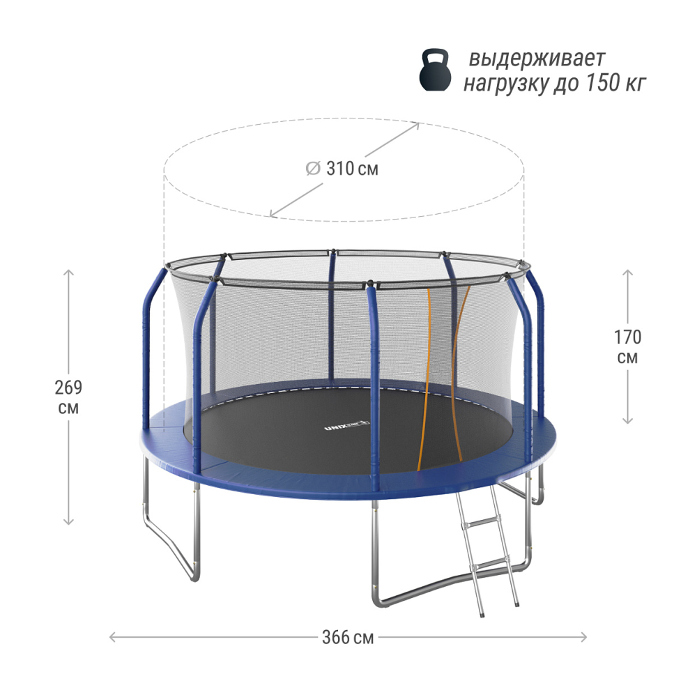 Батуты UNIX Line серии Basic разработаны для ежедневного использования детьми и взрослыми и соответствуют международным стандартам качества ISO 9001. Батут изготовлен из высокопрочной стали толщиной 1,5 мм с двойным слоем оцинкованного антикоррозийного покрытия. Рама соединяется между собой с помощью специального X-connector (2.4 мм), обеспечивая безопасность и надежность во время прыжков. 72 пружины в конструкции каркасного батута обеспечивают отличный отскок, а также прочность и долговечность батута. Устойчивость на поверхности гарантируют 4 опорные стойки W-образной формы.. . Максимально допустимый вес пользователя 150 кг. Прыжковое полотно выполнено из специального высокопрочного материала Permatron с пропиткой, устойчивого к любым неблагоприятным воздействиям окружающей среды и механическим воздействиям. Permatron – эластичный материал, легко возвращающийся в исходное состояние при постоянном воздействии с разной нагрузкой. Он устойчив к внешним воздействиям: ультрафиолету, плесени, влаге, резким изменениям температуры. Термическая обработка делает эту ткань устойчивой к постоянным изгибам и стрессовым нагрузкам. Прыжковое полотно для батута, изготовленное из перматрона, подходит для применения дома и на улице. Этот материал не боится осадков и воздействия солнечных лучей, также обладает антисептическими свойствами. Благодаря мягкому мату, который надежно защищает пользователей от любых падений, батуты Supreme Basic Series идеально подходят для семейного использования. Вертикальные стойки защищены мягкими чехлами. . . Батут оснащен высокой защитной сеткой высотой 170 см, которая обеспечивает максимальную безопасность при прыжках. Она предотвращает падения и травмы, а также защищает детей от попадания на батут животных или других предметов. Батут UNIX Line – это отличный выбор для родителей, которые хотят обеспечить своим детям безопасные и интересные занятия на свежем воздухе. Он поможет развить физические способности детей, а также принесет много радости и удовольствия всей семье. Внутренняя защитная сетка предотвращает попадание ног в блок пружин. Защитная сетка расположена по периметру прыжкового полотна. Сетка изготовлена из качественного и эластичного материала Polyethylene, который более устойчив к воздействию влаги и УФ-излучения. . . Каркасный батут с защитной сеткой безопасный подойдет для тренировок и просто для развлечений, он оснащен двусторонней молнией и дополнительными пластиковыми фиксаторами. Прыжки на батуте — это отличная аэробная нагрузка: улучшения общей физической формы, заряд положительными эмоциями, улучшение работы кардио системы, развитие чувства равновесия и координации, подойдет для пользователей любого возраста. Занятия на свежем воздухе укрепляют иммунитет, повышают выносливость. Прыжковое полотно создано из профессионального материала, преимуществом которого является возможность использования под открытым небом (не задерживает воду, не нагревается).. . Главным приоритетом компания ставит безопасность детей, поэтому наши батуты изготовлены в соответствии со всеми требованиями из высококачественных материалов. Батут способствует развитию координации движений, баланса и гибкости, что положительно влияет на здоровье и физическую форму детей. Гарантия на батуты составляет 2 года. В комплекте с батутом пр