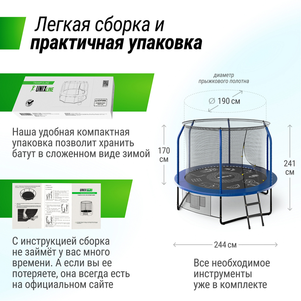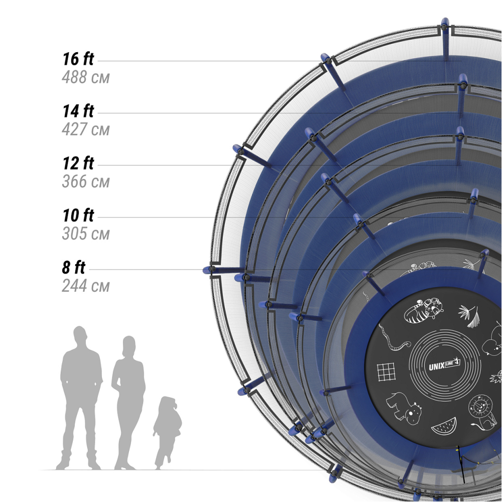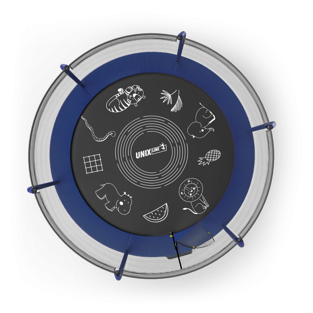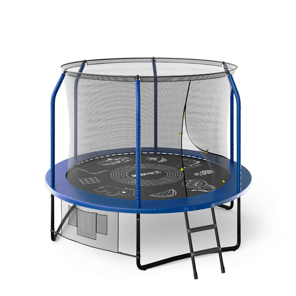 Батуты UNIX Line серии Supreme Game разработаны для ежедневного использования детьми и взрослыми и соответствуют международным стандартам качества ISO 9001. Батут изготовлен из высокопрочной стали толщиной 1,6 мм с двойным слоем оцинкованного антикоррозийного покрытия. Рама соединяется между собой с помощью специального X-connector (2.4 мм), обеспечивая безопасность и надежность во время прыжков. 48 пружин в конструкции каркасного батута обеспечивают отличный отскок, а также прочность и долговечность батута. Устойчивость на поверхности гарантируют 3 опорные стойки W-образной формы.. . Максимально допустимый вес пользователя 150 кг. Прыжковое полотно выполнено из специального высокопрочного материала Permatron с пропиткой, устойчивого к любым неблагоприятным воздействиям окружающей среды и механическим воздействиям. Permatron – эластичный материал, легко возвращающийся в исходное состояние при постоянном воздействии с разной нагрузкой. Он устойчив к внешним воздействиям: ультрафиолету, плесени, влаге, резким изменениям температуры. Термическая обработка делает эту ткань устойчивой к постоянным изгибам и стрессовым нагрузкам. Прыжковое полотно для батута, изготовленное из перматрона, подходит для применения дома и на улице. Этот материал не боится осадков и воздействия солнечных лучей, также обладает антисептическими свойствами. Благодаря мягкому мату, который надежно защищает пользователей от любых падений, батуты Supreme Game Series идеально подходят для семейного использования. Защитный мат для пружин, расположенный по периметру батута, состоит из четырех слоев, обшитых ПВХ материалом, плотностью 150 г/см3 и надежно закрывает пружины.. . Батут оснащен высокой защитной сеткой высотой 170 см, которая обеспечивает максимальную безопасность при прыжках. Она предотвращает падения и травмы, а также защищает детей от попадания на батут животных или других предметов. Батут UNIX Line – это отличный выбор для родителей, которые хотят обеспечить своим детям безопасные и интересные занятия на свежем воздухе. Он поможет развить физические способности детей, а также принесет много радости и удовольствия всей семье. Внутренняя защитная сетка предотвращает попадание ног в блок пружин. Защитная сетка расположена по периметру прыжкового полотна. Сетка изготовлена из качественного и эластичного материала Polyethylene, который более устойчив к воздействию влаги и УФ-излучения. . . Каркасный батут с защитной сеткой безопасный подойдет для тренировок и просто для развлечений, он оснащен двусторонней молнией и дополнительными пластиковыми фиксаторами. Прыжки на батуте — это отличная аэробная нагрузка: улучшения общей физической формы, заряд положительными эмоциями, улучшение работы кардио системы, развитие чувства равновесия и координации, подойдет для пользователей любого возраста. Занятия на свежем воздухе укрепляют иммунитет, повышают выносливость. Прыжковое полотно создано из профессионального материала, преимуществом которого является возможность использования под открытым небом (не задерживает воду, не нагревается).. . Главным приоритетом компания ставит безопасность детей, поэтому наши батуты изготовлены в соответствии со всеми требованиями из высококачественных материалов. Батут способствует развитию координации движений, баланса и гибкости, что положит