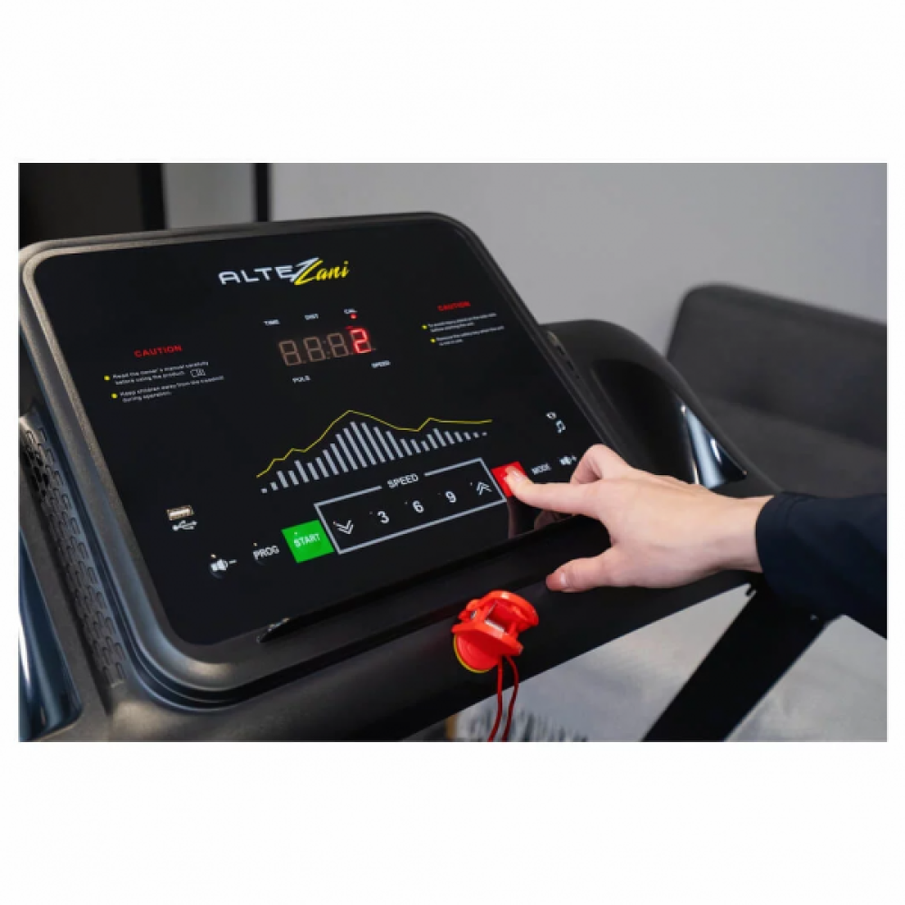 Благодаря пневматической системе складывания, при необходимости дорожку можно убрать и она не займет много свободного места в помещении. При этом Altezani ALS 1120 имеет усиленный металлический каркас, который дает возможность использовать тренажер людям до 110 кг.