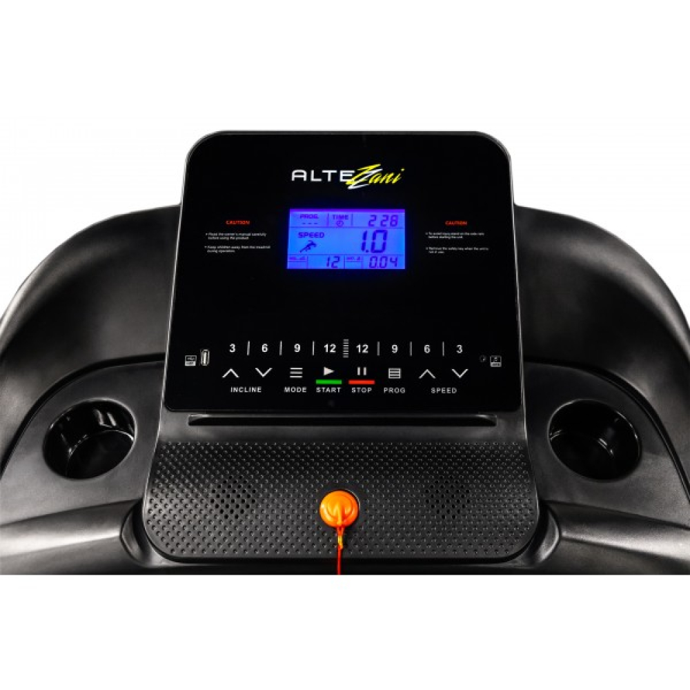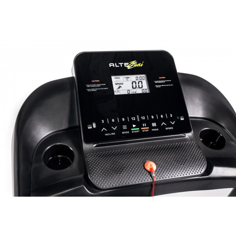 А для того, что бы тренировка была не только полезной, но и максимально комфортной, беговая дорожка Altezani ALS1200 оборудована надежным LCD дисплеем на котором пользователь может отслеживать такие показатели как: скорость, время тренировки, дистанцию, потраченные калории, наклон и пульс, а также, имеет MP3, USB – вход.