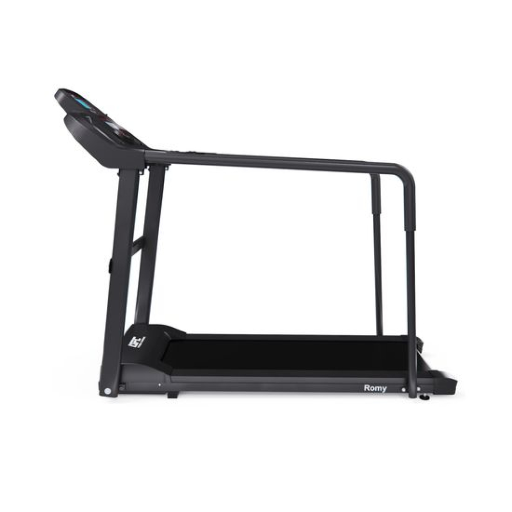 Электрическая беговая дорожка DFC Romy — идеальный выбор для домашнего использования, обеспечивающий комфортные условия для тренировок в спортивных и реабилитационных целях. Модель отличается присутствием в комплектации специальных удлинённых поручней для реабилитационных занятий.С максимальным весом пользователя до 125 кг и мощным двигателем с пиковым значением 2 л/с, эта модель подходит как для начинающих, так и для опытных спортсменов. Скоростной диапазон от 0,8 до 14 км/ч позволяет легко адаптировать тренировки под ваши индивидуальные потребности.Беговое полотно обеспечивает достаточное пространство для комфортного бега или ходьбы. Система амортизации с 4 амортизаторами снижает нагрузку на суставы, что делает тренировки более безопасными и приятными.Беговая дорожка оснащена монохромным LCD-дисплеем, а для разнообразия тренировок предусмотрено 12 предустановленных программ, что позволяет вам настроить занятия под свои цели. Измерение пульса осуществляется с помощью сенсорных датчиков на поручнях.Дополнительные удобства включают транспортировочные ролики для легкого перемещения и подставку под планшет, чтобы вы могли наслаждаться любимыми фильмами или музыкой во время тренировки, а карманы для мелочей помогут вам удобно разместить необходимые аксессуары.