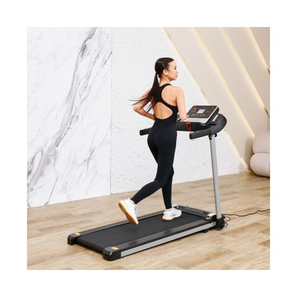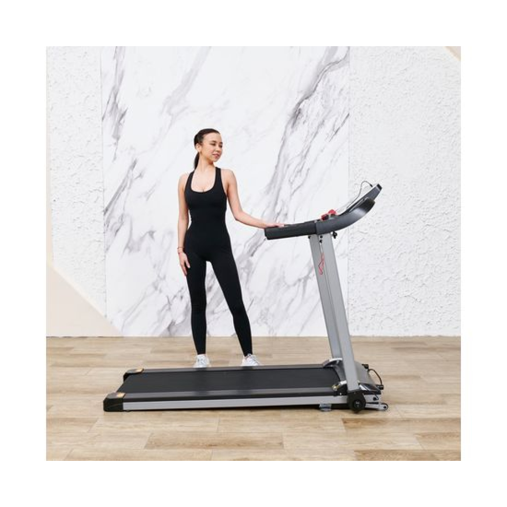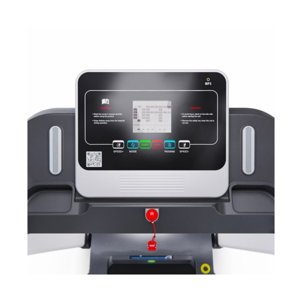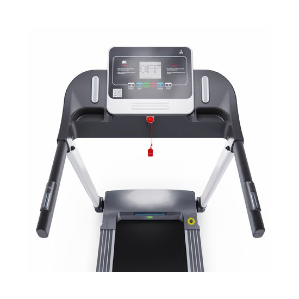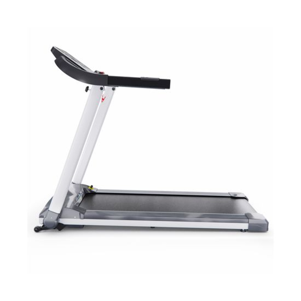 Беговая дорожка DFC T-X510 — отличный выбор для занятий спортом дома. Она оснащена электрическим двигателем с пиковой мощностью 3 л.с., который позволяет развивать скорость от 1 до 12 км/ч. Беговое полотно имеет размеры 121 х 41 см (в развёрнутом виде — 252 х 41 см), что обеспечивает комфорт во время тренировки. Амортизационная система состоит из 6 амортизаторов, которые снижают нагрузку на суставы и позвоночник.Для удобства пользователей предусмотрены сенсорные датчики пульса на поручнях, транспортировочные ролики и компенсаторы неровности пола. Монохромный LCD-дисплей размером 4 дюйма отображает время, скорость, дистанцию, калории и пульс. В дорожке есть MP3-вход и 12 встроенных программ, а также поддержка приложения SPAX с помощью Bluetooth-соединения.Максимальный вес пользователя составляет 120 кг, что делает эту модель подходящей для большинства людей. Дорожка легко складывается, что облегчает её хранение. В комплекте идут держатель для планшета и бутылки.