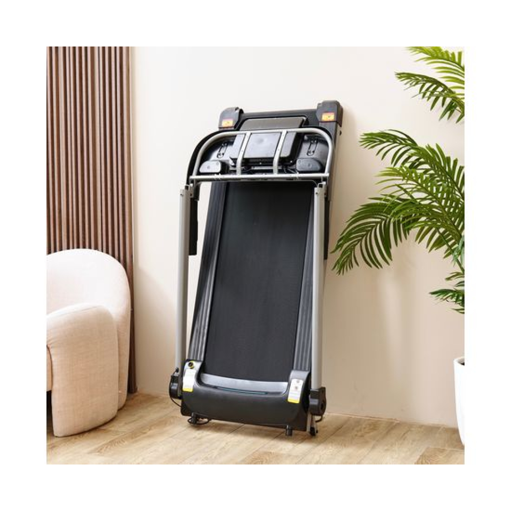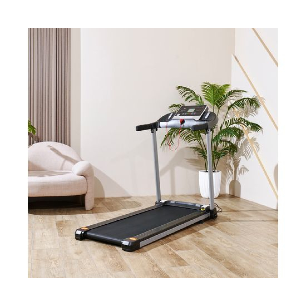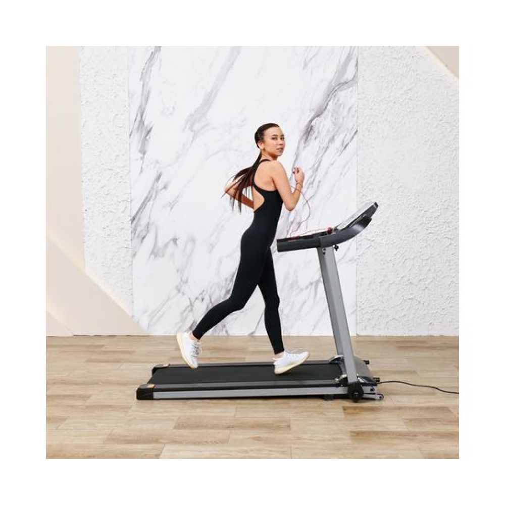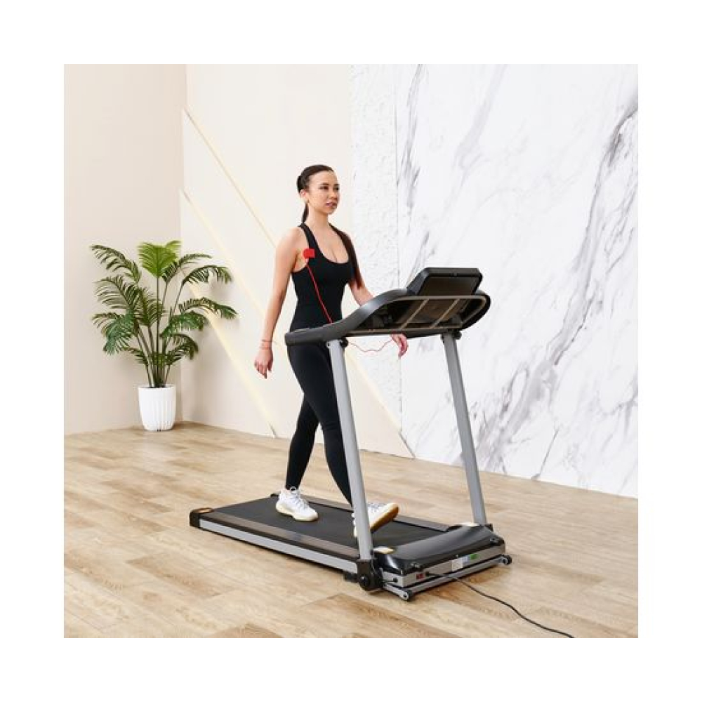 Беговая дорожка DFC T-X510 — отличный выбор для занятий спортом дома. Она оснащена электрическим двигателем с пиковой мощностью 3 л.с., который позволяет развивать скорость от 1 до 12 км/ч. Беговое полотно имеет размеры 121 х 41 см (в развёрнутом виде — 252 х 41 см), что обеспечивает комфорт во время тренировки. Амортизационная система состоит из 6 амортизаторов, которые снижают нагрузку на суставы и позвоночник.Для удобства пользователей предусмотрены сенсорные датчики пульса на поручнях, транспортировочные ролики и компенсаторы неровности пола. Монохромный LCD-дисплей размером 4 дюйма отображает время, скорость, дистанцию, калории и пульс. В дорожке есть MP3-вход и 12 встроенных программ, а также поддержка приложения SPAX с помощью Bluetooth-соединения.Максимальный вес пользователя составляет 120 кг, что делает эту модель подходящей для большинства людей. Дорожка легко складывается, что облегчает её хранение. В комплекте идут держатель для планшета и бутылки.