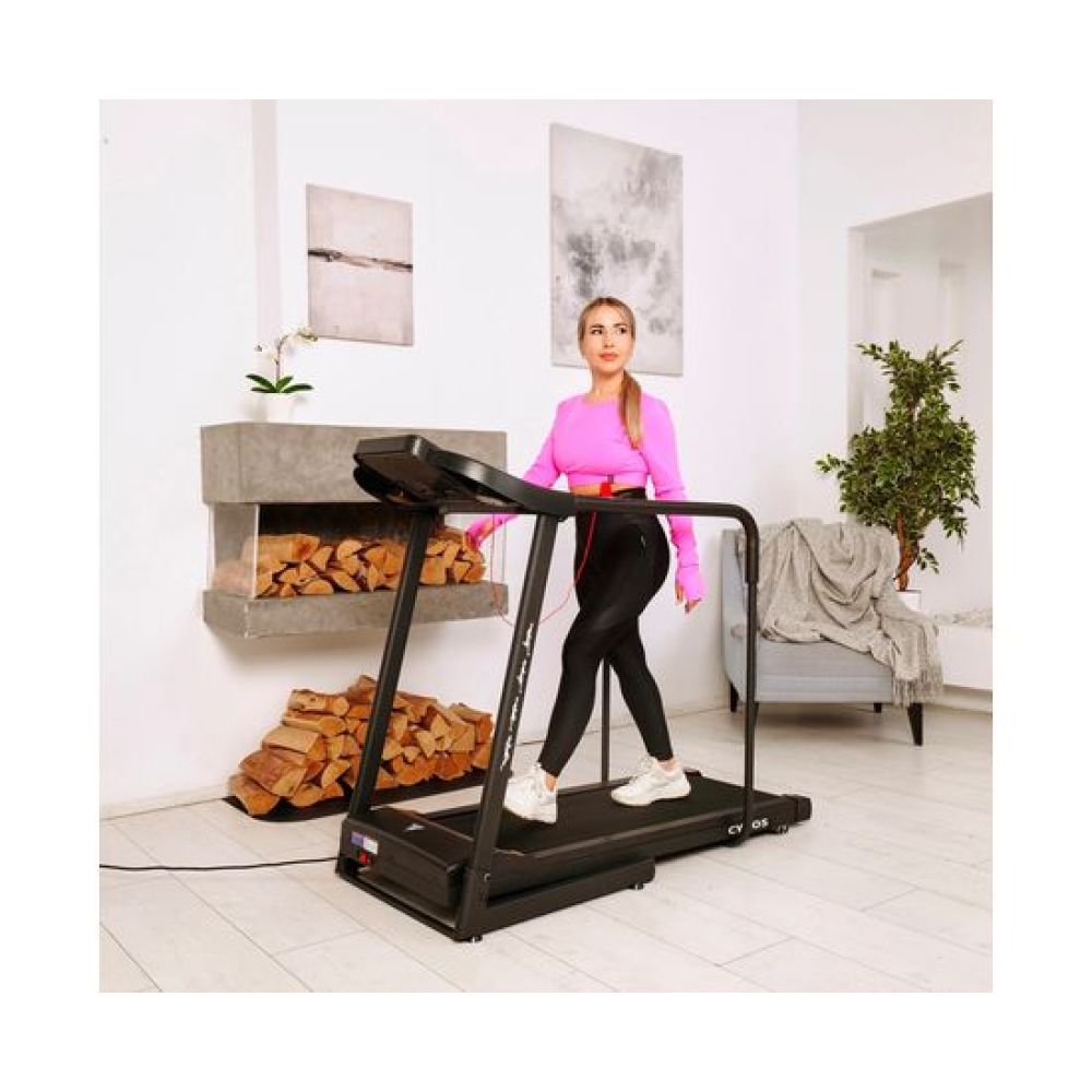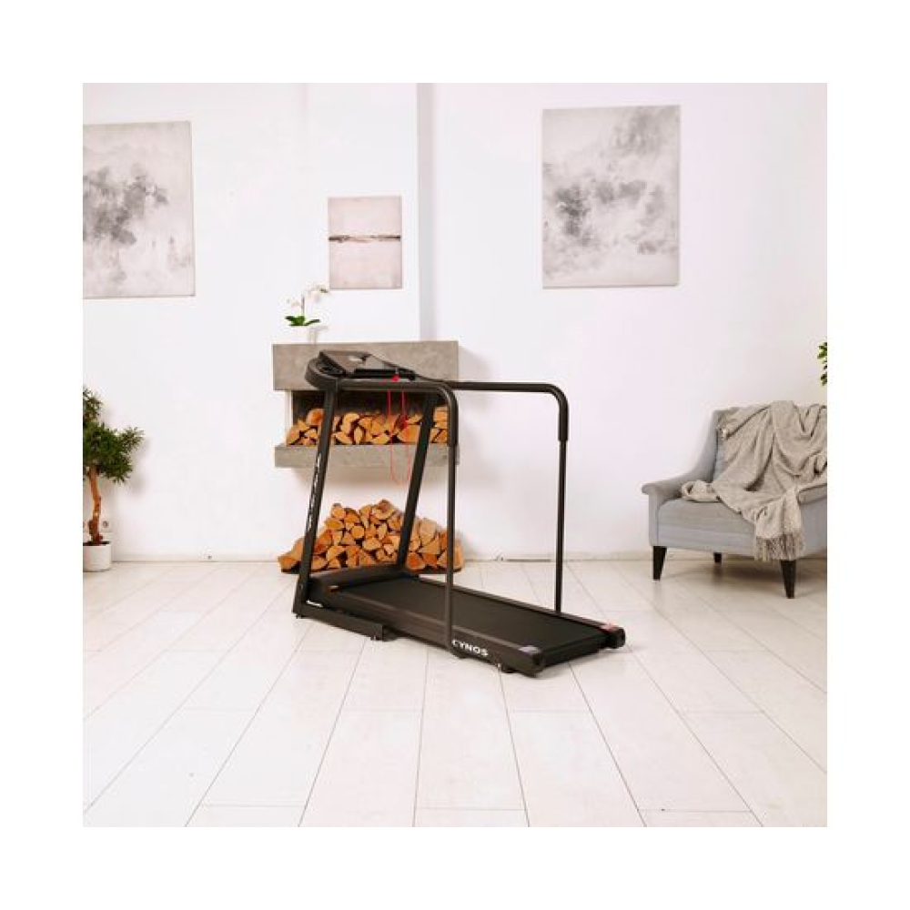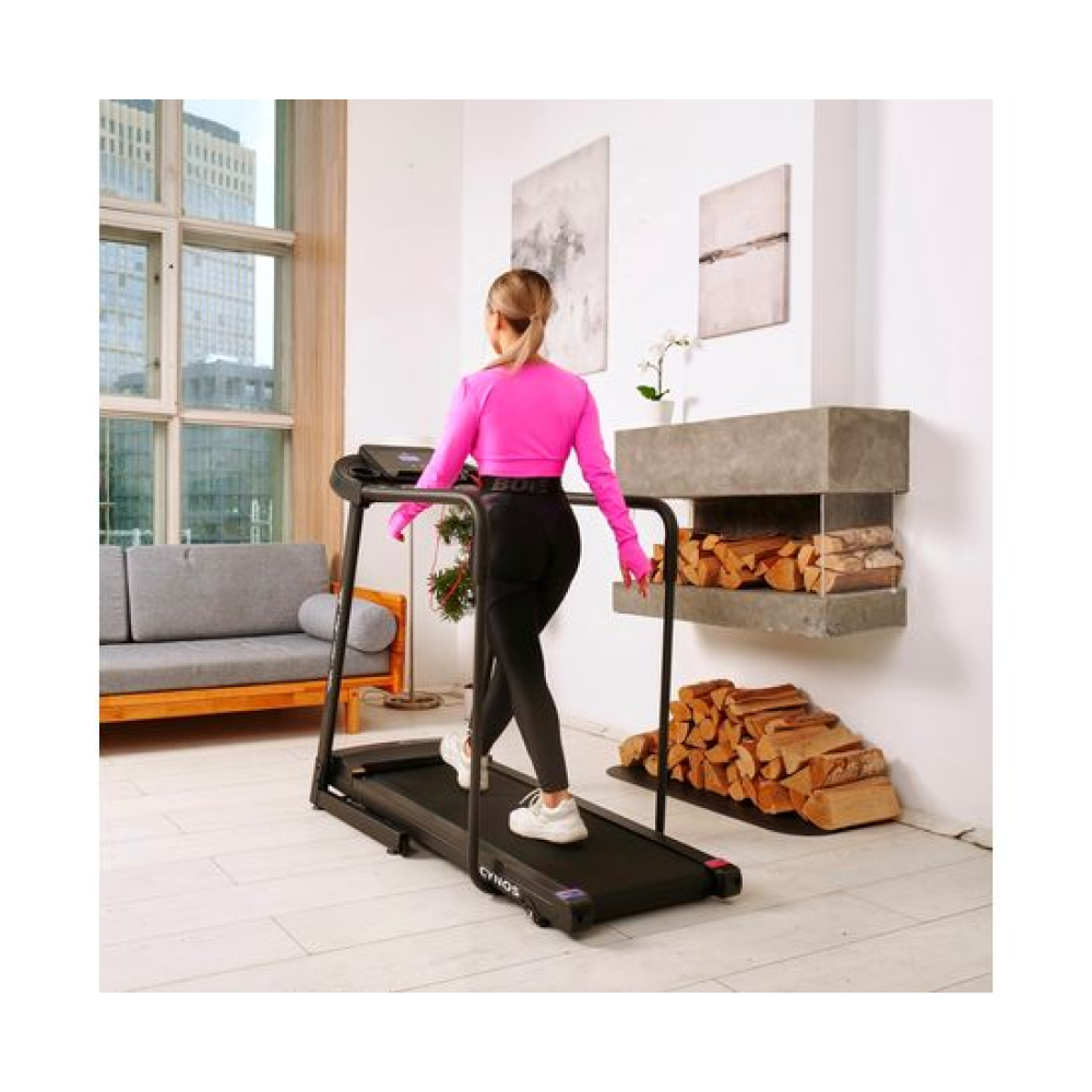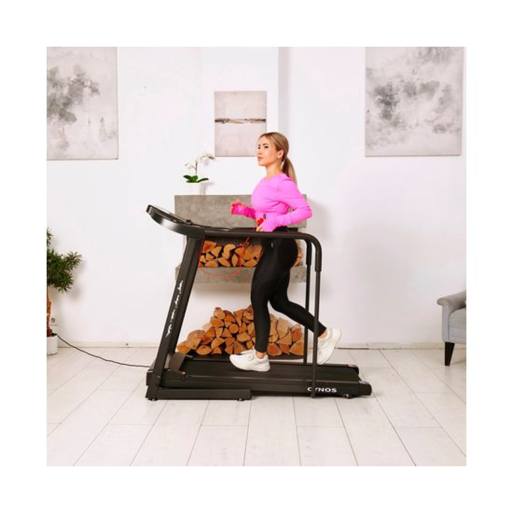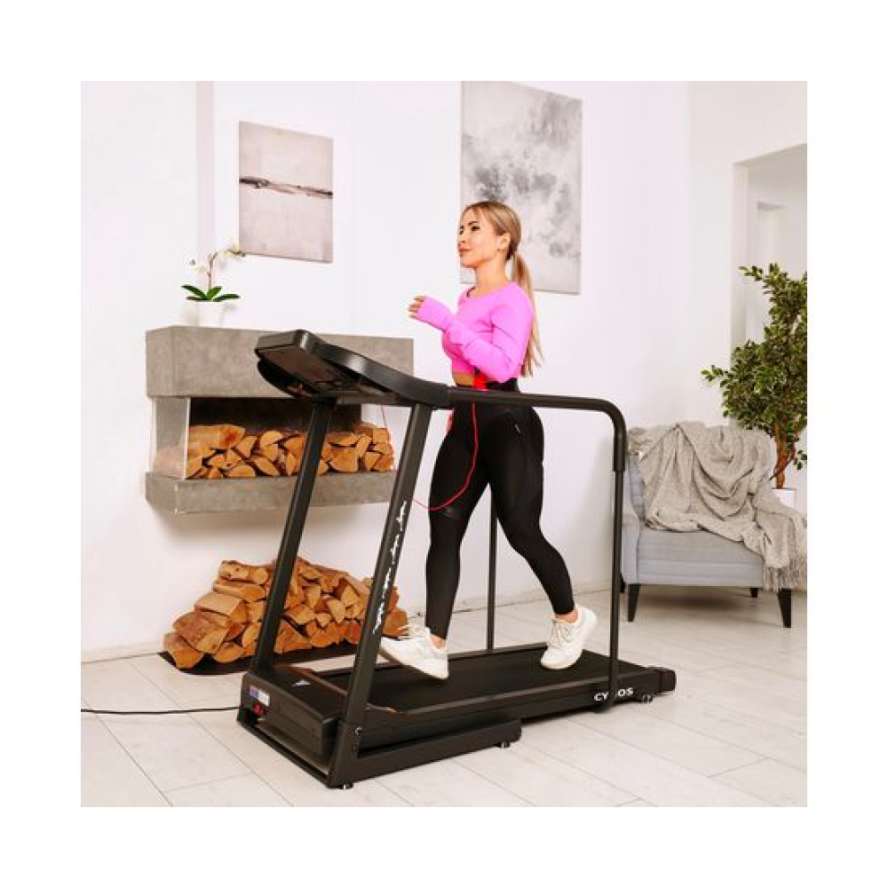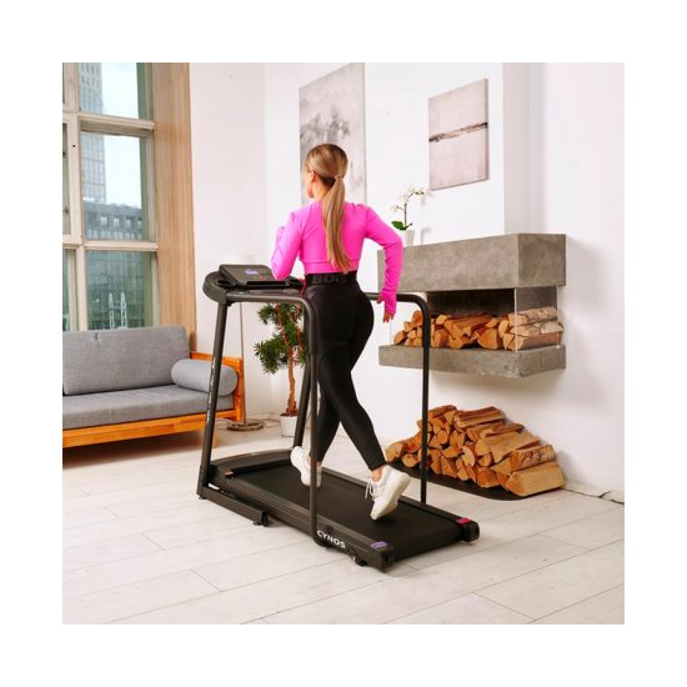 CYNOS — электрическая беговая дорожка чёрного цвета для домашнего применения и использования в спортивных и реабилитационных целях. Модель отличается присутствием в комплектации специальных удлинённых поручней для реабилитационных занятий, возможностью регулировки наклона бегового полотна в трёх положениях.Универсальное применениеЭта модель беговой дорожки универсальна. Может использоваться для частных тренировок в домашних условиях при различных нагрузках. Входящие в комплект поручни превращают её в эффективный тренажёр для реабилитации после перенесённых заболеваний и операций на опорно-двигательном аппарате. Для обоих случаев предусмотрены подходящие программы тренировок.Удобство занятийДля максимального комфорта во время тренировок предусмотрены подставка для планшета, две ниши для стаканов или бутылки с водой. На поручнях расположены кнопки регулировки скорости, а также датчики пульса. Имеется 12 встроенных программ тренировок, а также возможность вручную отрегулировать угол наклона в 3-х положениях. Дорожка развивает скорость до 12 километров в час. Шаг изменения скорости беговой дорожки 0,1 км/ч. Предназначена для людей, чей вес не превышает 120 кг.Компактное хранениеБеговая дорожка CYNOS имеет складную конструкцию. В сложенном виде она занимает минимум места, что удобно для небольших квартир. Есть два варианта хранения: с поручнями или без них. Первый подходит, если нужно регулярное использование дорожки. Во втором случае поручни снимаются для более длительного и компактного хранения (например, в кладовой). Транспортировочные ролики позволяют легко перемещать её при необходимости.