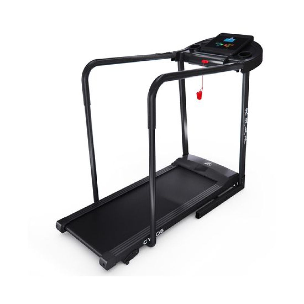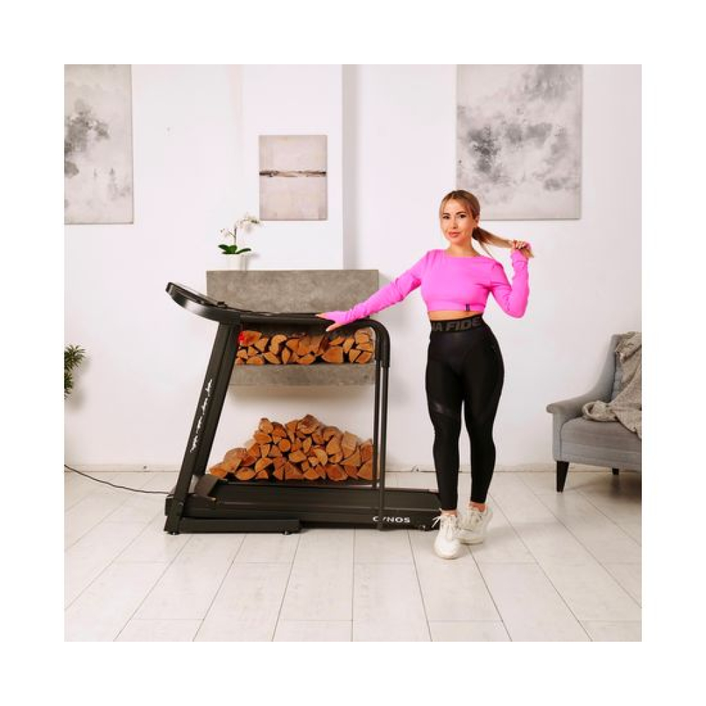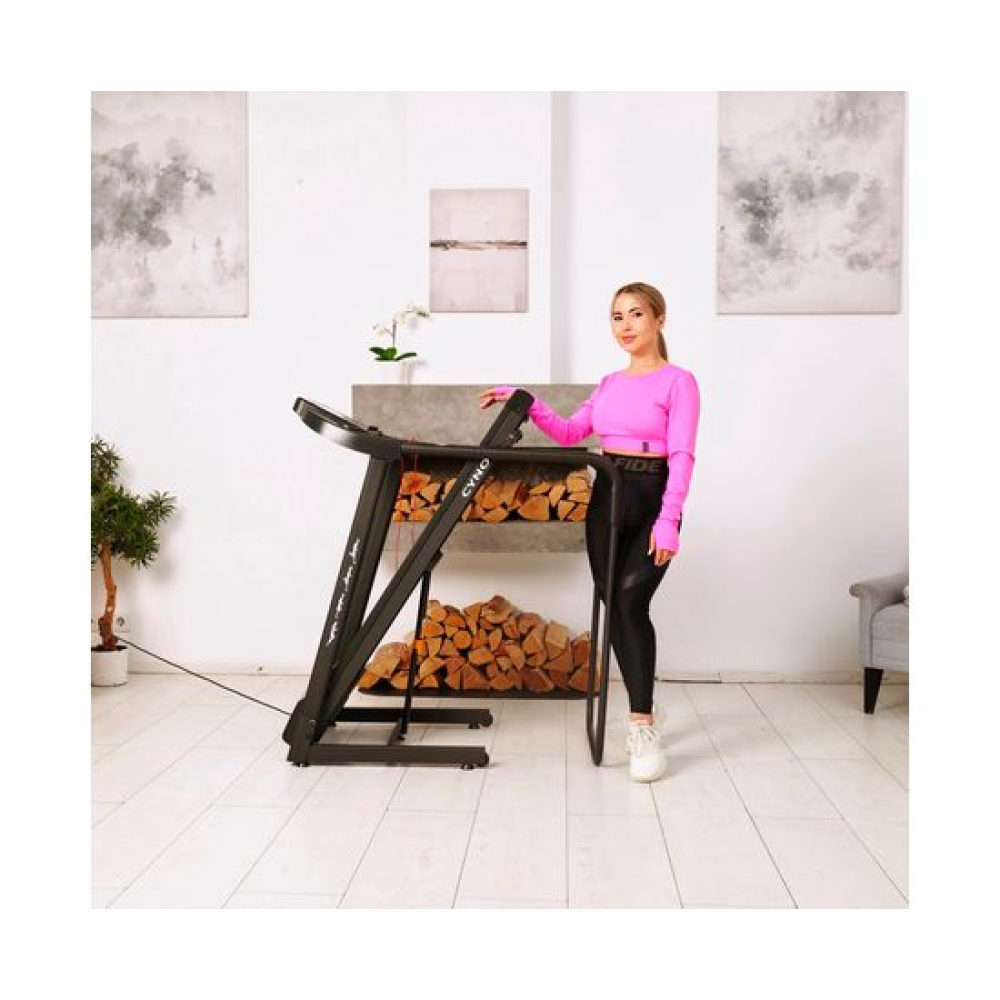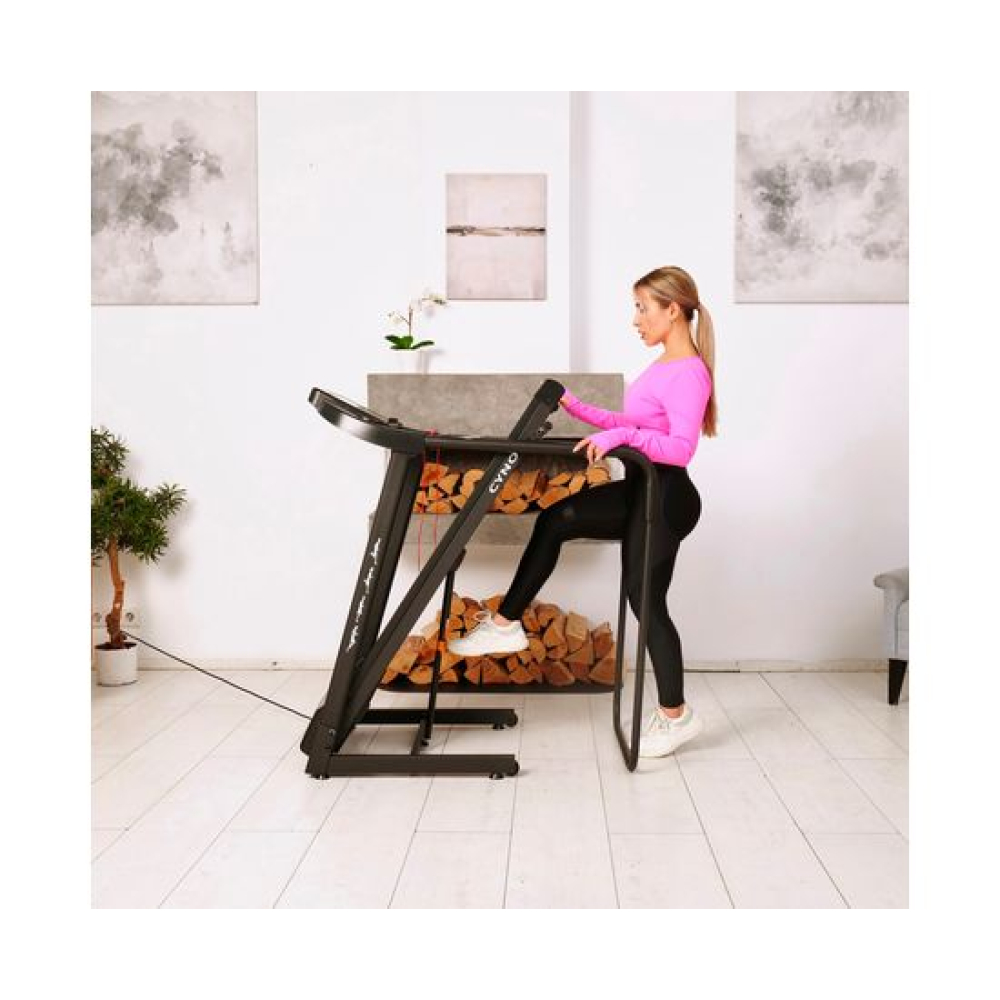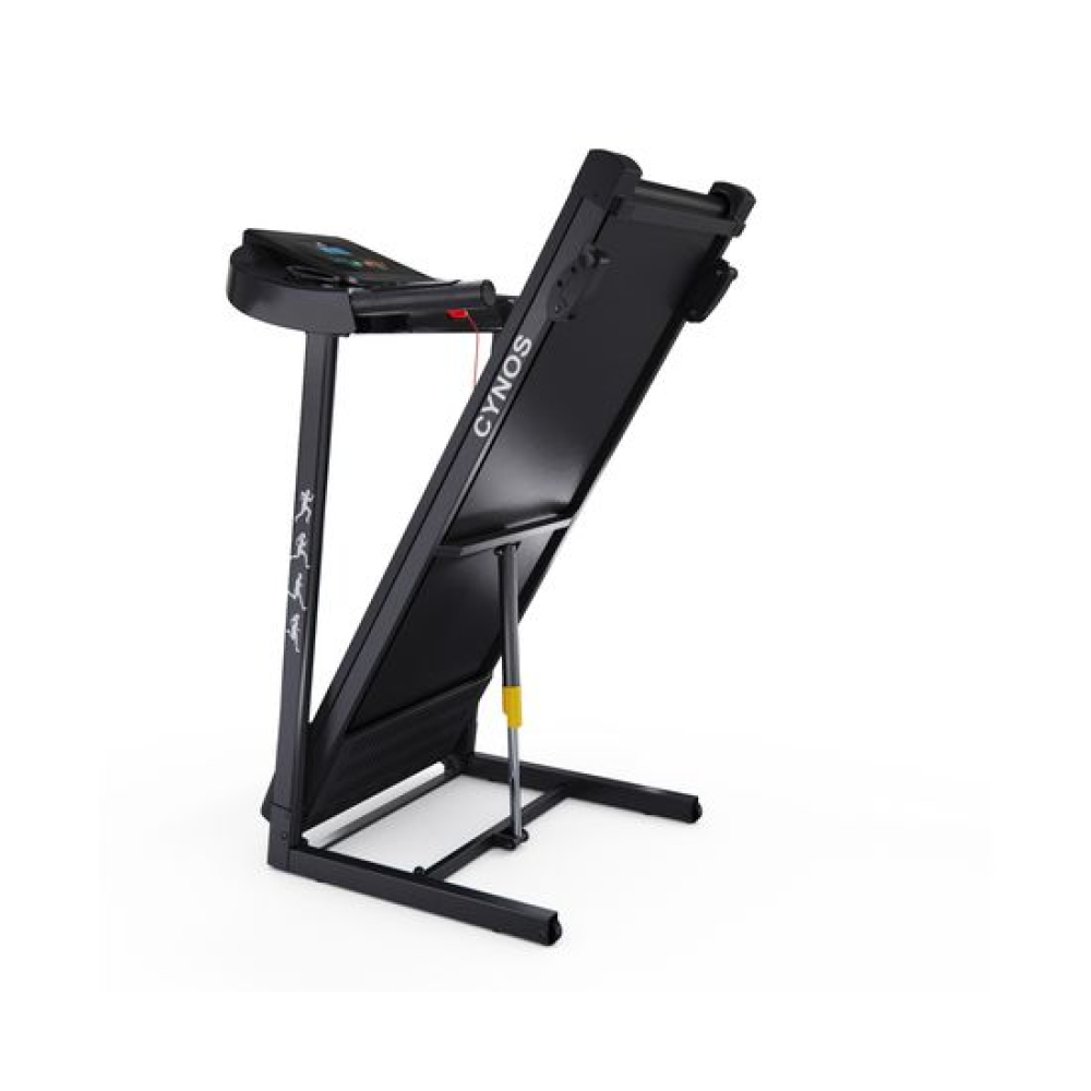 CYNOS — электрическая беговая дорожка чёрного цвета для домашнего применения и использования в спортивных и реабилитационных целях. Модель отличается присутствием в комплектации специальных удлинённых поручней для реабилитационных занятий, возможностью регулировки наклона бегового полотна в трёх положениях.Универсальное применениеЭта модель беговой дорожки универсальна. Может использоваться для частных тренировок в домашних условиях при различных нагрузках. Входящие в комплект поручни превращают её в эффективный тренажёр для реабилитации после перенесённых заболеваний и операций на опорно-двигательном аппарате. Для обоих случаев предусмотрены подходящие программы тренировок.Удобство занятийДля максимального комфорта во время тренировок предусмотрены подставка для планшета, две ниши для стаканов или бутылки с водой. На поручнях расположены кнопки регулировки скорости, а также датчики пульса. Имеется 12 встроенных программ тренировок, а также возможность вручную отрегулировать угол наклона в 3-х положениях. Дорожка развивает скорость до 12 километров в час. Шаг изменения скорости беговой дорожки 0,1 км/ч. Предназначена для людей, чей вес не превышает 120 кг.Компактное хранениеБеговая дорожка CYNOS имеет складную конструкцию. В сложенном виде она занимает минимум места, что удобно для небольших квартир. Есть два варианта хранения: с поручнями или без них. Первый подходит, если нужно регулярное использование дорожки. Во втором случае поручни снимаются для более длительного и компактного хранения (например, в кладовой). Транспортировочные ролики позволяют легко перемещать её при необходимости.