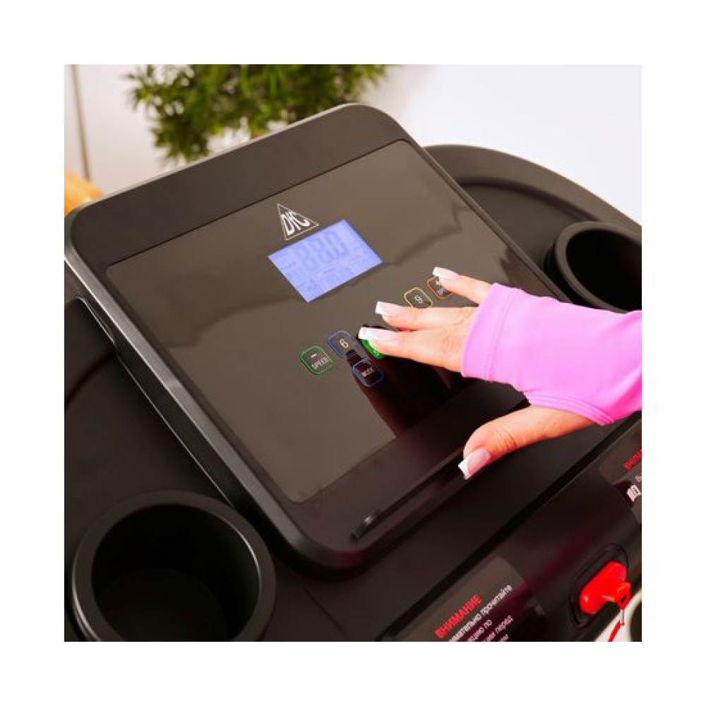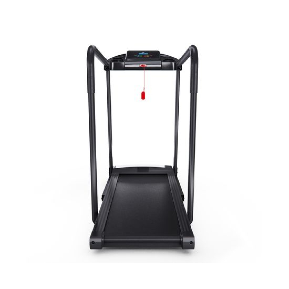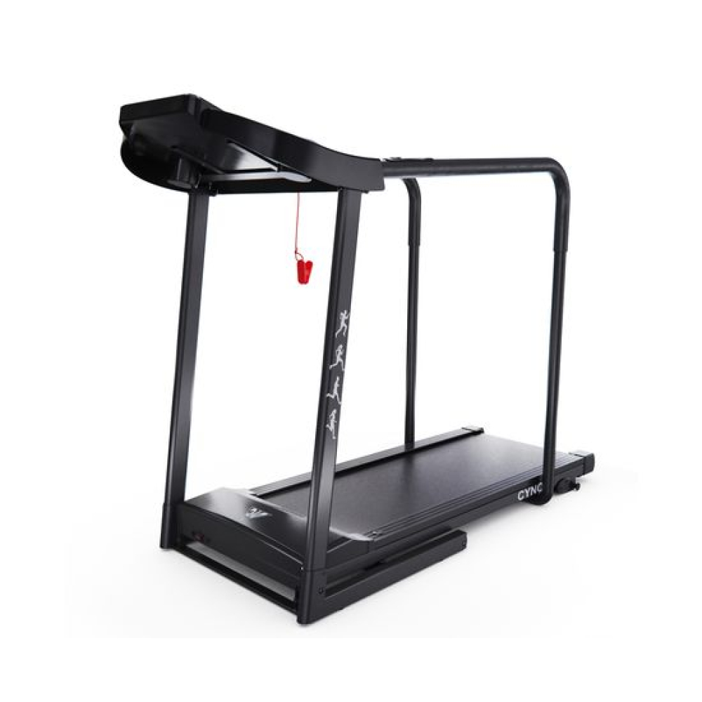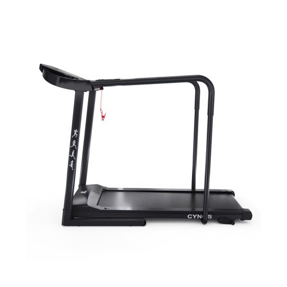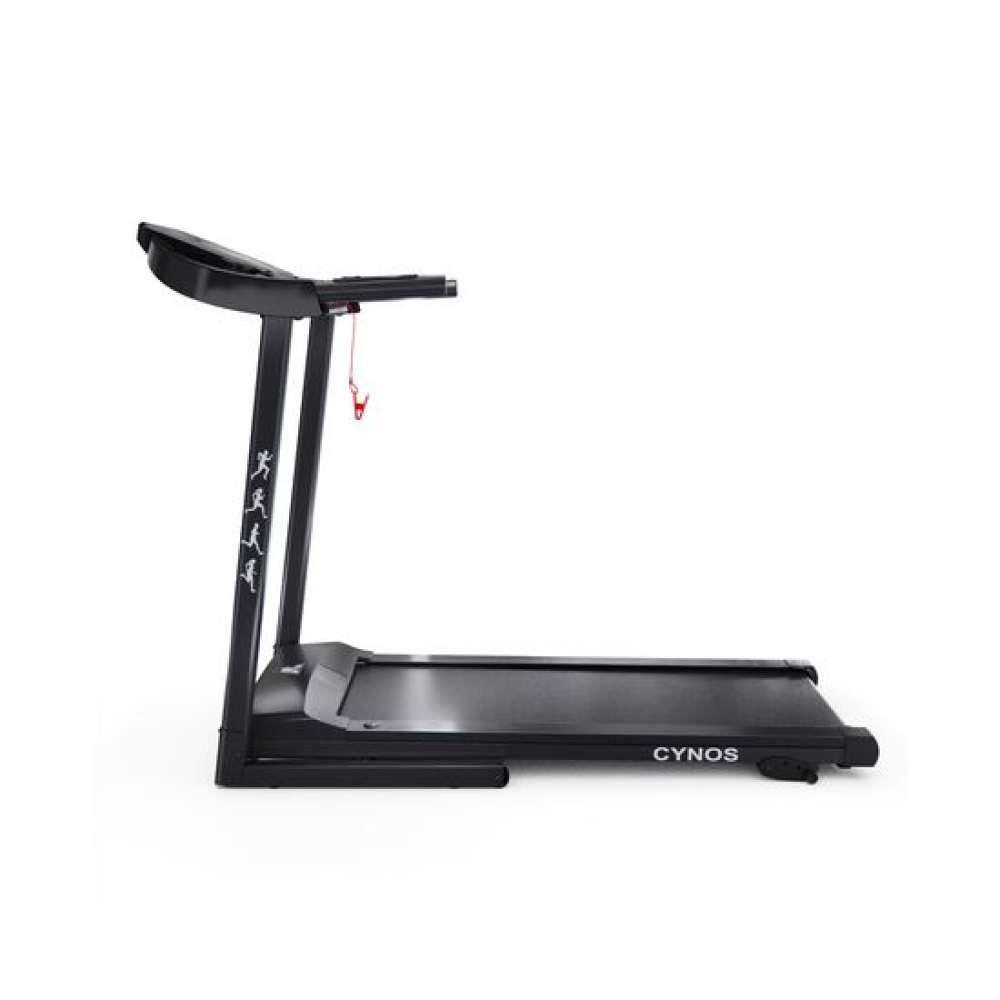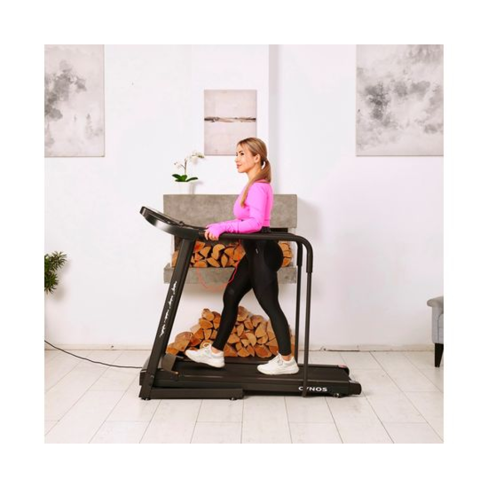 CYNOS — электрическая беговая дорожка чёрного цвета для домашнего применения и использования в спортивных и реабилитационных целях. Модель отличается присутствием в комплектации специальных удлинённых поручней для реабилитационных занятий, возможностью регулировки наклона бегового полотна в трёх положениях.Универсальное применениеЭта модель беговой дорожки универсальна. Может использоваться для частных тренировок в домашних условиях при различных нагрузках. Входящие в комплект поручни превращают её в эффективный тренажёр для реабилитации после перенесённых заболеваний и операций на опорно-двигательном аппарате. Для обоих случаев предусмотрены подходящие программы тренировок.Удобство занятийДля максимального комфорта во время тренировок предусмотрены подставка для планшета, две ниши для стаканов или бутылки с водой. На поручнях расположены кнопки регулировки скорости, а также датчики пульса. Имеется 12 встроенных программ тренировок, а также возможность вручную отрегулировать угол наклона в 3-х положениях. Дорожка развивает скорость до 12 километров в час. Шаг изменения скорости беговой дорожки 0,1 км/ч. Предназначена для людей, чей вес не превышает 120 кг.Компактное хранениеБеговая дорожка CYNOS имеет складную конструкцию. В сложенном виде она занимает минимум места, что удобно для небольших квартир. Есть два варианта хранения: с поручнями или без них. Первый подходит, если нужно регулярное использование дорожки. Во втором случае поручни снимаются для более длительного и компактного хранения (например, в кладовой). Транспортировочные ролики позволяют легко перемещать её при необходимости.