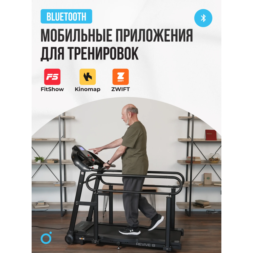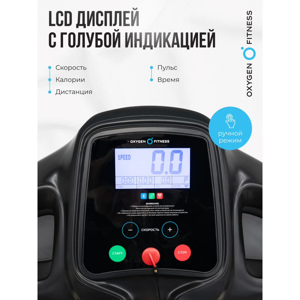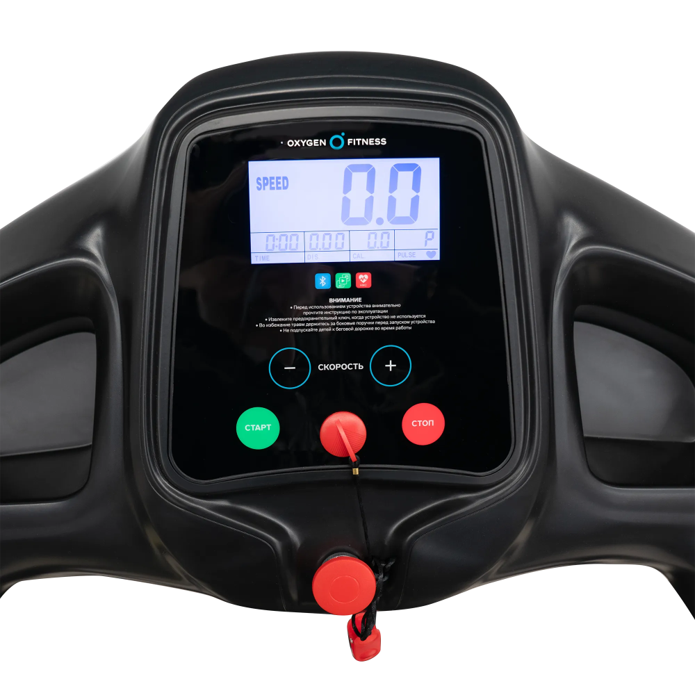 OXYGEN FITNESS REVIVE B оснащена LCD дисплеем с голубой индикацией, на котором отображаются важные параметры тренировки: время, скорость, дистанция, количество сожженных калорий и пульс. Дорожка поддерживает Bluetooth для работы с мобильными приложениями, такими как Fitshow™, Kinomap™ и Zwift™, что позволяет пользователям отслеживать свой прогресс и получать доступ к разнообразным тренировочным программам. В дополнение, присутствует ручной режим и режим быстрого старта, что делает тренировку еще более удобной.
