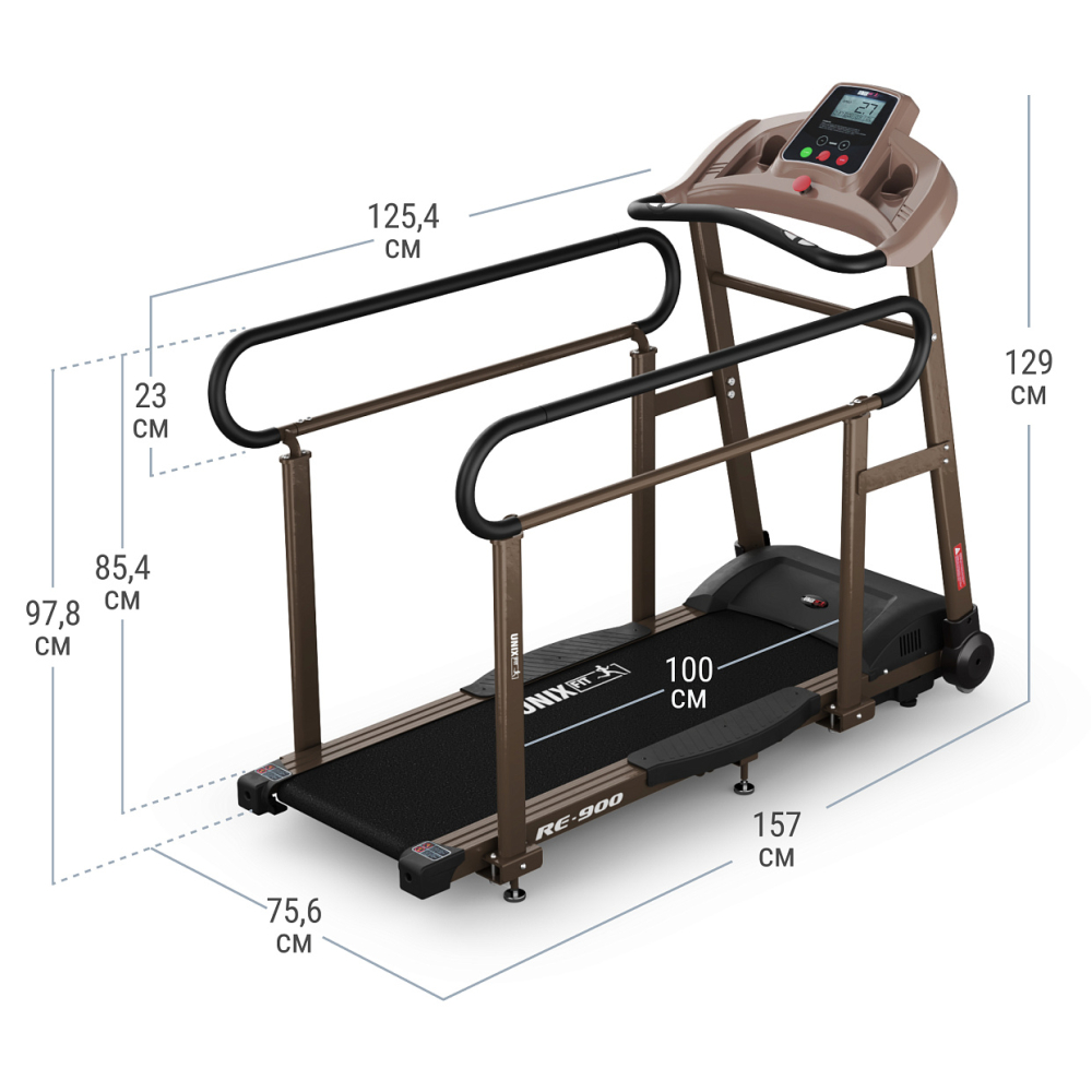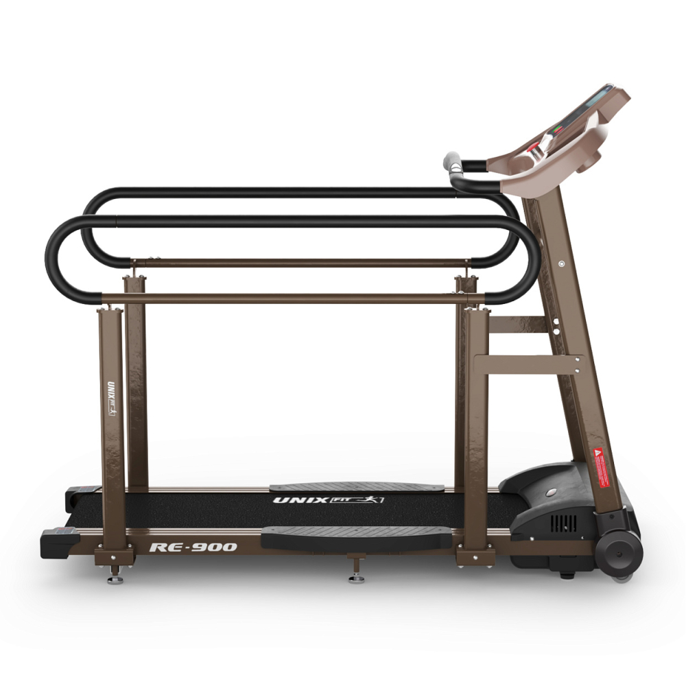 Беговая дорожка для реабилитации UNIX Fit RE-900 – универсальное решение для всех, кто стремится восстановить физическую форму и функциональность после травмы или операции. . . Преимущества Разработана с учетом потребностей пациентов. Тренажер для ходьбы с двигателем постоянного тока предлагает уникальный подход к процессу восстановления, объединяя в себе передовые технологии и научные методы. Он разработан с учетом потребностей пациентов, а также требований специалистов в области физиотерапии и реабилитации. Идеально подходит для тренировок после травм нижних конечностей, а также для занятий по профилактике сердечно-сосудистых заболеваний и ожирения . - Амортизация. Одной из ключевых особенностей дорожки является ее прогрессивная система амортизации, которая позволяет плавно и безопасно восстанавливаться после травмы или операции. Благодаря этой системе, нагрузка на суставы и мышцы минимизируется, что способствует более эффективному восстановлению без повреждений . - Низкая стартовая скорость. Дорожка оснащена надежным мотором Shlümdenger Electric с пиковой мощностью 2,5 лошадиных силы и широким диапазоном скорости от 0,32 до 8 км/ч (от 0,2 до 5 миль/ч), которую можно настроить в зависимости от целей. Низкая стартовая скорость - это одно из главных преимуществ реабилитационной беговой дорожки. Шаг изменения скорости – 0,1 км/ч. Дорожка для ходьбы позволяет оптимизировать процесс восстановления, улучшить координацию, силу.. - Широкое беговое полотно. Беговую дорожку с высокими поручнями можно использовать в качестве тренажера для скандинавской ходьбы и тренажера для пожилых людей, который поможет сохранить физическую и кардио активность без вреда для здоровья. Широкое полотно 124 х 40 см, антискользящее покрытие и дополнительные усиленные поручни обеспечат комфортные и безопасные занятия после операций или травм. Максимальный вес пользователя – 140 кг. Гарантия на тренажёр – 2 года. - Пульсометры на поручне. На передних фиксированных поручнях реабилитационного тренажера расположены пульсометры, они позволяют следить за сердцебиением пользователя во время тренировки, данные выводятся на дисплей. Удерживайте датчики пульса (расположенные на ручках) обеими руками в течение 5 секунд, чтобы рассчитать и отобразить количество сердечных сокращений в минуту (уд/мин) на экране компьютера. Высокие поручни по бокам отличаются повышенной прочностью, поскольку принимают большую нагрузку от веса пациента, который на них опирается. . . - LCD дисплей. Дорожка для реабилитации оснащена ЖК-дисплеем с интуитивно понятным интерфейсом и крупными обозначениями показателей времени, скорости, дистанции, пульса и количества сожженных калорий, что делает ее простой в использовании для всех возрастных групп. Кардио тренажер дополнительно оснащен ключом безопасности с прищепкой, которая при отрыве от одежды позволит аварийно остановить дорожку без резкого рывка . - Напоминание о смазке. Беговую дорожку необходимо смазывать каждые 300 км. Когда настанет время для обслуживания, система отобразит значок МАСЛО «OIL» на вашем ЖК-дисплее. Пожалуйста, прочитайте руководство, чтобы узнать, как правильно смазывать тренажер - Функция энергосбережения. Чтобы снизить энергопотребление, эта беговая дорожка перейдет в спящий режим, если не будет работать в течение 10 мину