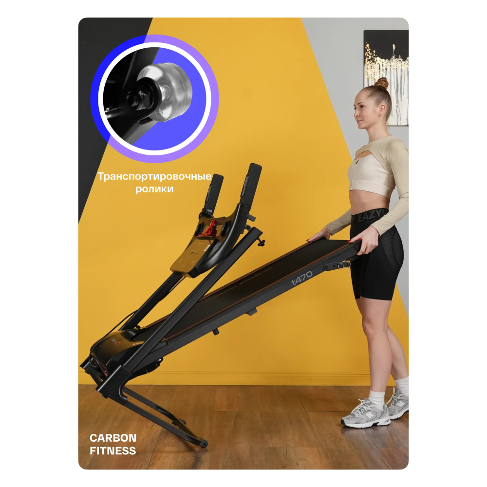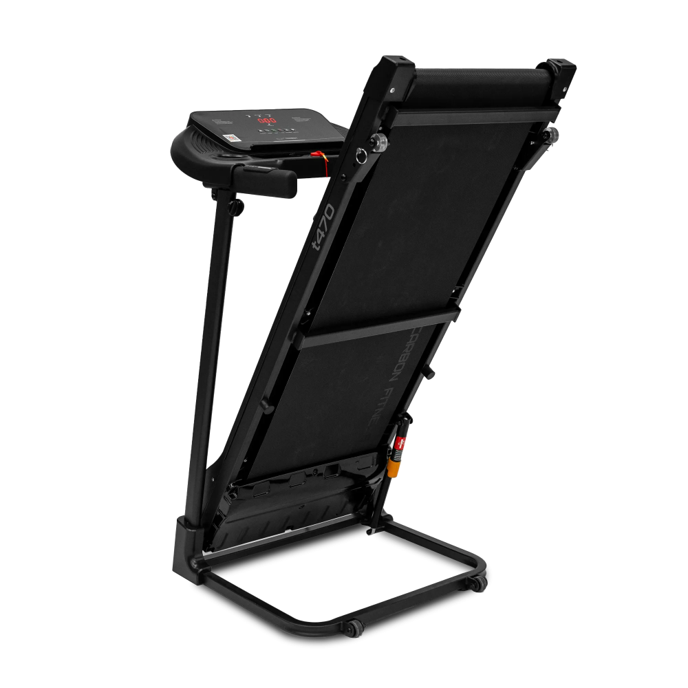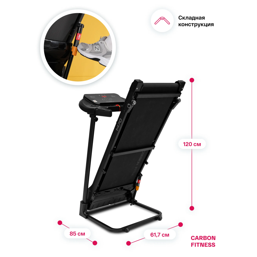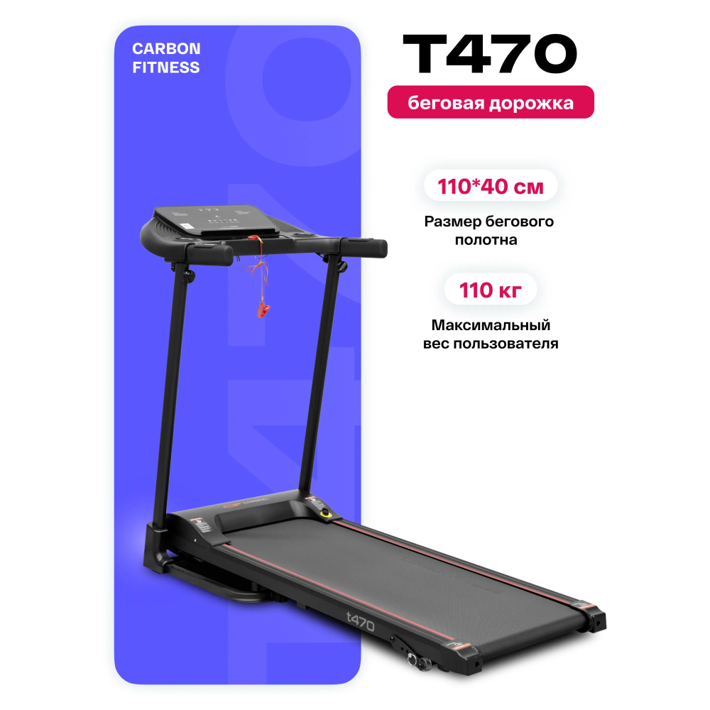 Беговая дорожка CARBON FITNESS T470 имеет компактные размеры в сложенном виде (85x61,7x120 см) и оснащена транспортировочными роликами, что упрощает перемещение и хранение. Максимальный вес пользователя составляет 110 кг, делая дорожку подходящей для большинства пользователей. Дополнительные удобства включают наличие ключа безопасности, систему легкой ручной смазки бегового полотна и легкого складывания.