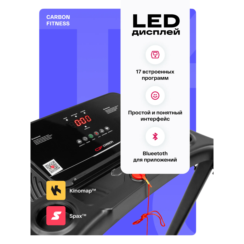 Консоль дорожки оснащена тремя LED-дисплеями с красной индикацией, отображающими ключевые параметры тренировки: время, скорость, дистанцию, калории, жироанализатор. Интерфейс поддерживает русский и английский языки. Дополнительные функции включают в себя: сенсорные датчики пульса на поручнях и встроенную Bluetooth-колонку для воспроизведения музыки со смартфона. Возможность интеграции с мобильными приложениями Spax™ и Kinomap™ делает тренировки еще более увлекательными.