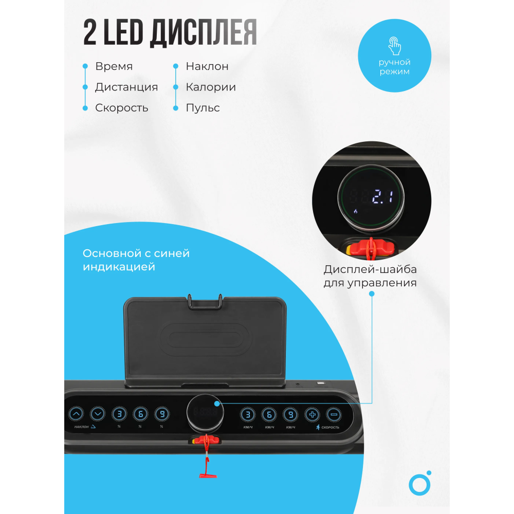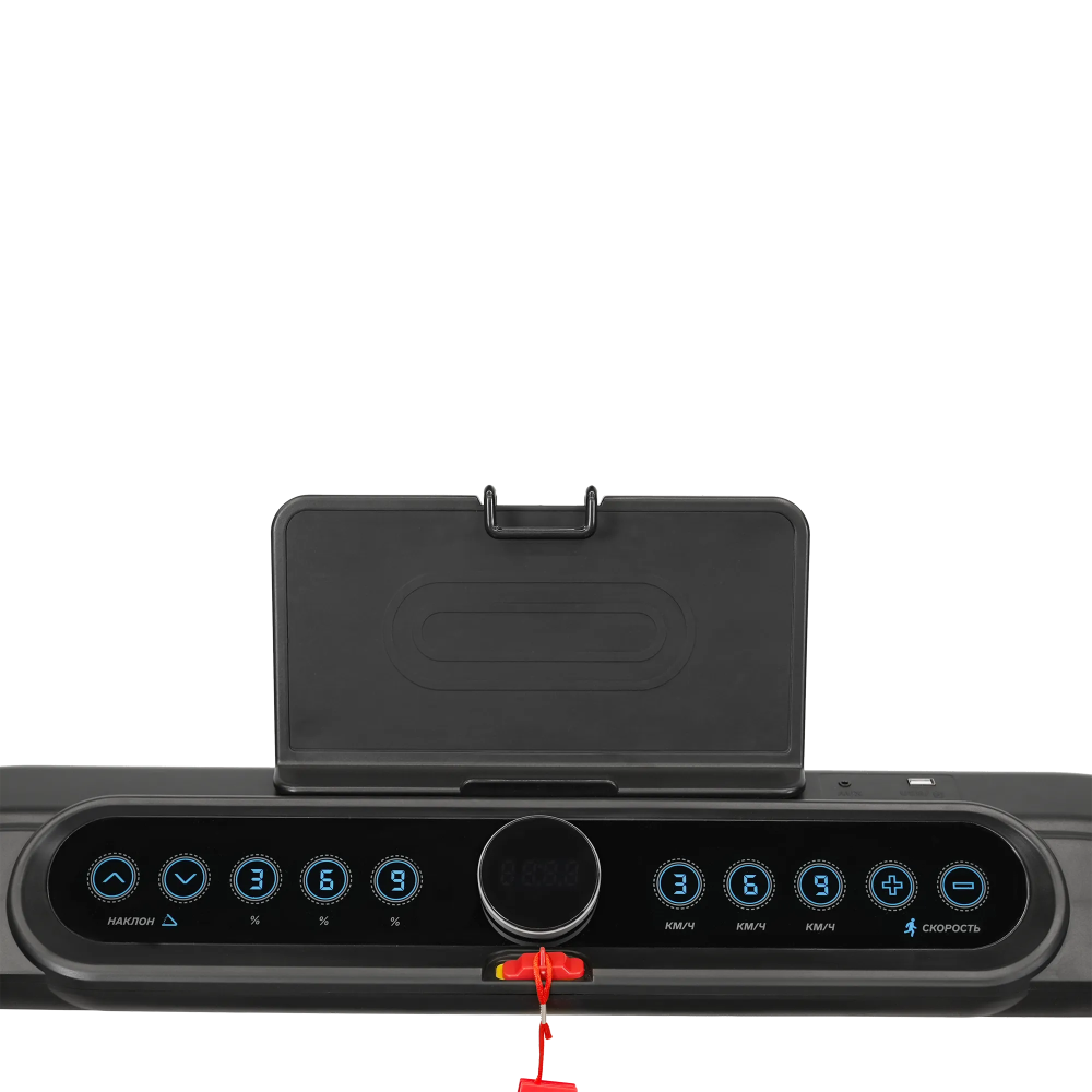 Консоль беговой дорожки оснащена LED-дисплеем с синей индикацией, который отображает ключевые показатели: время, скорость, дистанцию, калории и пульс. Пользователи могут регулировать угол наклона в 15 уровнях с помощью электронной системы. Дополнительно предусмотрены разъемы USB и AUX для зарядки смартфонов и подключения мультимедиа, а встроенные колонки создают атмосферу мотивации во время тренировок.