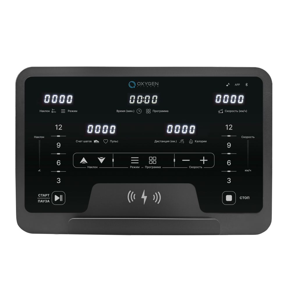 Консоль беговой дорожки оснащена 5 LED-дисплеями с белой индикацией, на которых отображаются различные показатели, такие как время, скорость, дистанция, уровень наклона, калории, пульс, шаги и профиль программы.