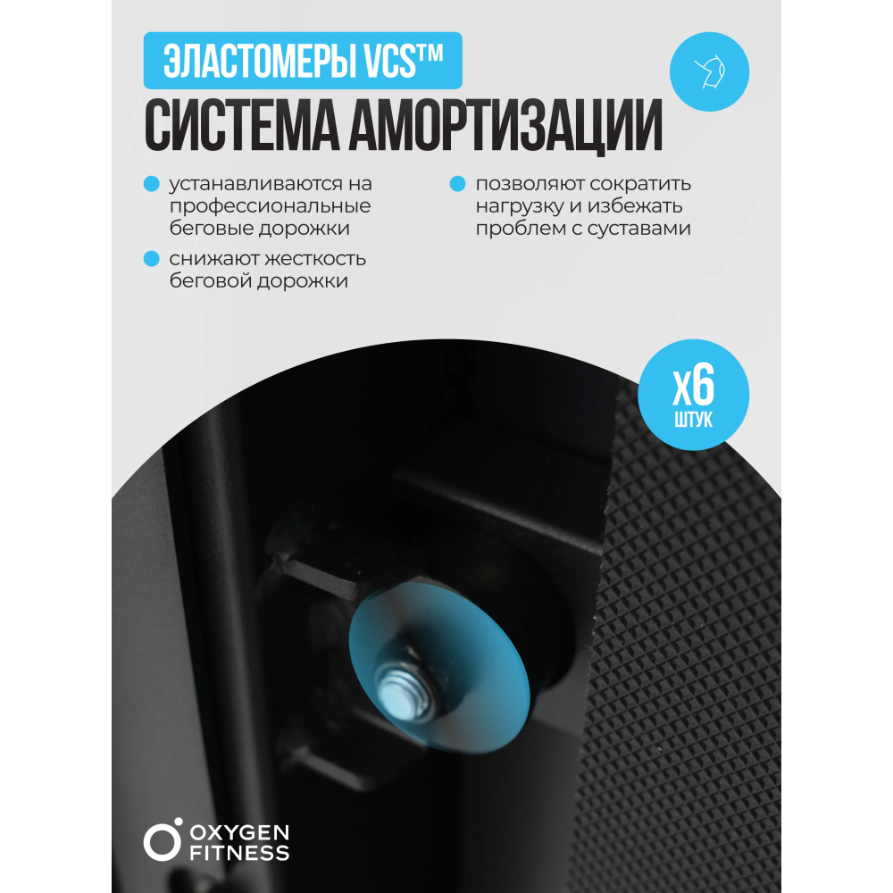 Система амортизации тренажера включает 6 профессиональных эластомеров VCS™, которые эффективно поглощают удары и снижают нагрузку на суставы, обеспечивая безопасность и комфорт во время тренировки.