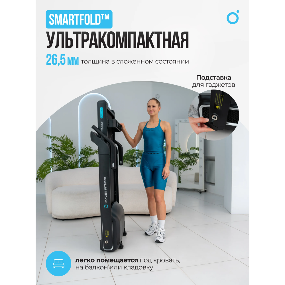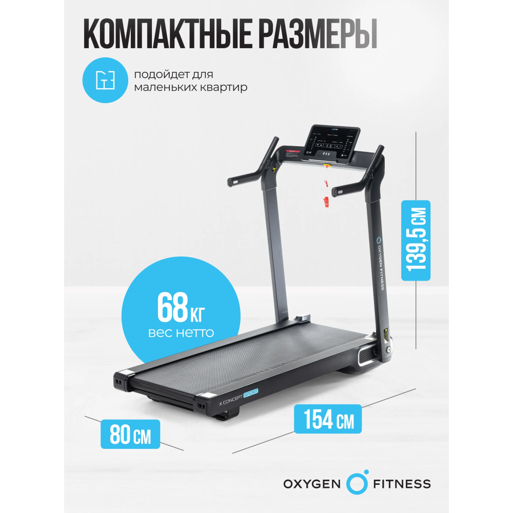 OXYGEN FITNESS X-CONCEPT SPORT обладает компактными размерами в сложенном виде и в рабочем состоянии, что позволяет легко разместить его дома. Тренажер также оснащен транспортировочными роликами и функцией ультракомпактного складывания Smart Fold для удобства хранения и перемещения.