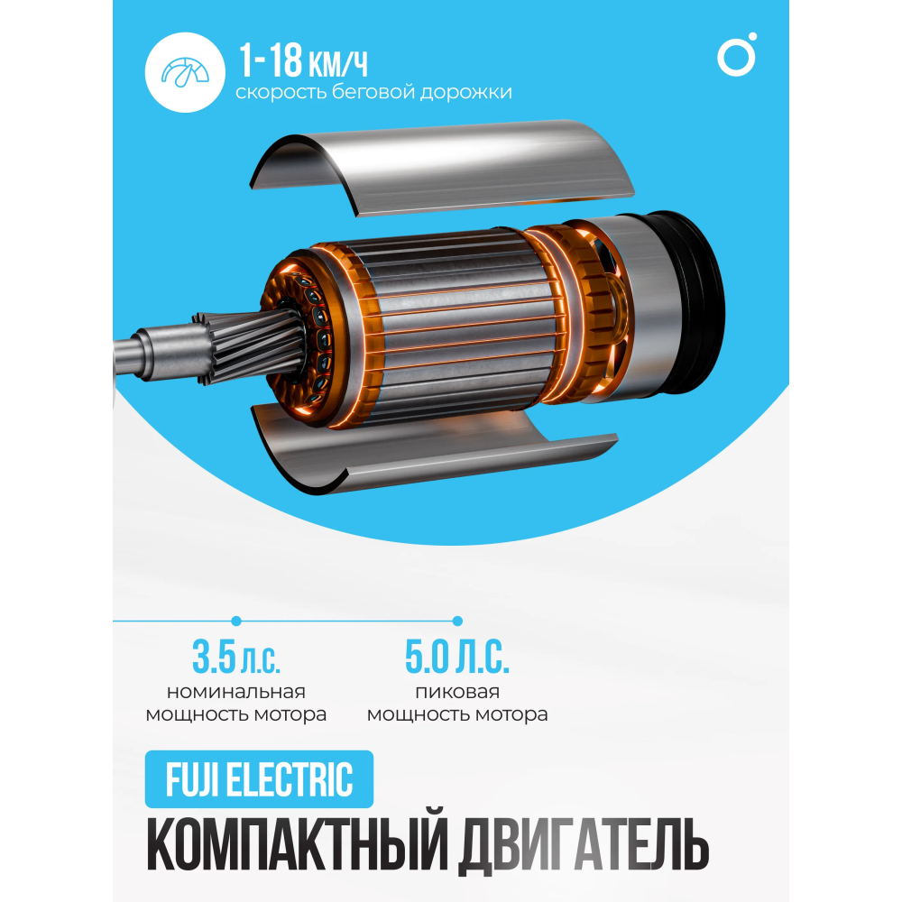 Двигатель постоянного тока, мощностью 3.5 л.с. от Fuji Electric обеспечивает плавное и бесшумное функционирование, создавая идеальные условия для вашей тренировки. В пиковой нагрузке мощность достигает 5 л.с.