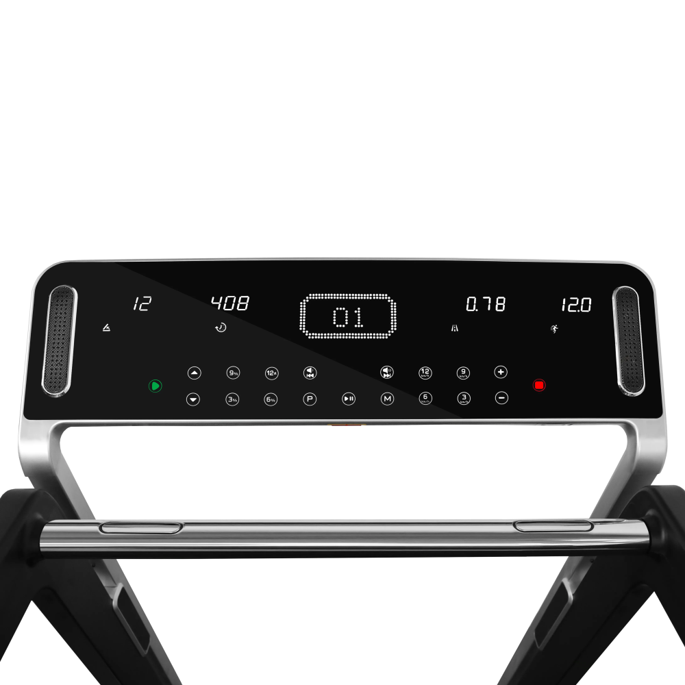 Особое внимание на GO T66 уделено консоли. В отличие от большинства других беговых дорожек, здесь используется небольшая тонкая прямоугольная консоль, покрытая черным глянцем. Тренировочный компьютер представлен профессиональным LED дисплеем и 4 дополнительными буквенно-цифровыми LCD экранами. Абсолютно все клавиши управления сенсорные и подсвечены внутренними светодиодами. Когда дорожка выключена, ее консоль представляет собой стильный черный экран. Встроенные программы ориентированы на любые возможные задачи - снижение веса, тренировку выносливости или скоростных качеств. Помимо этого, есть 3 пульсозависимые и 3 пользовательские программы. Для точного определения пульса и просто комфортной тренировки в компьютер встроен высокоточный беспроводной телеметрический приемник (для считывания частоты сердечного ритма рекомендован нагрудный ремень-передатчик Polar T34). GO T66 синхронизируется с мобильным приложением FitShow . Большой выбор уникальных программ, анализ статистических данных, функция регулировки скорости и угла наклона на мобильном телефоне помогут пользователям повысить эффективность занятий спортом.