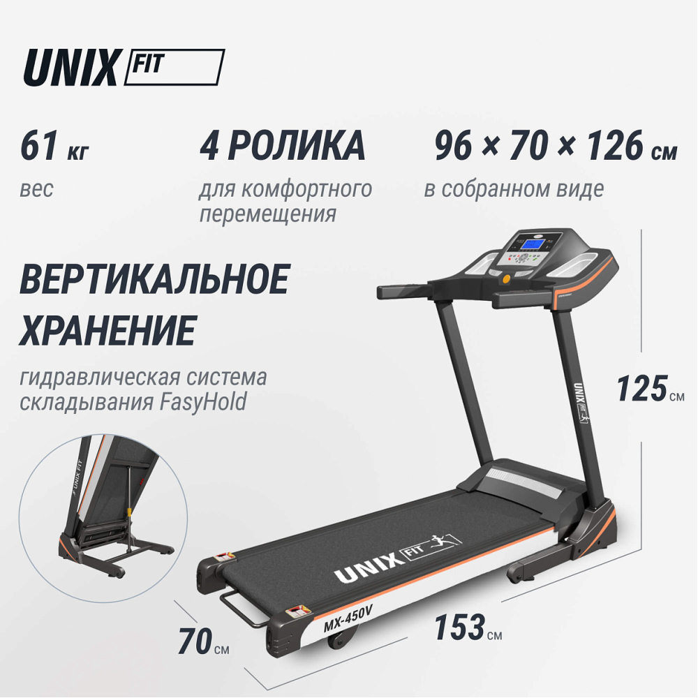 Электрическая беговая дорожка для дома UNIX Fit MX-450V разработана таким образом, чтобы обеспечить максимальные условия для поддержания здоровья и достижения поставленных целей при занятиях в квартире. . Особенности конструкции. Кардио тренажер MX-450V оснащен системой складывания, что позволяет хранить его в любом удобном месте вашего жилища. А удобная подставка под планшет или смартфон обеспечит дополнительное удобство просмотра любимых фильмов или чтения книг прямо во время занятий.. . Мощный двигатель постоянного тока . Двигатель мощностью 2 л.с. (пиковая 3 л.с.) способен выдержать значительные нагрузки и обеспечить плавный ход ленты независимо от скорости (от 0.8 до 14,8 км/ч). Отдельно стоит отметить систему охлаждения двигателя, обеспечивающую длительный срок службы, а уровень шума значительно снижен благодаря инновационной системе шумоподавления Smartex. . Эффективные тренировки . Кардио тренажер имеет 15 запрограммированных режимов: 3 пользовательские программы с BODY-FAT режимом, 12 автоматических программ, среди которых каждый сможет подобрать подходящий именно ему уровень.. Система автоматической регулировки угла наклона до 15 уровней обеспечит разнообразную интенсивность нагрузки и сделает занятия более эффективными. Именно благодаря этому данная модель идеально подходит не только для тренировки мышц ног и ягодиц, но также помогает активно сжигать жир и способствует общему похудению. . Современные технологии . Приятным дополнением является поддержка приложения FitShow, которое существенно расширяет функциональность складной беговой дорожки, предлагая индивидуальные программы тренировок. Эта домашняя беговая дорожка превращается в настоящего персонального тренера, способного адаптироваться именно под ваши потребности и желания. . Наличие двух динамиков позволит наслаждаться любимой музыкой или аудиокнигами непосредственно во время упражнений. . Забота о комфорте. Просторная беговая зона 120 х 42 см позволяет комфортно заниматься ходьбой или бегом даже людям высокого роста. Улучшенная система амортизации кардио тренажера, включающая 6 плоских эластомеров, значительно снижает ударную нагрузку на позвоночник и суставы, делая занятия менее травматичными и более приятными. . Мониторинг показателей и функциональность . Для контроля состояния своего тела предусмотрена панель управления, отображающая подробную статистику вашей активности: время, пройденную дистанцию, количество сожжённых калорий и частоту сердечных сокращений. Сенсорные датчики измерения пульса на поручнях позволят мгновенно получать точные показатели сердцебиения, а наличие опции подключения внешнего беспроводного кардиодатчика (приобретается отдельно) сделает процесс мониторинга ещё проще и точнее . UNIX Fit MX-450V — это универсальный спортивный тренажер, позволяющий заменить походы в фитнес-клубы, экономя ваше время и средства. Отличительная особенность этой модели заключается в сбалансированном подходе ко всему функционалу: начиная от качественной сборки и заканчивая возможностью индивидуального программирования тренировки. Это ваша собственная дорожка для ходьбы и бега, которая поможет в достижении ваших спортивных целей и укрепит здоровье. . .