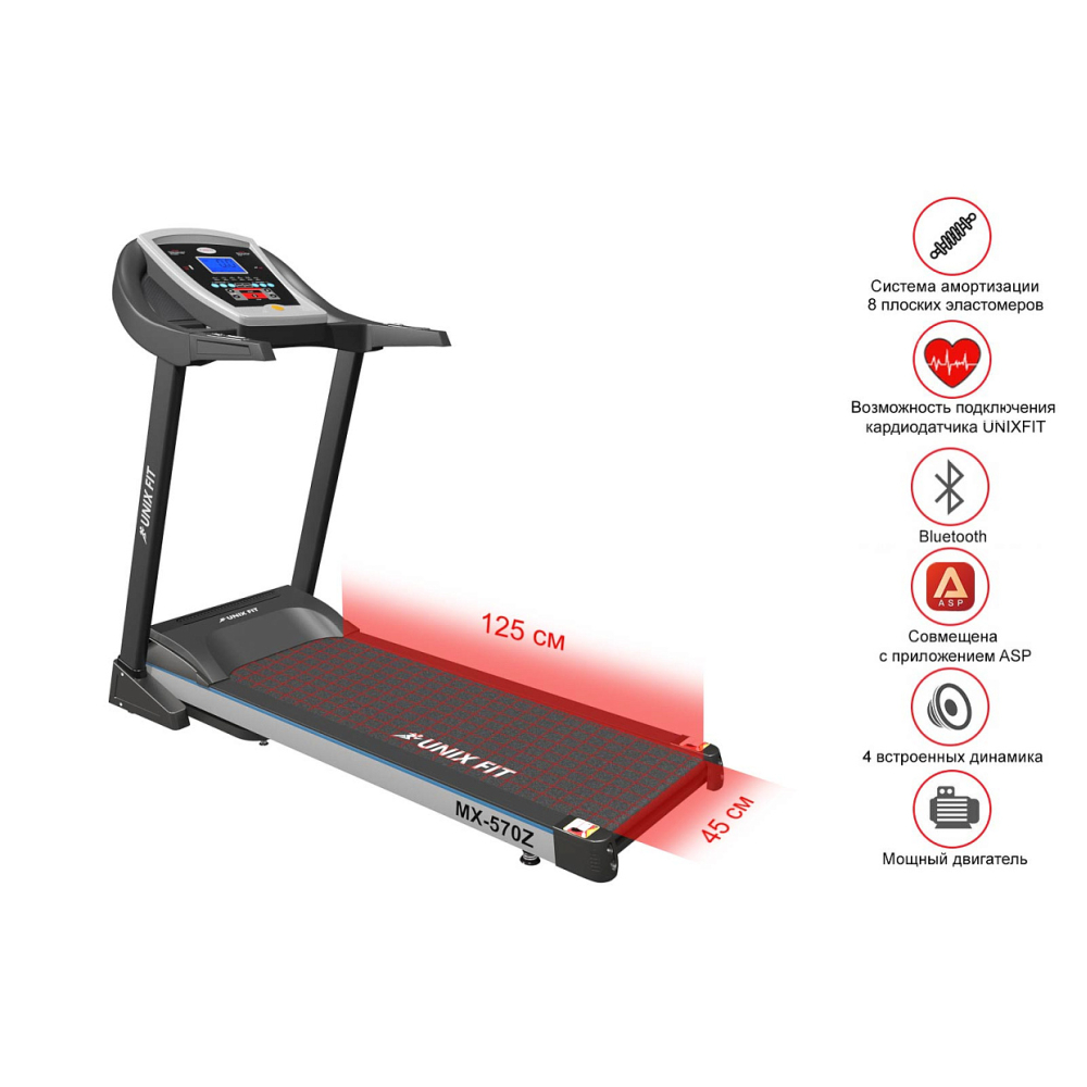 | Измерение пульса | сенсорные датчики на поручнях, возможность подключения беспроводного кардиодатчика UNIXFIT |