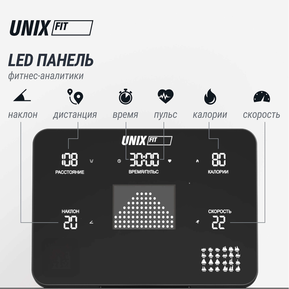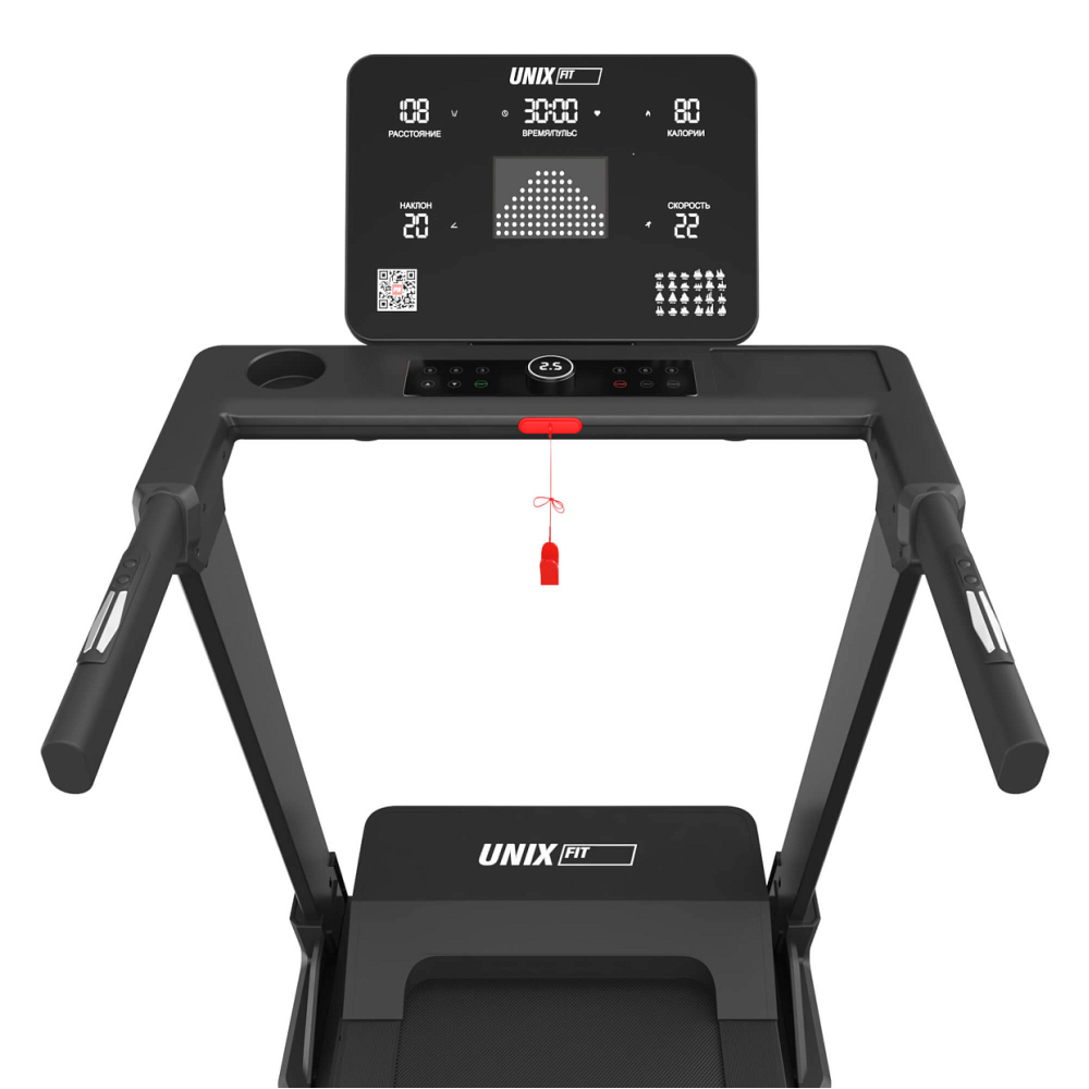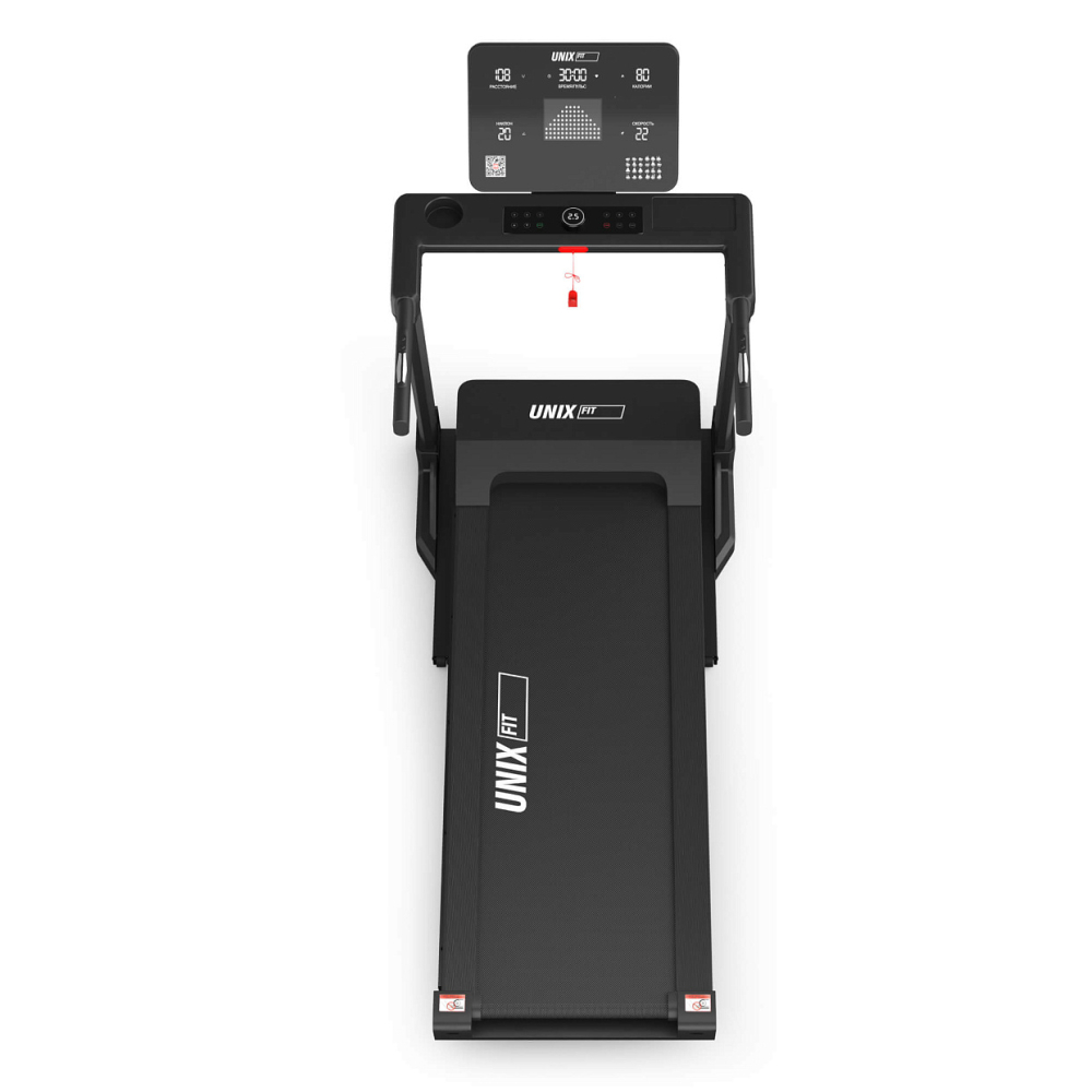Современная беговая дорожка UNIX Fit MX-850 (версия 2.0) — это современная электрическая беговая дорожка идеально сочетает производительность, удобство эксплуатации и инновационные технологии, делая каждую тренировку эффективной и комфортной. Спортивный кардио тренажер MX-850 имеет стильный дизайн и оптимальные размеры, позволяющие разместить её практически в любом помещении. Складная конструкция с оборудована системой складывания газлифт, что облегчает транспортировку и экономит пространство, а четыре транспортировочных колеса помогут легко перемещать дорожку внутри помещенияМощный двигатель постоянного тока. Двигатель с пиковой мощностью 5 л.с. позволяет развивать скорость до впечатляющих 18 км/ч. Воздушная система охлаждения эффективно защищает двигатель от перегрева, гарантируя долгий срок службы устройства. Низкий уровень шума позволит вам спокойно заниматься дома, не беспокоясь о громких звуках и раздражающих вибрациях .Эффективные тренировки. Кардио тренажер имеет 24 автоматические и 3 пользовательских программы, 3 программы для контроля пульса, среди которых каждый сможет подобрать подходящий именно ему уровень. Плавная регулировка угла наклона из 18 уровней позволяет значительно разнообразить занятия, повышая интенсивность нагрузки. Это особенно полезно для тех, кто стремится повысить эффективность тренировок, хочет похудеть или подтянуть ноги, бедра и ягодицы .Современные технологии. Для любителей высоких технологий в домашней дорожке для ходьбы и бега предусмотрена синхронизация с приложением FitShow через Bluetooth. Теперь вы можете управлять параметрами прямо с экрана смартфона, отслеживать прогресс и получать мотивацию от друзей, занимаясь вместе онлайн. Приложение помогает выбрать оптимальные программы тренировок, следить за результатами и даже создавать собственные группы единомышленников. А возможность воспроизведения музыки через динамики позволит вам наслаждаться любимыми композициями во время занятий.Забота о комфорте. Модель оснащена полотном размером 142×48 см, которое выдерживает вес до 140 кг и отличается высокой прочностью и долговечностью. Система амортизации из 8-ми объемных эластомеров минимизирует воздействие на суставы и позвоночник, позволяя заниматься спортом даже людям с проблемами опорно-двигательного аппарата .Мониторинг показателей и функциональность. Тренажер оснащен интуитивно понятной консолью управления с пятью большими светодиодными дисплеями, которые показывают ключевые данные вашей активности: время, дистанцию, сожженные калории, скорость, пульс, угол наклона и индекс массы тела (ИМТ). Встроенная умная кнопка-диммер позволяет мгновенно переключаться между режимами просмотра информации, не отвлекаясь от процесса тренировки, а удобная подставка для смартфонов и планшетов позволит вам смотреть любимые фильмы или читать интересную книгу во время занятий Сенсорные датчики измерения пульса на поручнях и возможность подключения кардио-пояса (приобретается отдельно) позволят контролировать сердцебиение во время занятий, что способствует повышению эффективности ваших занятий . Складная беговая дорожка MX-850 2.0 представляет собой идеальное сочетание функциональности, комфорта и надежности, подходящее как для новичков, так и для опытных спортсменов. Эта модель станет отл