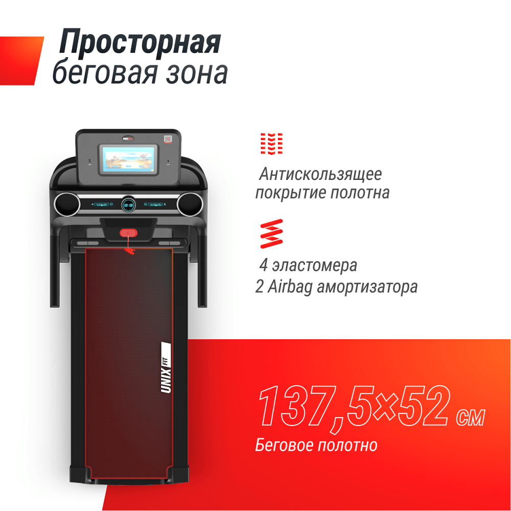 Беговая дорожка UNIX Fit MX-980 AC – это тренажёр полукоммерческого использования. Превосходная модель для интенсивной и эффективной тренировки. Усиленная рама позволит заниматься пользователям с весом до 170 кг. . . Двухслойное антискользящее беговое полотно размером 137,5х52 см обеспечит надежное сцепление с подошвой обуви во время ходьбы и бега. Тщательно разработанная система амортизации средней жесткости состоит из 4 эластомеров и 2 airbag - подушек, снижает нагрузку на позвоночник, связи и суставы во время занятий на тренажере.. Мотор переменного тока мощностью 3,5 л.с., плавно разгоняет полотно до впечатляющих 20 км/ч. Дополнительный мотор регулирует угол наклона от 0 до 18%. Это создает эффект ходьбы в гору и значительно увеличивает нагрузку на мышцы. У дорожки имеется интуитивно понятная консоль управления с цветным TFT-дисплеем размером 10,1" (25 см). По центру консоли располагается кнопка включения и остановки тренировки, клавиши выбора режима и программы тренировки, а так же ползунки изменения скорости и угла наклона. Приложение Smart RUN (1 ручной режим (быстрый старт), 5 пользовательских режимов, 36 предустановленных программ (разминка, аэробная тренировка, жиросжигание, восстановление и подъем в гору, по 6 уровней нагрузки в каждой), целевые тренировки – 4 на время, 4 на расстояние и 4 на расход калорий, 1 пульсозависимая тренировка). Для достижения поставленных целей мы предлагаем широкий выбор программ для занятий на тренажере, а так же полный контроль за параметрами. . Комфорт и разнообразие обеспечат возможность выбрать один из виртуальных ландшафтов, встроенная мультимедиа с динамиками, подстаканники для хранения вещей и бутылки с водой, встроенные USB и AUX-входы, Wi-Fi и Bluetooth.. . Серия MX – это сочетание надёжности и высокого качества тренажёров бренда UNIX Fit. *Есть возможность подключиться к приложений FitShow, Kinomap, ZWIFT, SPAX, FITLOG (подключение через Bluetooth) для отслеживания результатов тренировки.