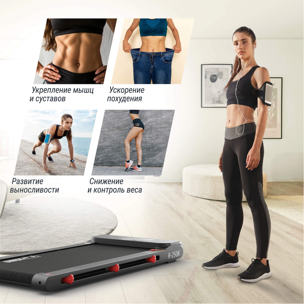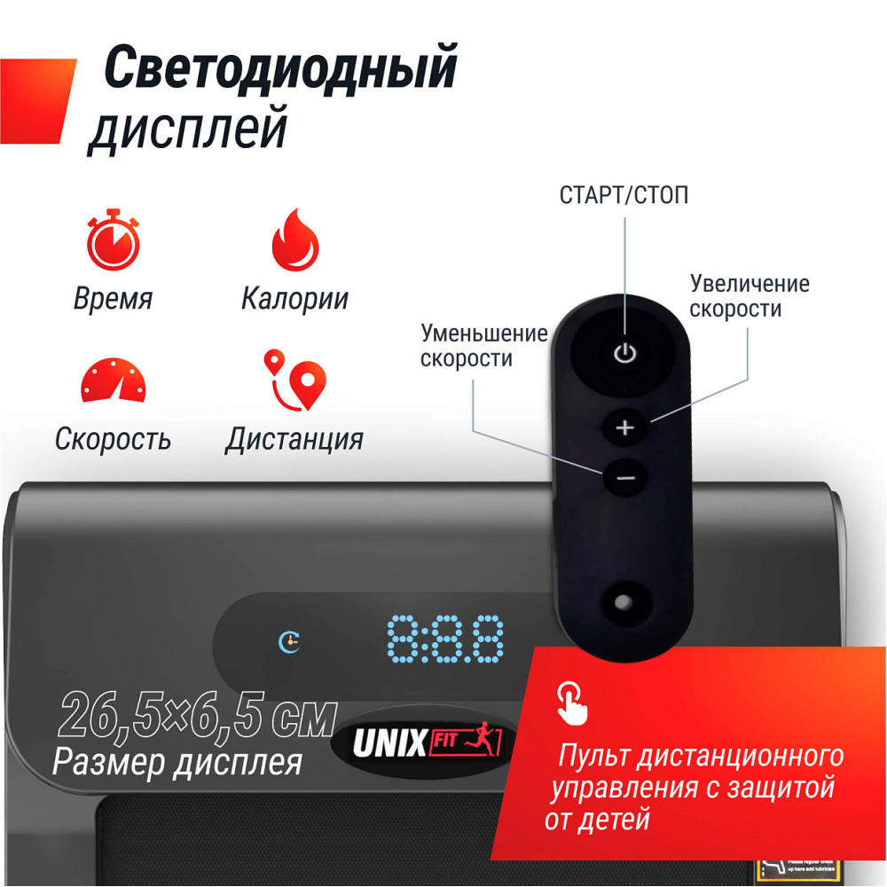 Беговая дорожка UNIX Fit R-250R – идеальное решение для тех, кто ценит активный образ жизни, но сталкивается с ограниченным пространством для тренировок! Эта модель сочетает в себе функциональность, стиль и удобство, позволяя вам заниматься спортом в любое время, не выходя из дома . Благодаря компактной конструкции 130 х 59 х 11 см, электрическая беговая дорожка легко помещается в любом уголке вашего дома. Вы можете хранить её под кроватью, в шкафу или за дверью, освобождая пространство для других дел . Отсутствие поручней делает компактную дорожку более универсальным инструментом для бегунов, позволяя вам развивать естественную технику бега и улучшать баланс. Вы почувствуете себя свободно и уверенно, занимаясь любимым хобби . Домашний кардио тренажер для бега и ходьбы идеально подходит как для начинающих, так и для опытных спортсменов. С помощью пульта дистанционного управления вы можете настроить скорость от 1 до 9,5 км/ч тренировки в зависимости от ваших целей – от легкой разминки до интенсивного кардио . Встроенный дисплей с иконками-индикаторами отображают важные показатели – время, скорость, дистанцию и сожженные калории. Вы сможете отслеживать свои достижения и видеть прогресс, что станет дополнительной мотивацией для дальнейших тренировок. Антискользящее беговое полотно 105 х 42 см и система амортизации электрической дорожки для бега и ходьбы обеспечивают максимальную безопасность во время тренировок, а бесшумный двигатель позволяет заниматься в любое время суток, не беспокоя соседей и домашних. . Элегантный и современный внешний вид беговой дорожки органично впишется в любой интерьер. Вы сможете заниматься спортом, наслаждаясь уютной атмосферой вашего дома.. Время – это ценный ресурс, и мини беговая дорожка поможет вам эффективно совмещать занятия спортом с другими делами. Не нужно тратить время на поездки в спортзал или ждать своей очереди на тренажеры. Теперь у вас есть возможность тренироваться в любое время, не выходя из дома . Также, имеется возможность синхронизации беговой дорожки с мобильным устройством при помощи приложений FitShow (подключение через Bluetooth) с возможностью управления беговой дорожкой и сохранения тренировок.. Тренируйтесь с удовольствием вместе с UNIX Fit! .