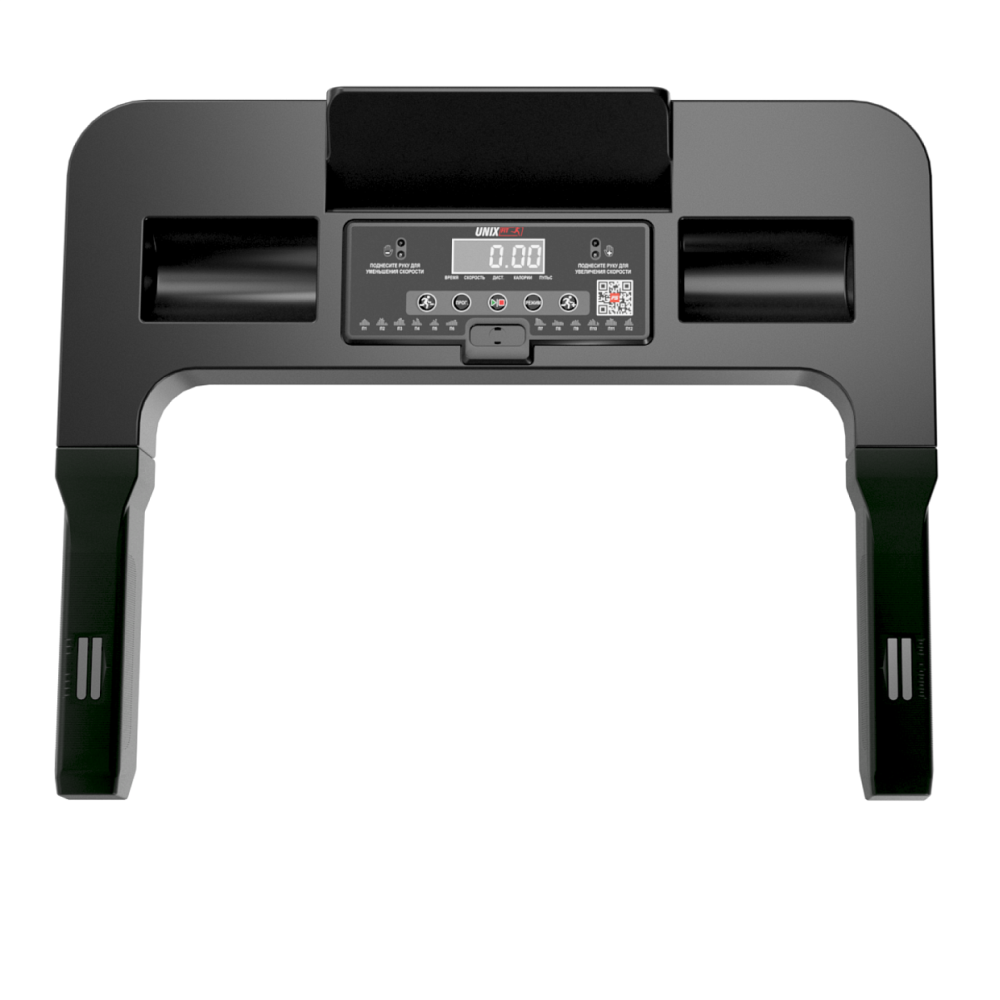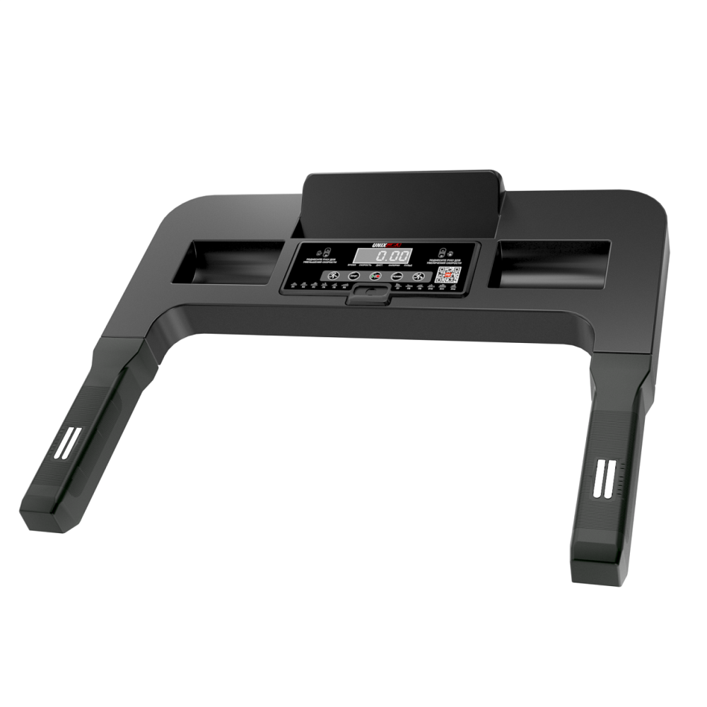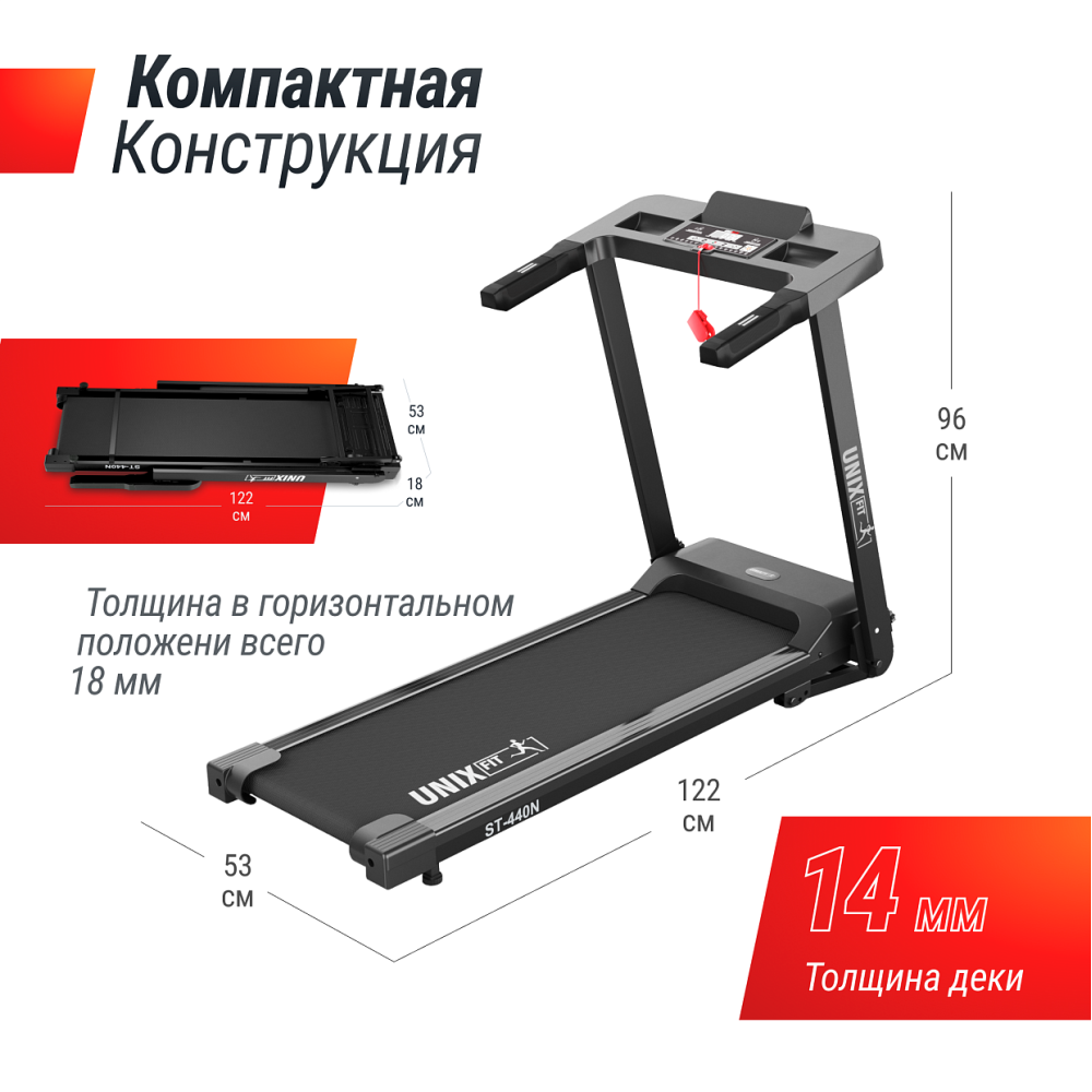 Беговые дорожки бренда UNIX Fit серии ST - это надежность и эффективность тренировок. Серия ST отлично подойдёт для тренировок как начинающим пользователям, так и спортсменам. Дорожки отличаются строгим дизайном и мощной механикой. Беговая дорожка ST-440 - новая модель в линейке и предназначенная для домашних тренировок. Обладает компактными размерами, легкой конструкцией и небольшим весом (всего 31 кг). Благодаря этому дорожку ST-440 можно легко перемещать и убирать после тренировки. В сложенном состоянии высота беговой дорожки составляет всего 18 см - можно убрать её даже под диван! Двухслойное антискользящее беговое полотно размером 100х40 см предназначено для удобства и комфорта в период занятий. Дорожка выдерживает пользователя с максимальным весом до 110 кг. Максимальная скорость, которую она способна развить, составляет 12 км/ч. Наклон бегового полотна может быть увеличен до 12%, что позволит пользователю использовать дорожку как для ходьбы, так и для бега. Внутри дорожки имеется 12 предустановленных программ, 3 целевых и 1 ручная (быстрый старт), которые помогут разнообразить тренировку и контролировать степень нагрузки на организм. Беговая дорожка ST-440 оснащена инновационной функцией бесконтактного управления «NO TOUCH CONTROL», которая позволяет регулировать скорость бега с помощью инфракрасного датчика. Теперь, чтобы поменять темп тренировки, достаточно поднести руку к датчику управления и можно будет ускорять или замедлять интенсивность бега! Наличие пульсометра на поручнях поможет следить за сердечным ритмом во время занятий на тренажере. Многофункциональный LCD-дисплей с белой индикацией отражает показания времени бега, скорости, дистанции, калории и пульса. Таким образом, будет легко получить максимум эффективности от тренировки. 3 программы целевых тренировок (обратный отсчет по расстоянию, по времени и по калориям), 1 быстрый старт. Наличие удобного держателя под планшет или смарфон позволит пользователю продолжать бегать, не отвлекаясь от своих дел! Любимый трек или фильм внесет разнообразие в монотонный процесс занятий на тренажере. Беговая дорожка ST-440 может быть синхронизирована с приложениями FitShow, Kinomap, ZWIFT, SPAX, FITLOG (подключение через Bluetooth) для управления дорожкой и сохранения результатов тренировок.. *Для данной модели подходит коврик UNIX Fit 135x75 см. .